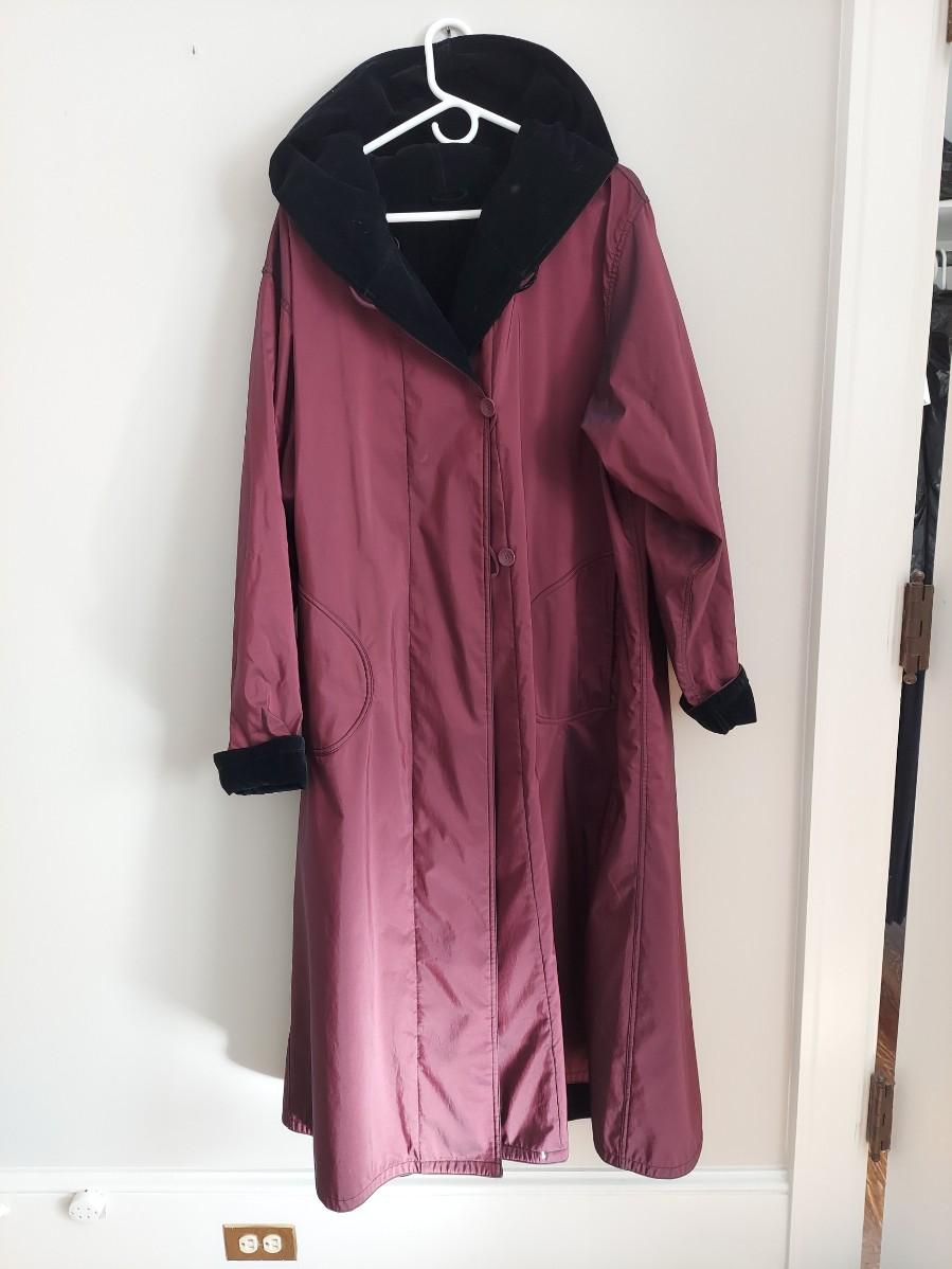 Black wool vintage cape with brown trim. Plus, a Nordstrom duster that is velvet on one side and raincoat on the other. Fully reversible. Please see photos for details. Shipping available