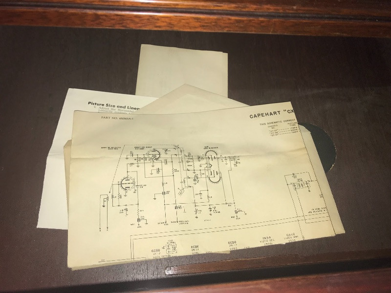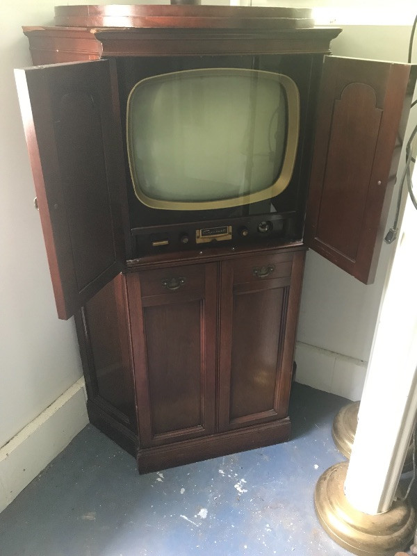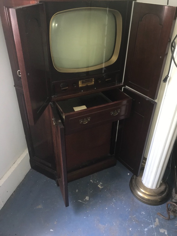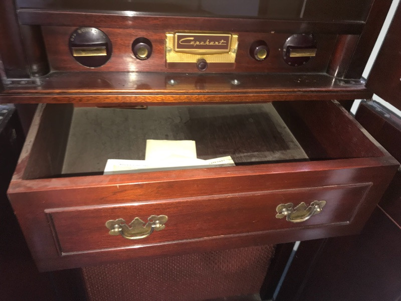 This is a vintage Capehart television with its cabinet. There is a drawer and a cabinet underneath. There is a manual or instructions with the Capehart. There is a piece missing on the top back right corner. The television does not work. This is a beautiful vintage piece.
