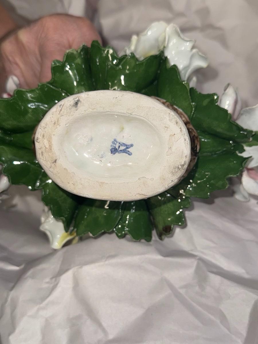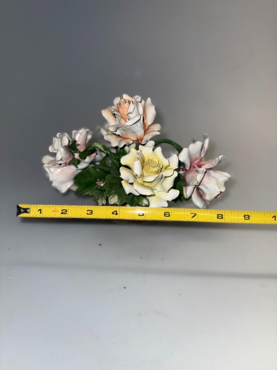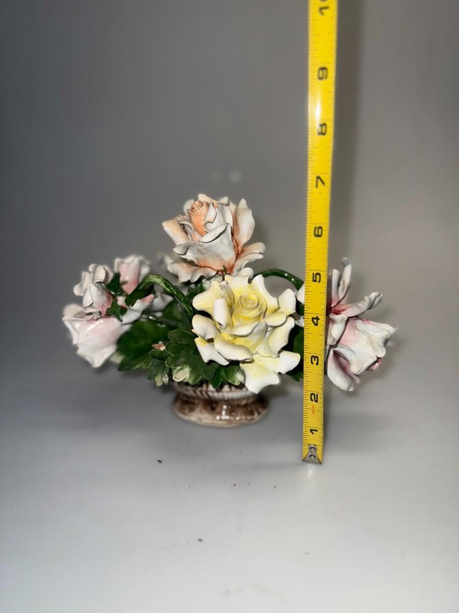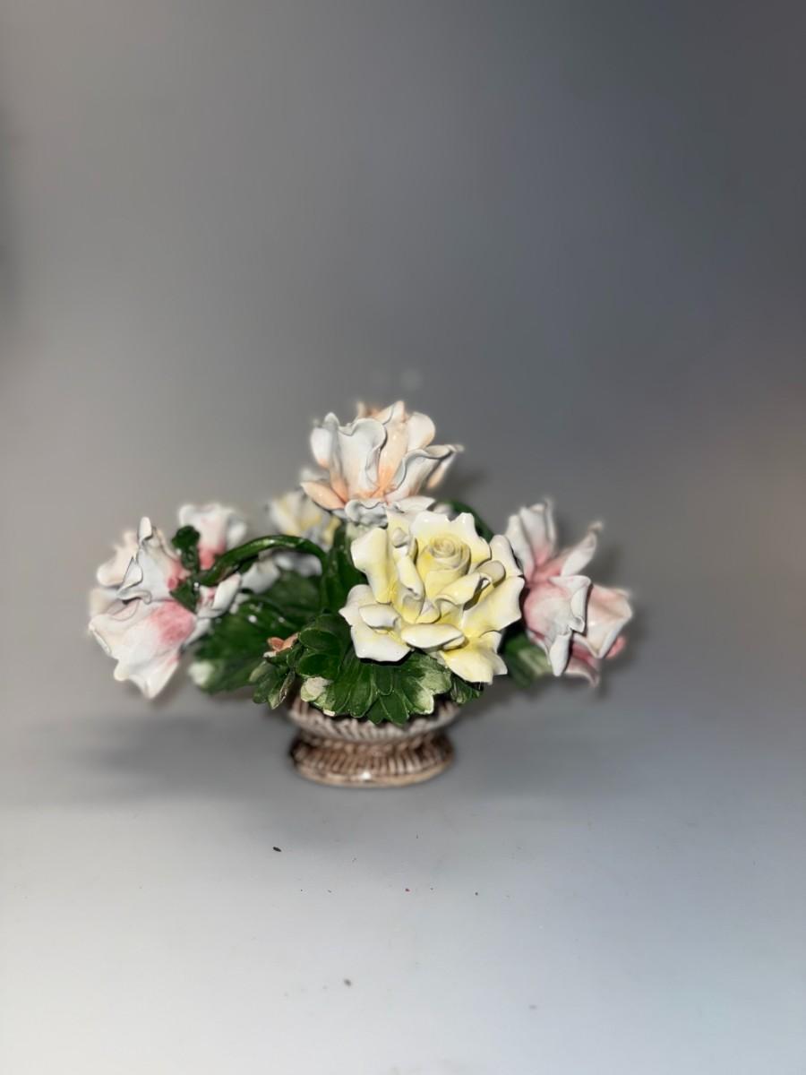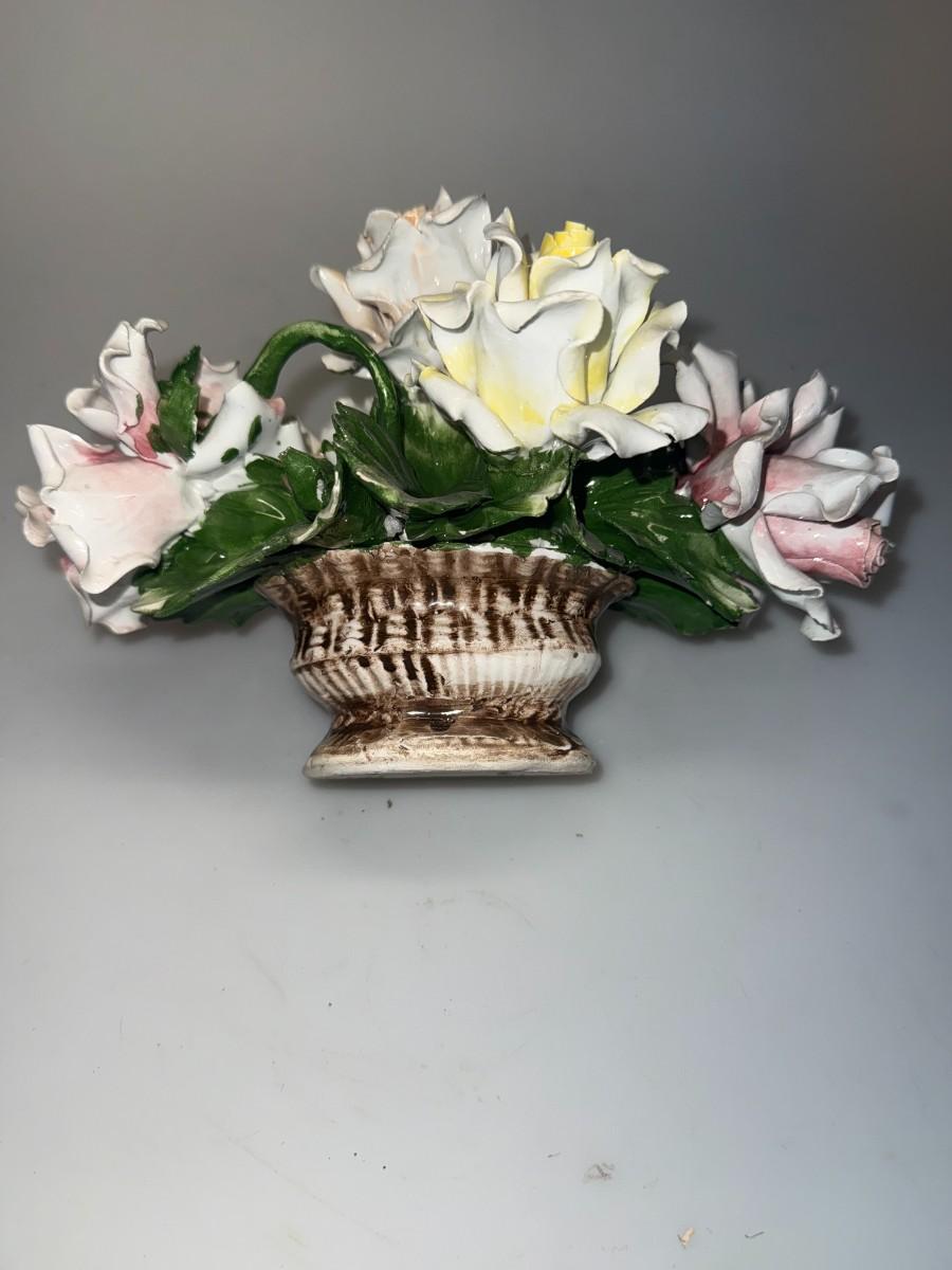 Vintage Capodimonte porcelain flower basket 3 yellow 2 pink roses