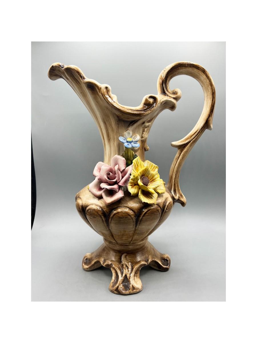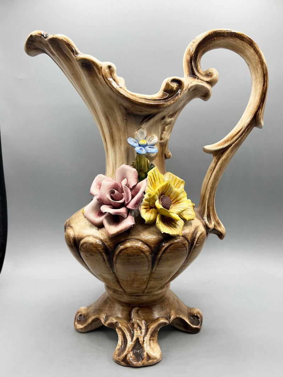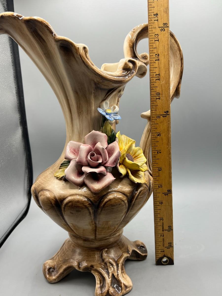 Vintage Capodimonte Porcelain Pottery Art Sun Flower Rose Ornate Decor Pitcher
