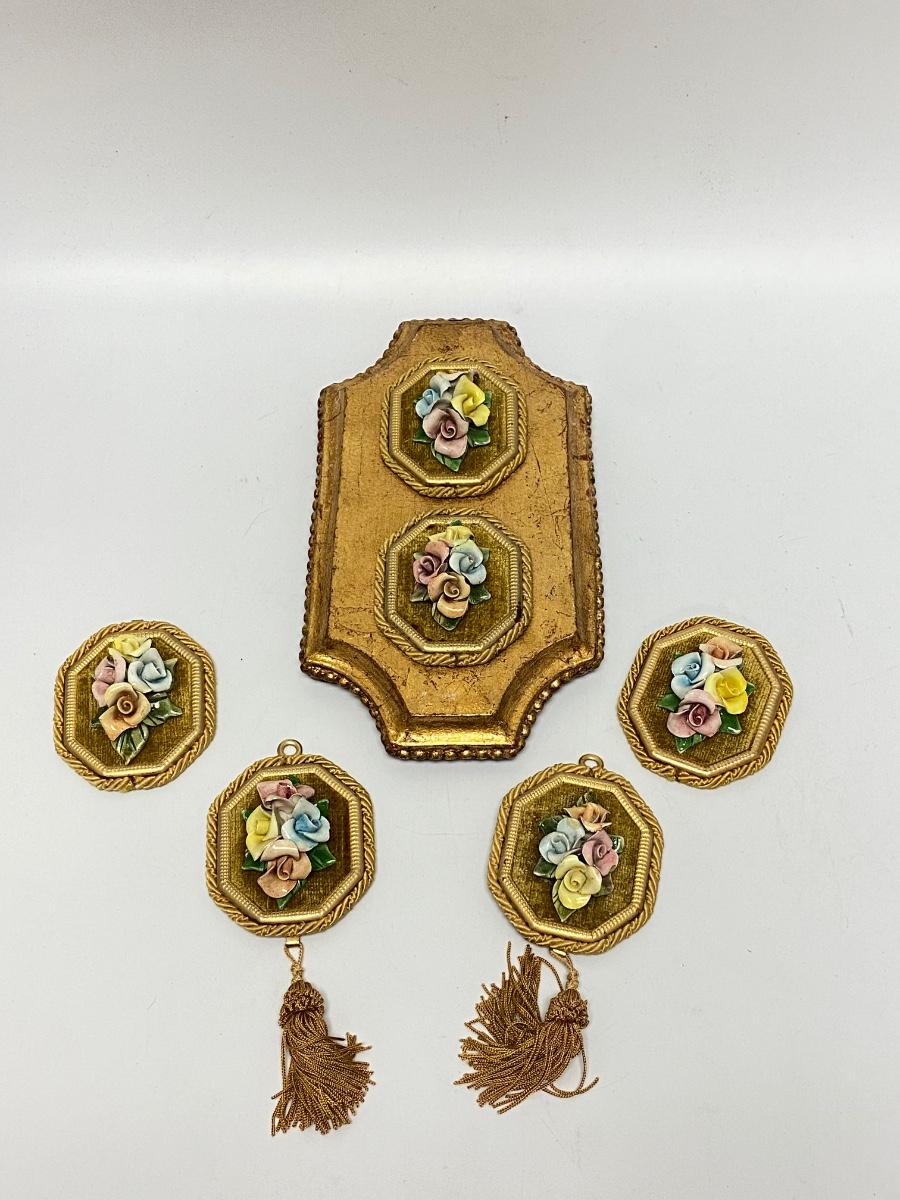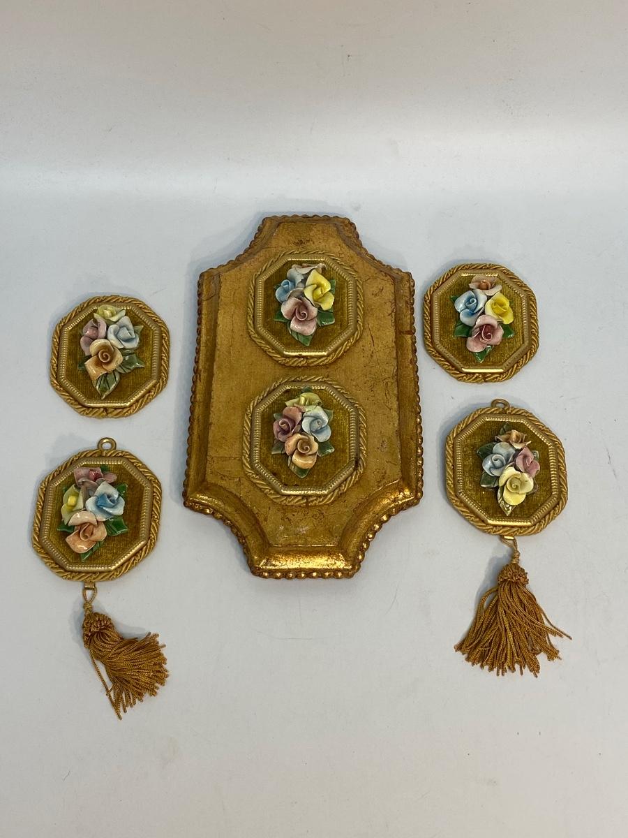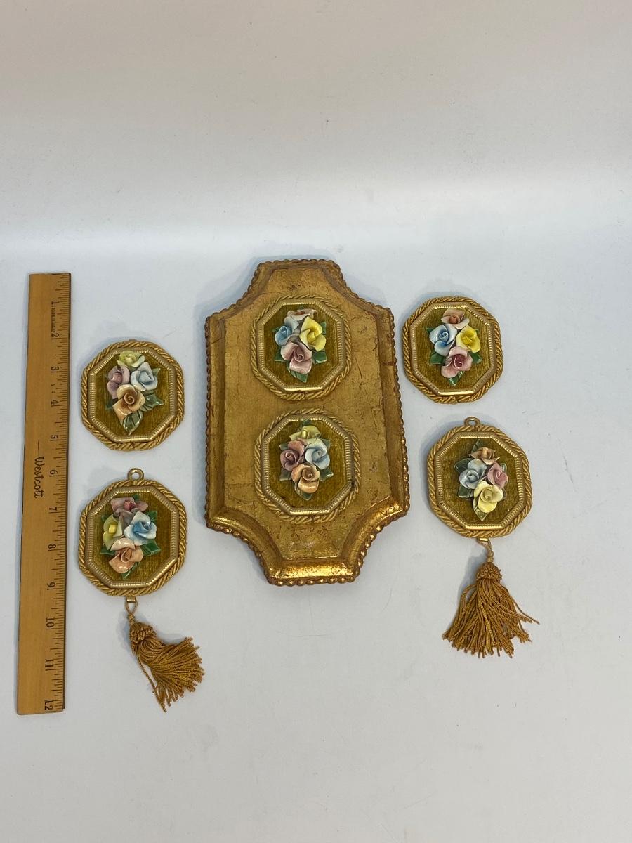 Vintage Capodimonte Style Roses Wall Hanging Medallion Plaques. Two of the small ones are missing the little loops for hanging. Minor chips along flower edges but they display nice. Made in Italy. Not very heavy.
