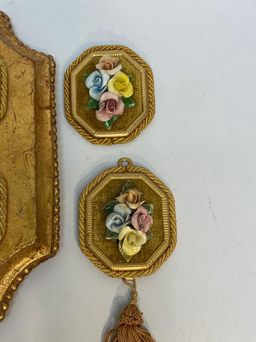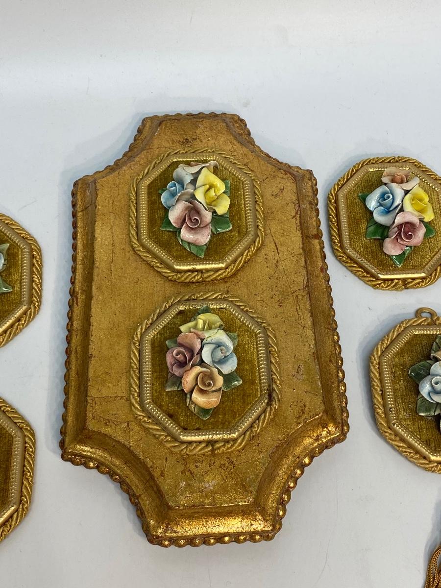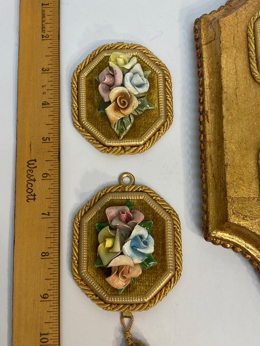 Vintage Capodimonte Style Roses Wall Hanging Medallion Plaques. Two of the small ones are missing the little loops for hanging. Minor chips along flower edges but they display nice. Made in Italy. Not very heavy.
