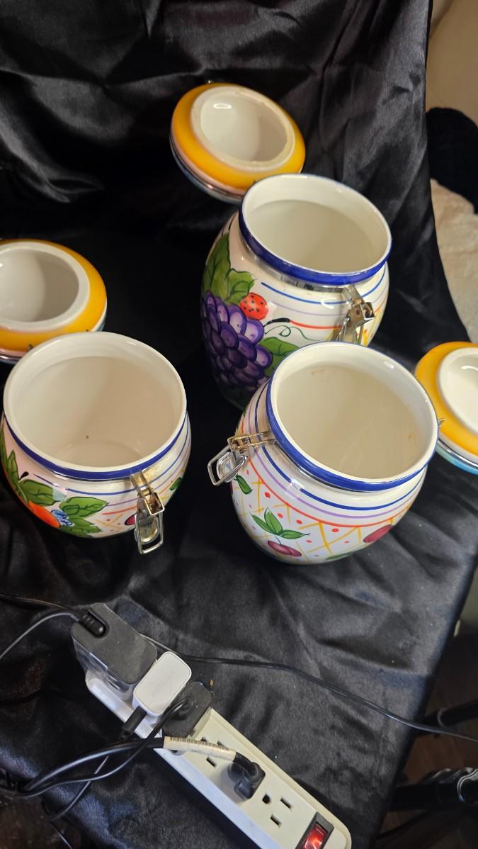 Each jar features a working clamp-top metal closure that seals smoothly, and the interiors are clean and well-kept. Light, age-appropriate crazing appears beneath the glaze, a normal characteristic of Capriware ceramics and a reminder of their handcrafted nature. The set includes three canisters measuring approximately seven, nine, and ten inches tall, offering a perfect graduated display.