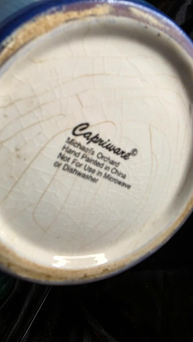 The base mark confirms the line: Capriware, Michael’s Orchard, Hand Painted in China, Not for Microwave or Dishwasher Use.