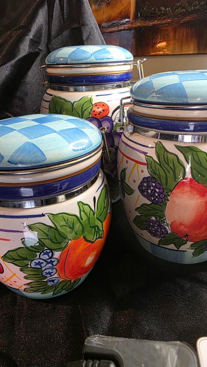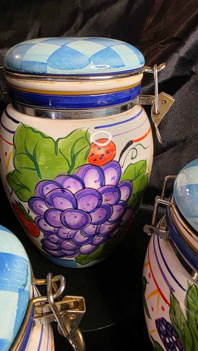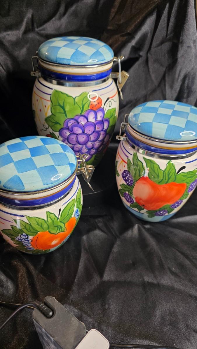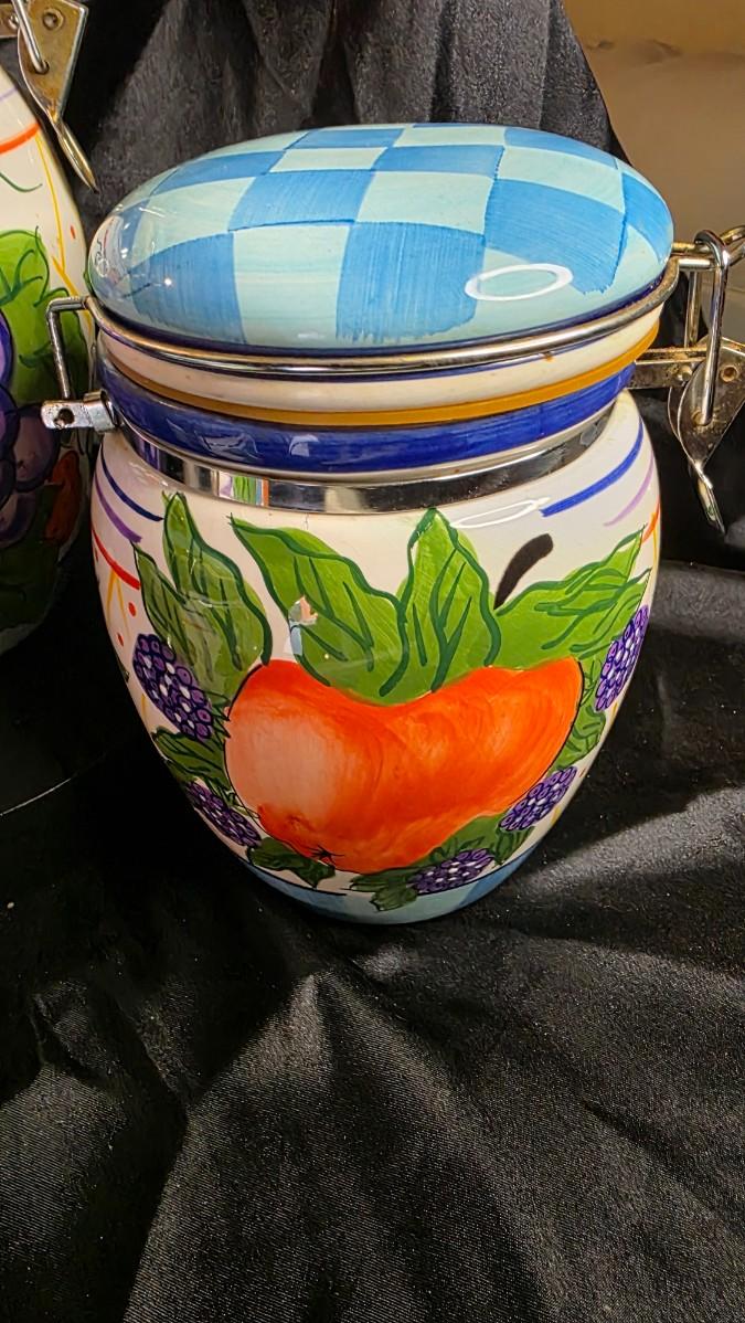 This charming trio of ceramic kitchen canisters comes from Capriware’s beloved “Michael’s Orchard” collection, each piece beautifully hand-painted with vibrant fruit designs, lush leaves, and the signature blue-check patterned lids. The colors remain bright and inviting, giving the set a cheerful farmhouse personality that stands out instantly on any countertop.