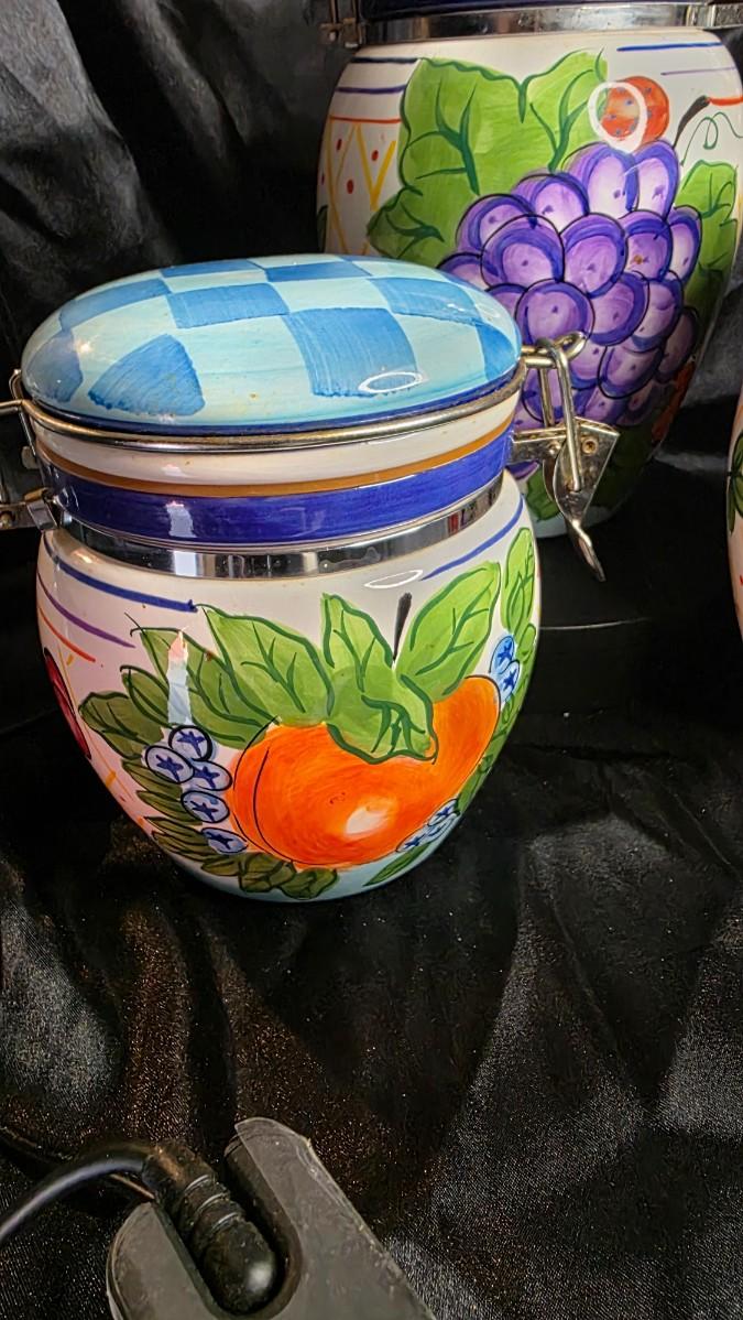 This charming trio of ceramic kitchen canisters comes from Capriware’s beloved “Michael’s Orchard” collection, each piece beautifully hand-painted with vibrant fruit designs, lush leaves, and the signature blue-check patterned lids. The colors remain bright and inviting, giving the set a cheerful farmhouse personality that stands out instantly on any countertop.