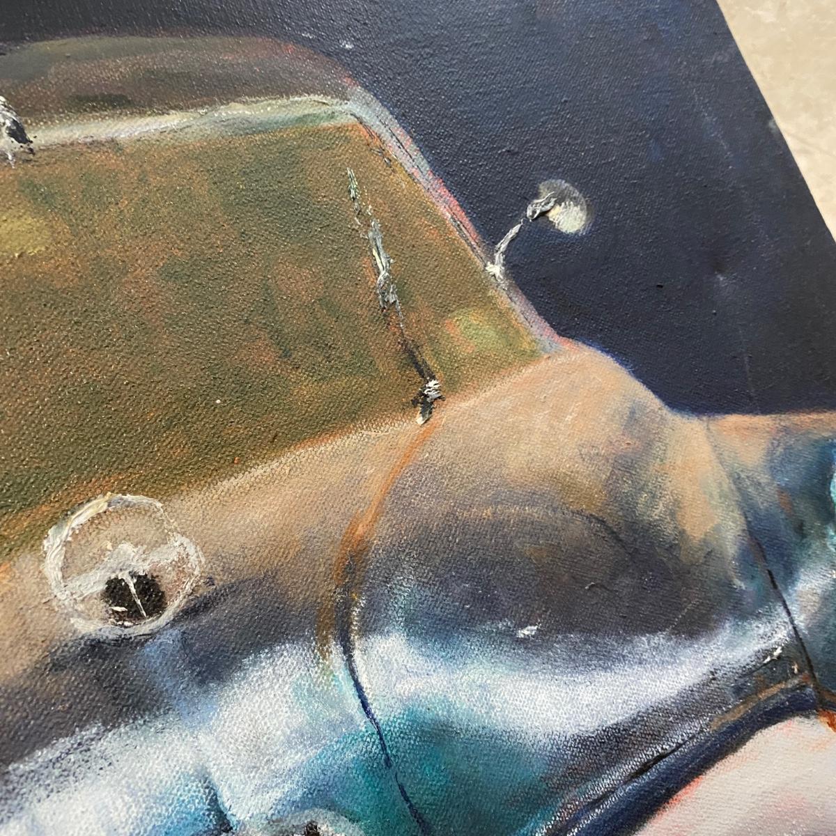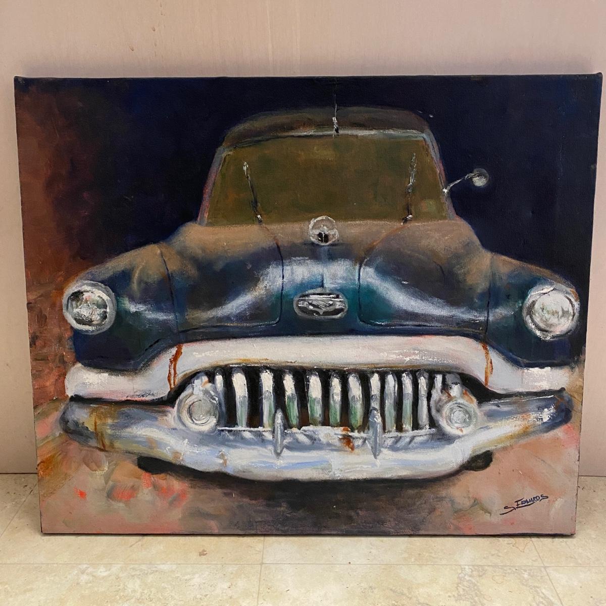 Great vintage car painting signed by artist. Measures 24” x 20”. On canvas. Some small dents in canvas but not too noticeable since on black part of painting. Some aging spots on back of canvas. Shipping available. Please note shipping are can be costly. You may wish to contact UPS Store with measurements to get a quote before bidding.