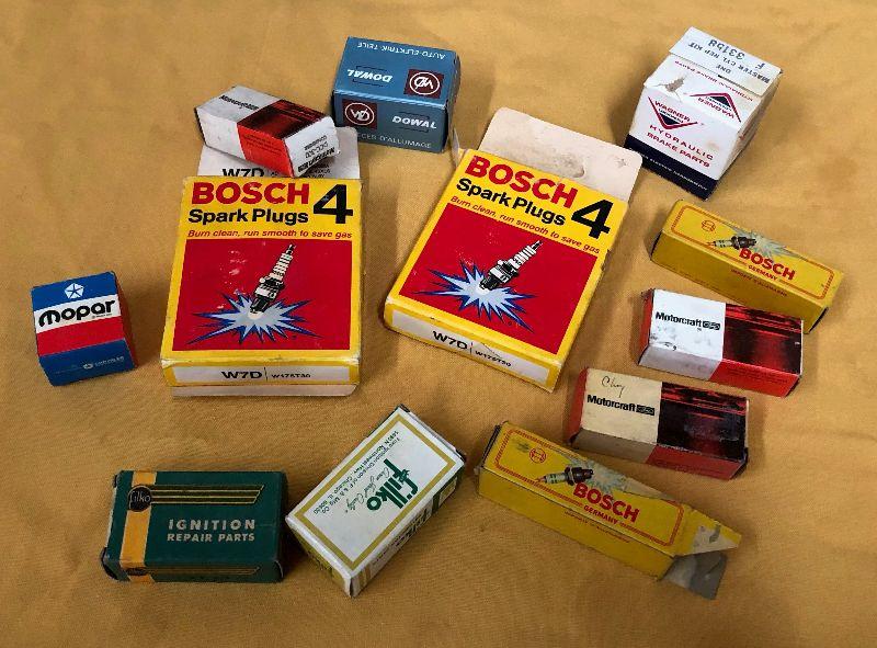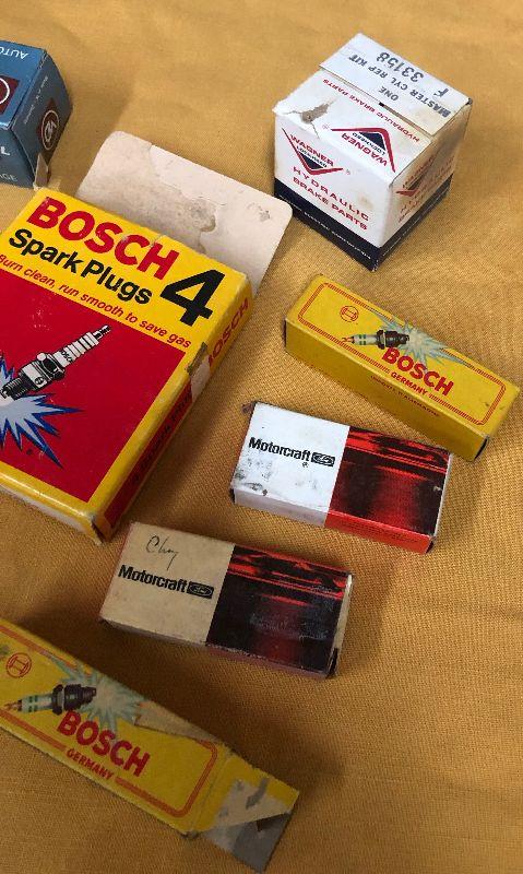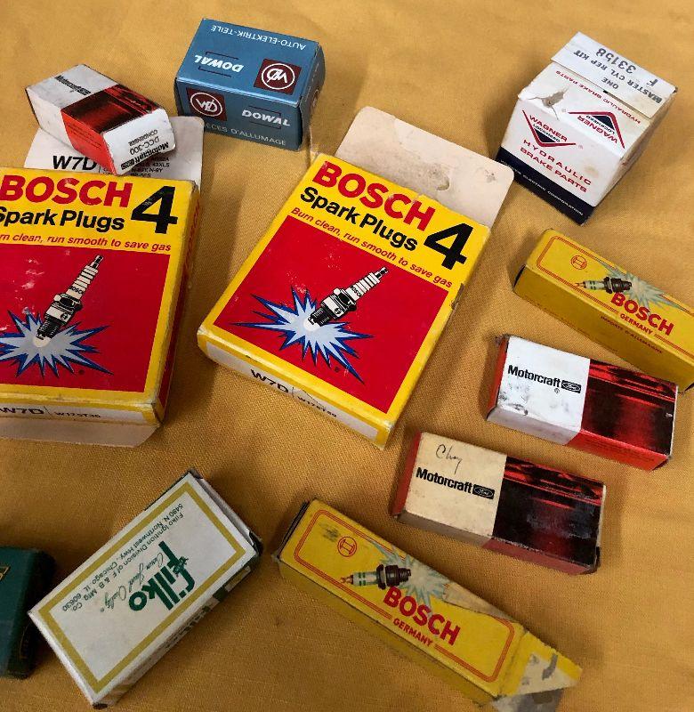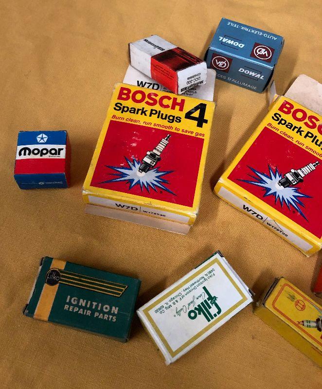 Vintage new and used old stock auto ignition parts...spark plugs, etc...as shown...