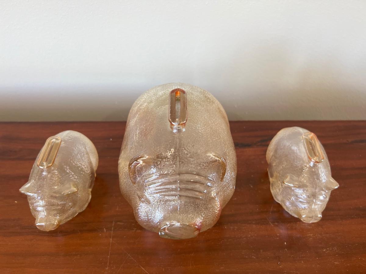 Set of three carnival, glass, piggy banks by anchor, hocking these are 100% glass. Tallest one measures 5 inches tall, 4 1/2 inches wide and 6 1/2 inches deep. Smaller to measure 3 inches tall 2 1/2 inches wide, 4 inches deep.