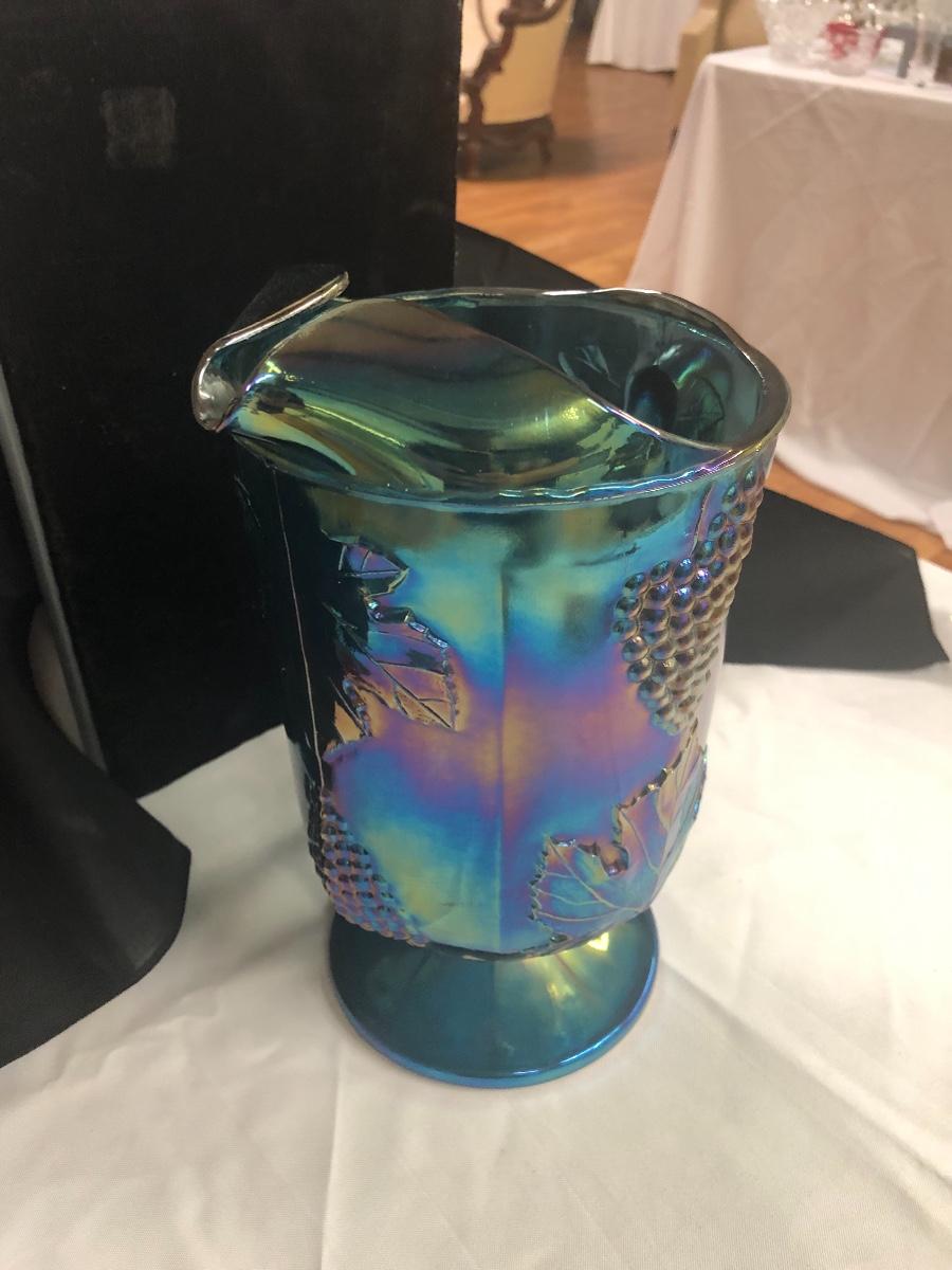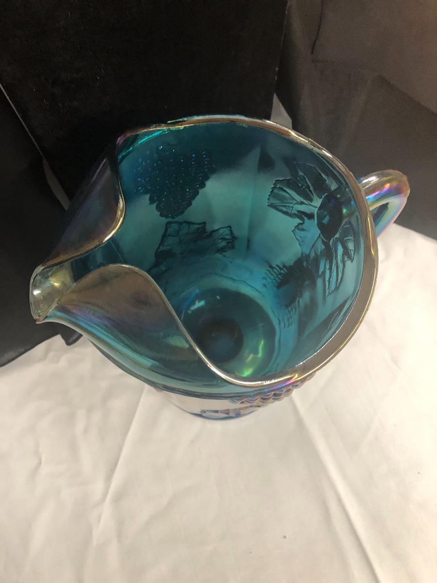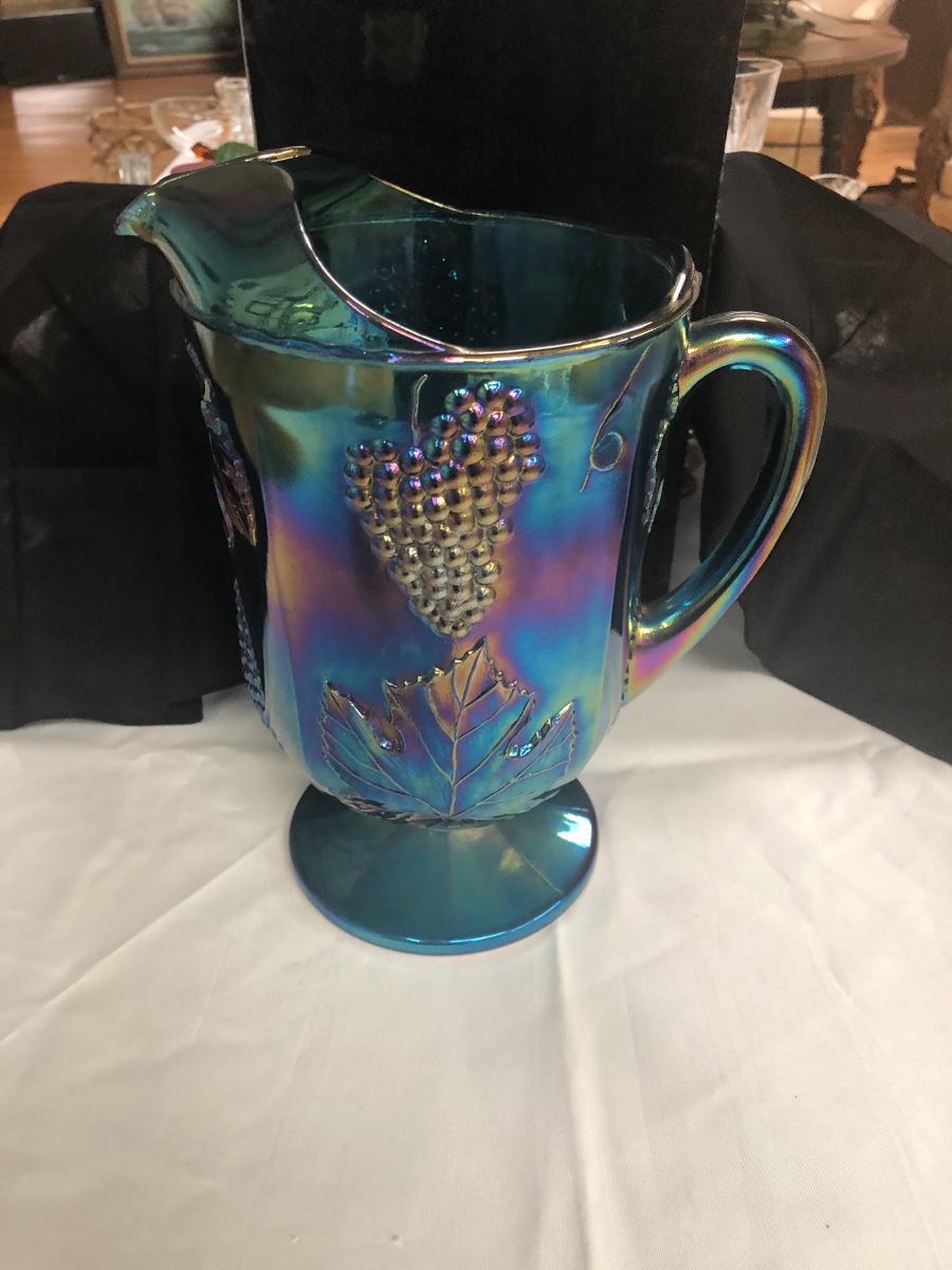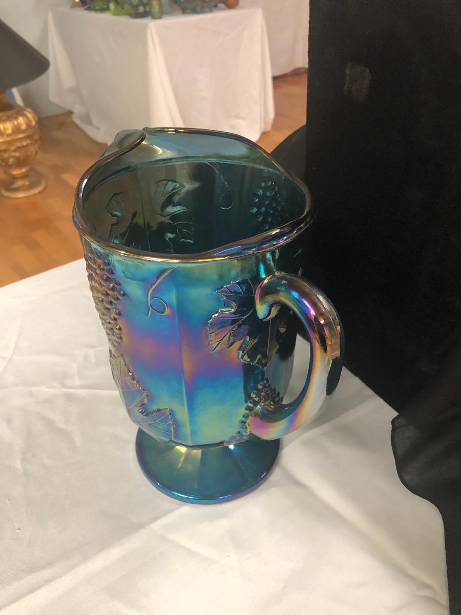 Gorgeous vintage blue carnival glass pitcher-10” high