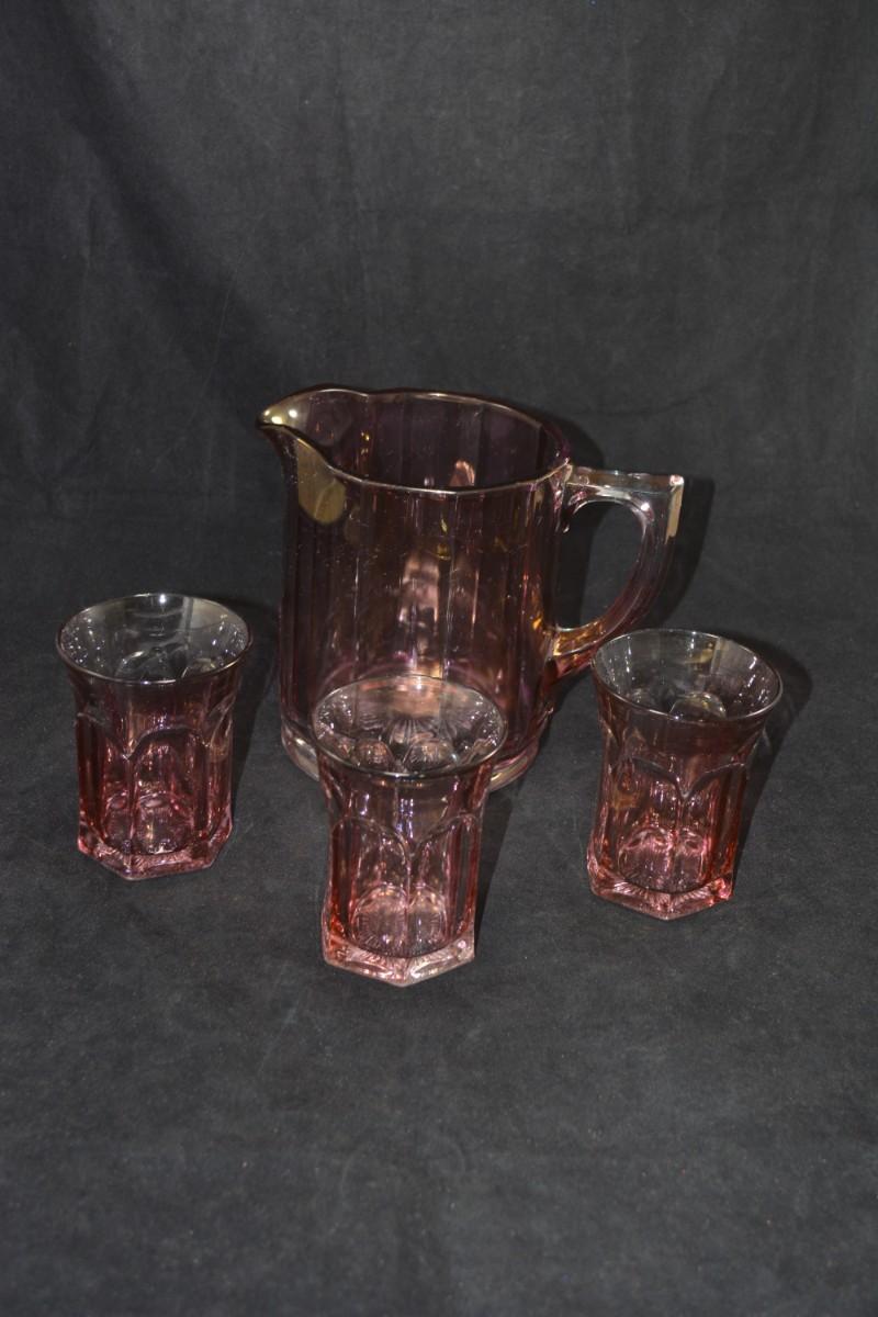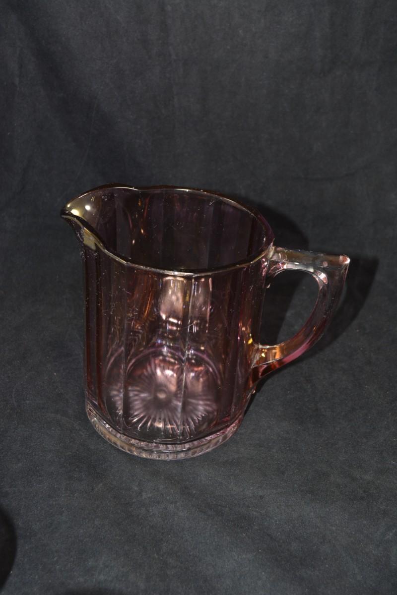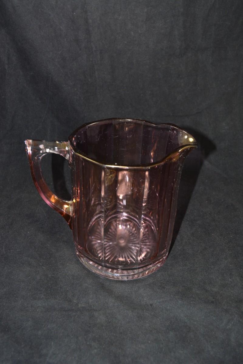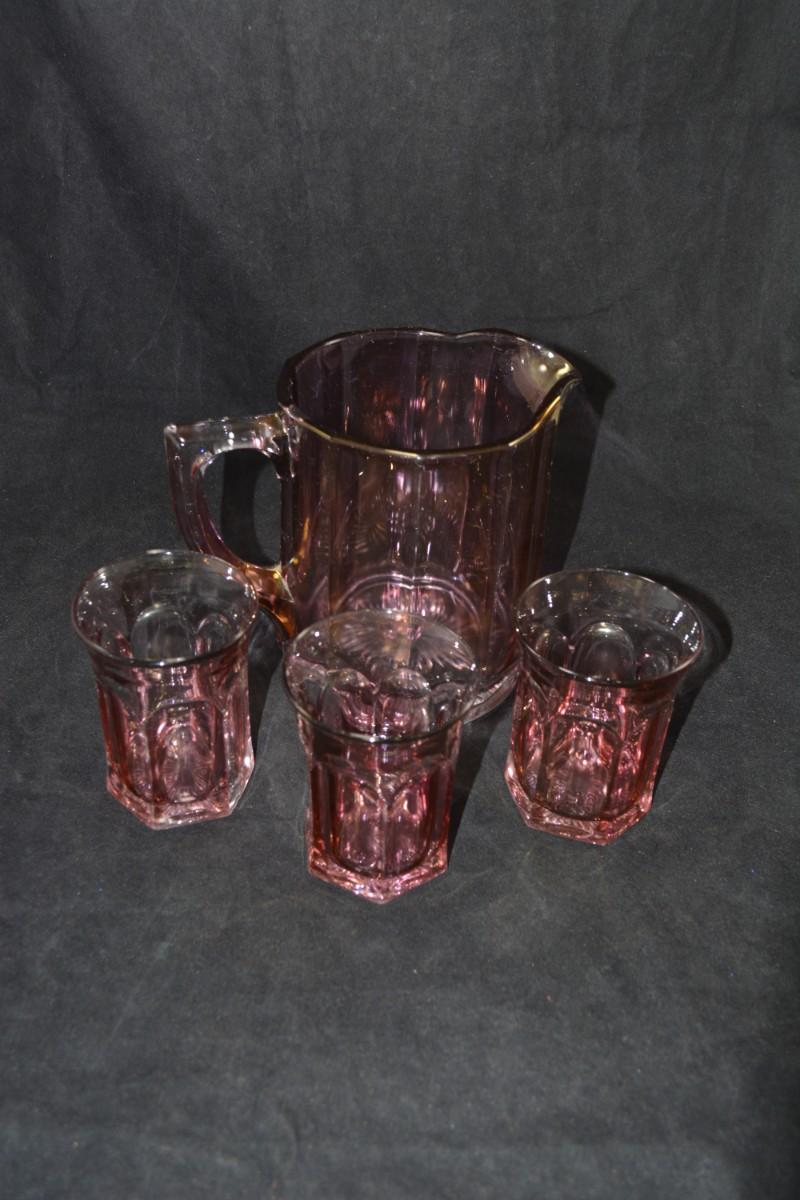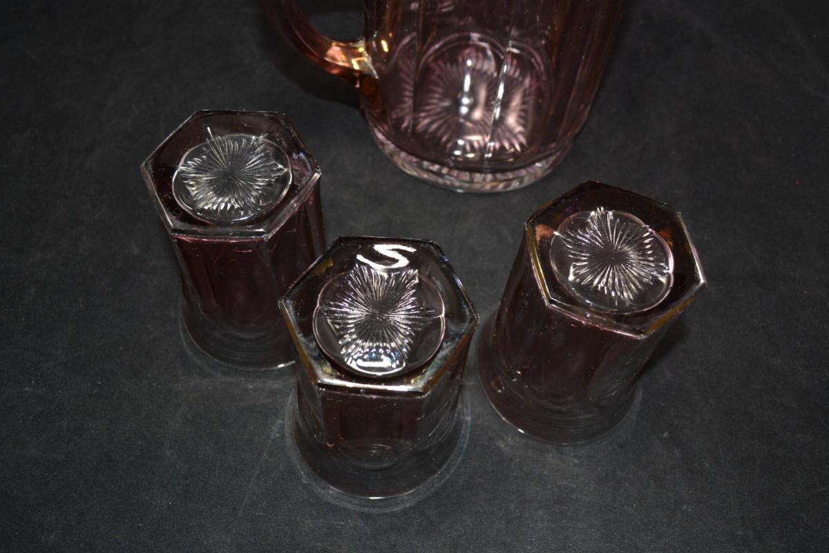 Vintage Carnival Glass Pitcher w/ 3 Glasses, Starburst Bottom