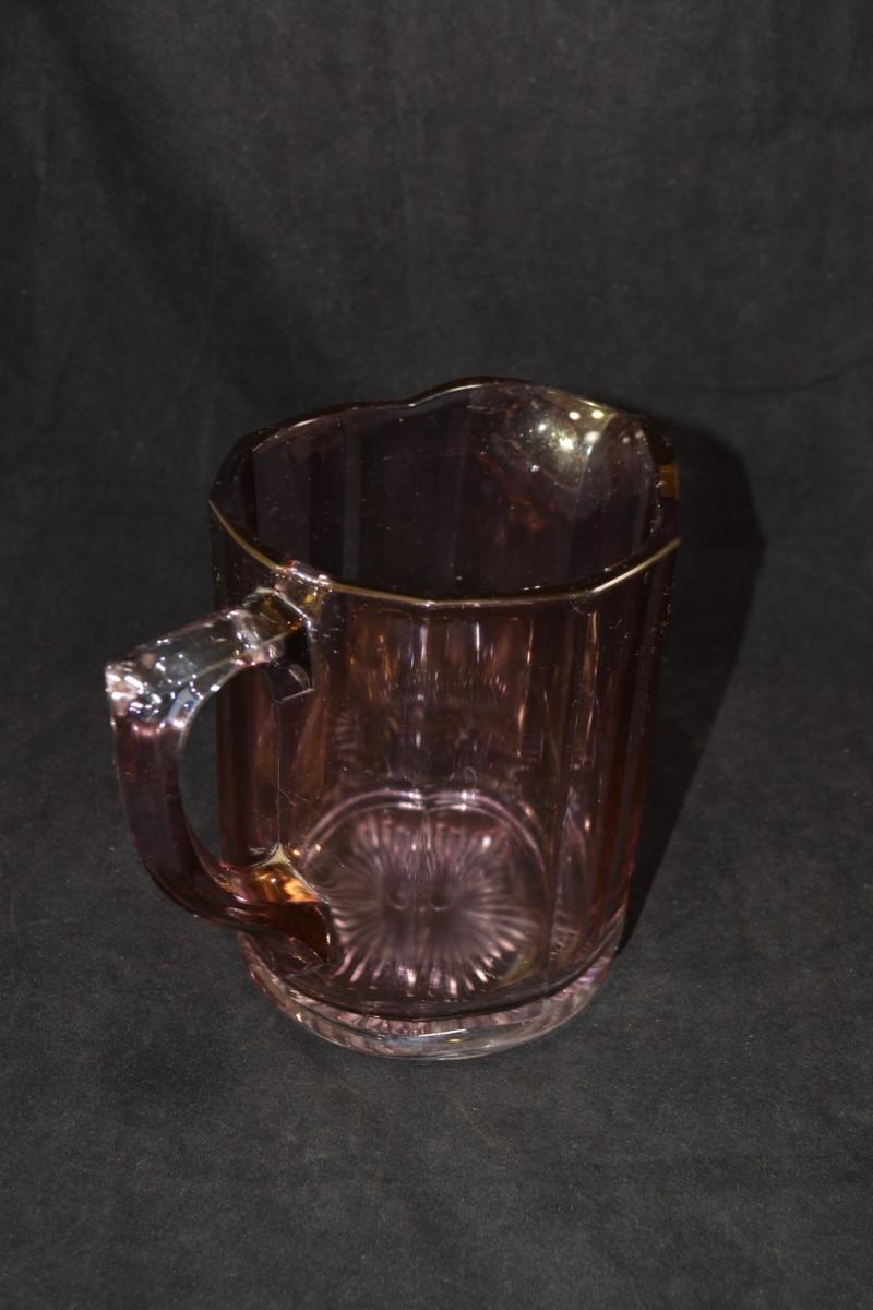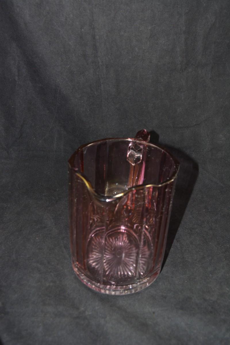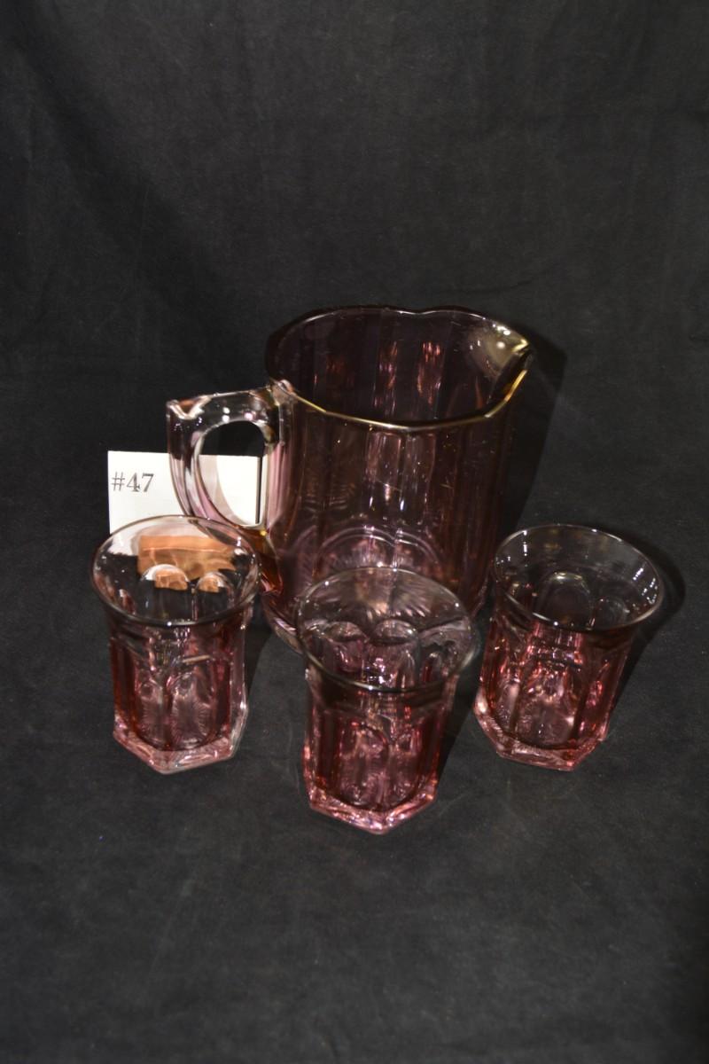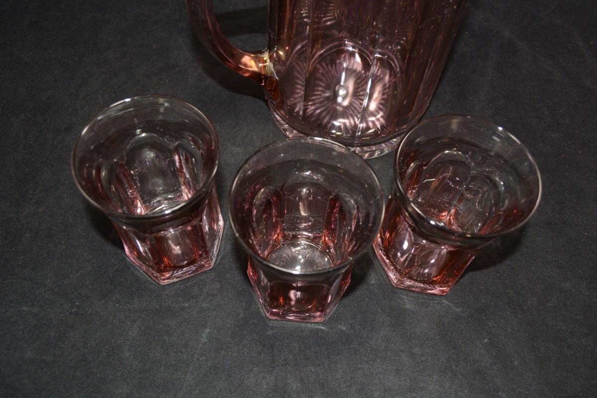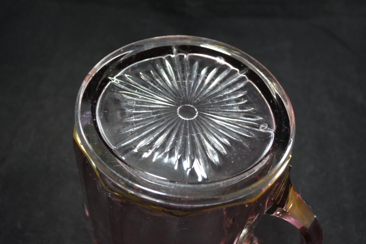 Vintage Carnival Glass Pitcher w/ 3 Glasses, Starburst Bottom