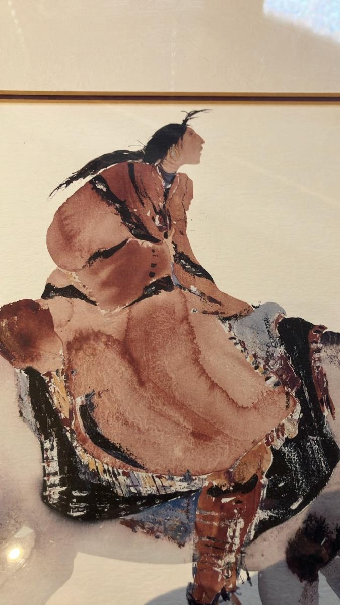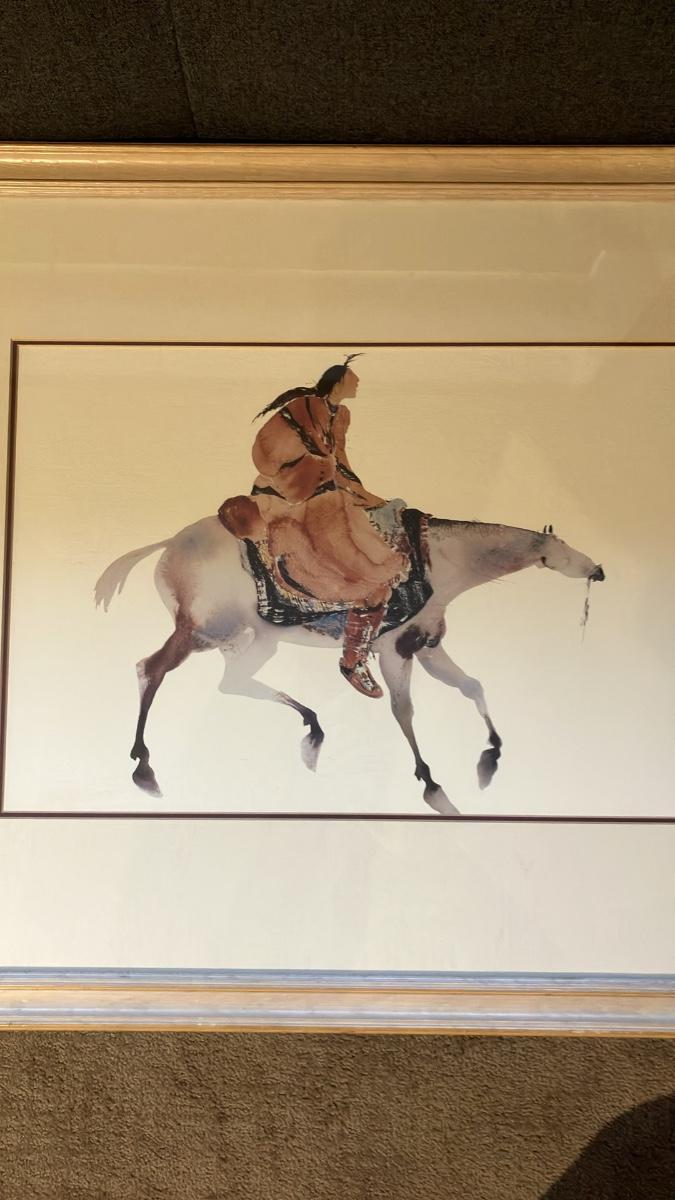 Beautiful vintage 1990s offset lithograph by renowned Cherokee-inspired artist Carol Grigg. Depicts a serene Native American woman in flowing robes riding a horse — classic ethereal watercolor style symbolizing harmony with nature.