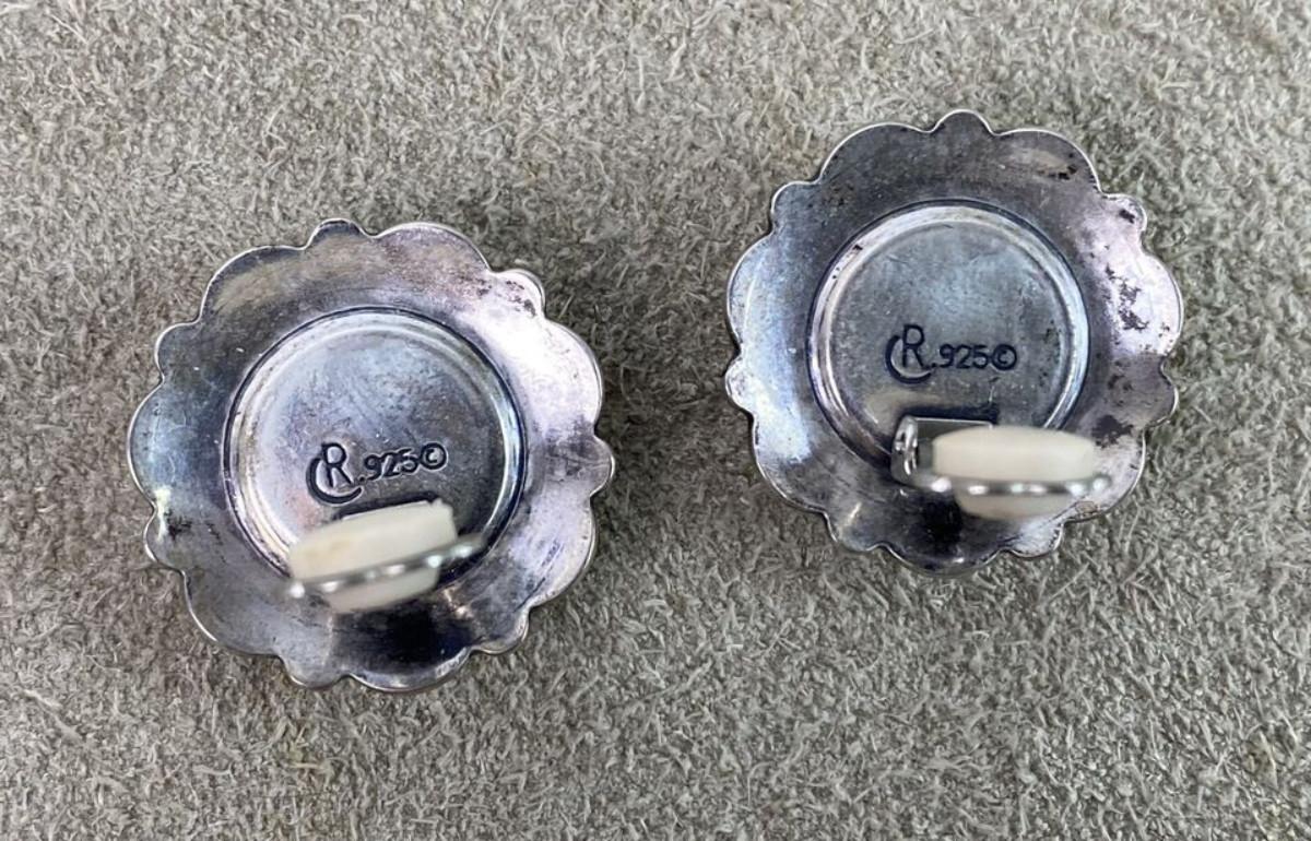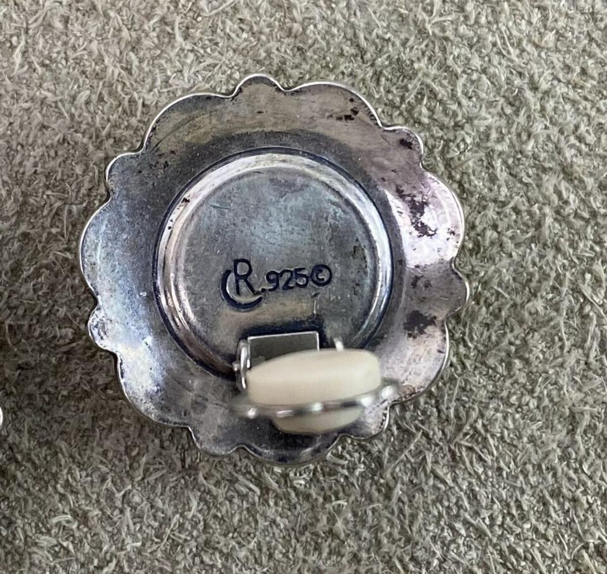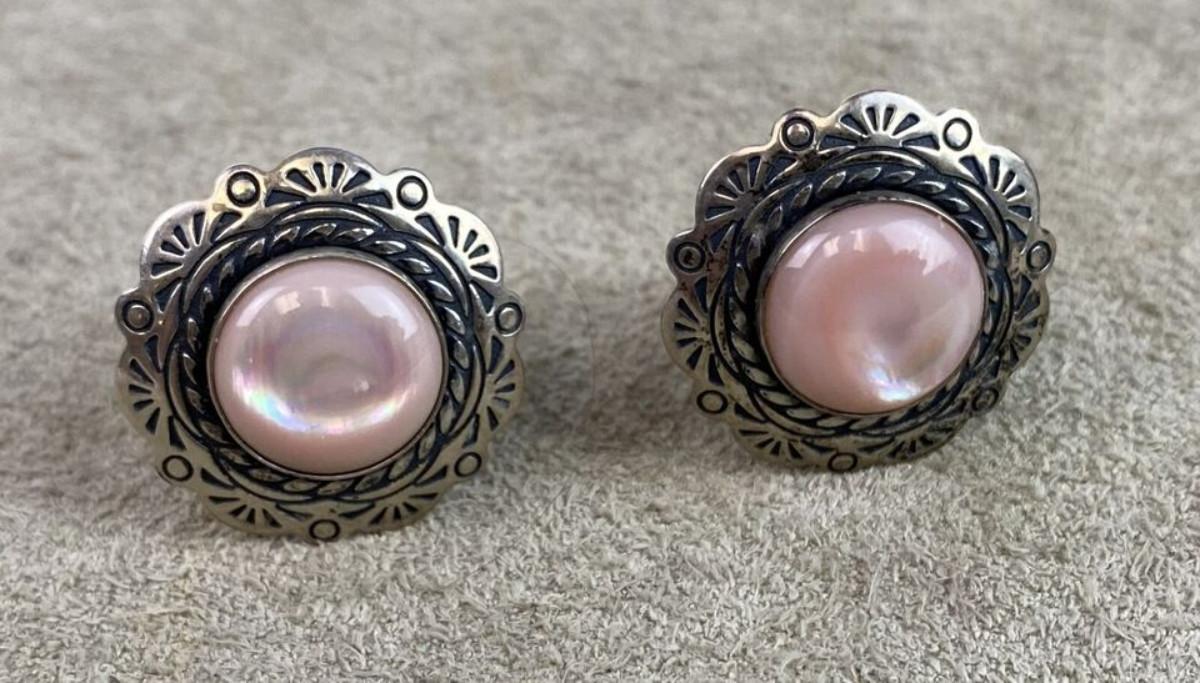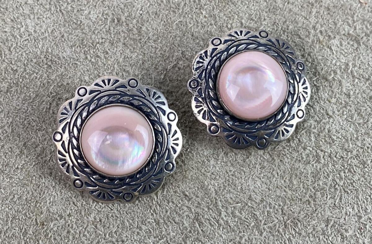 Slightest use on this estate jewelry..Pink Mother of pearl in floral Sterling silver settings...Clip-on style...Designed by Carolyn Pollack for RELIOS founded by Bill Pollack in 1975 in Albuquerque, New Mexico...his wife, Carolyn was lead designer...10.4 grams...22mm...Padded clips...