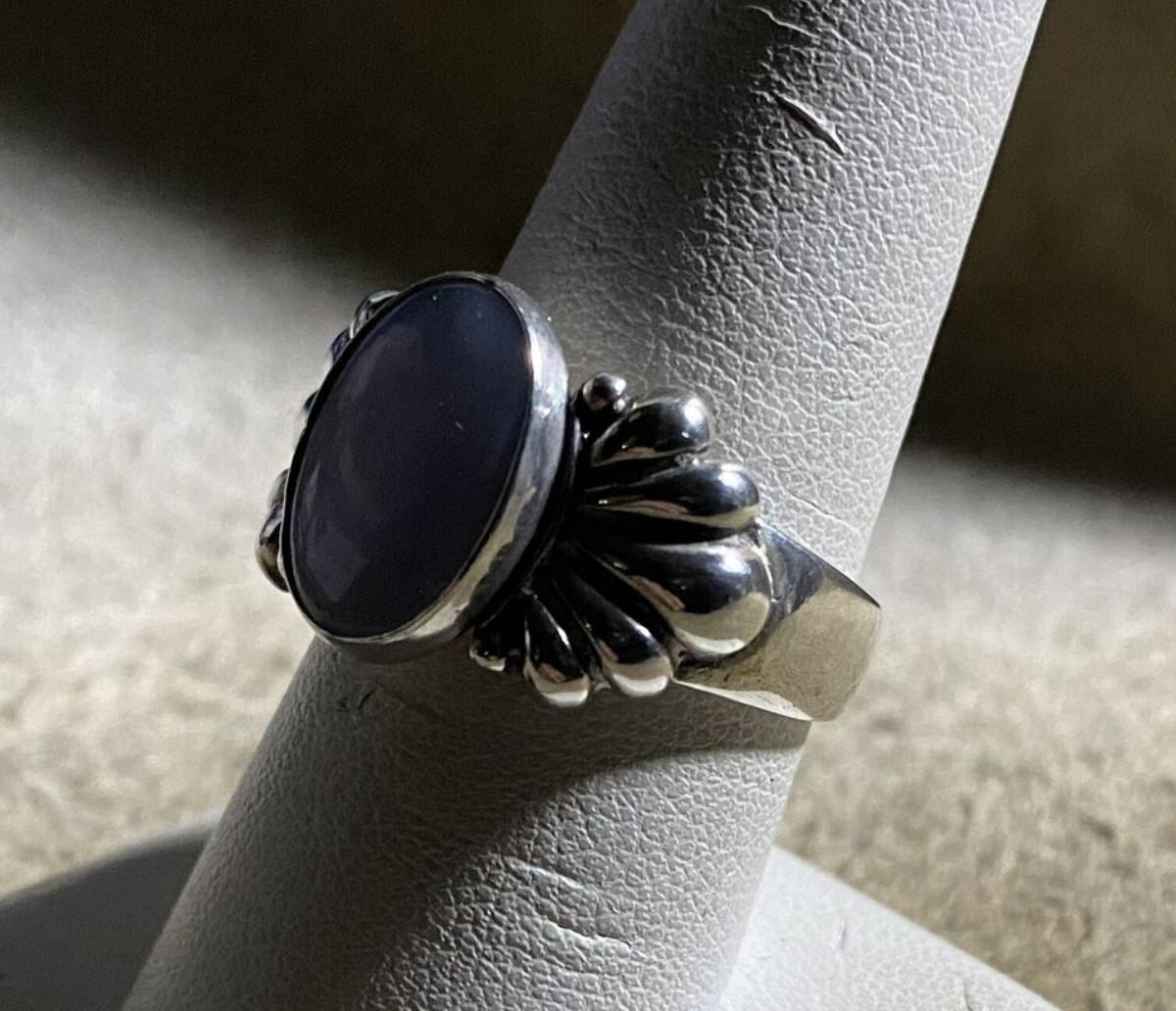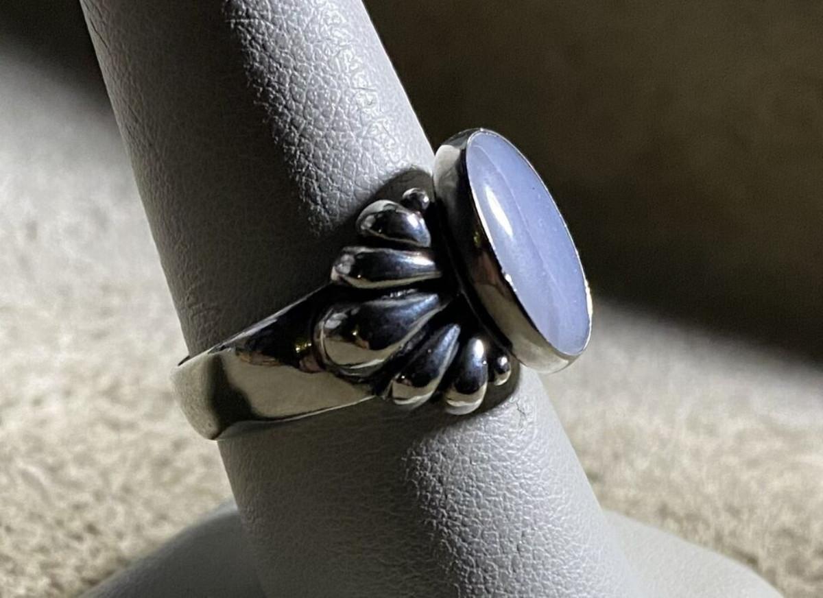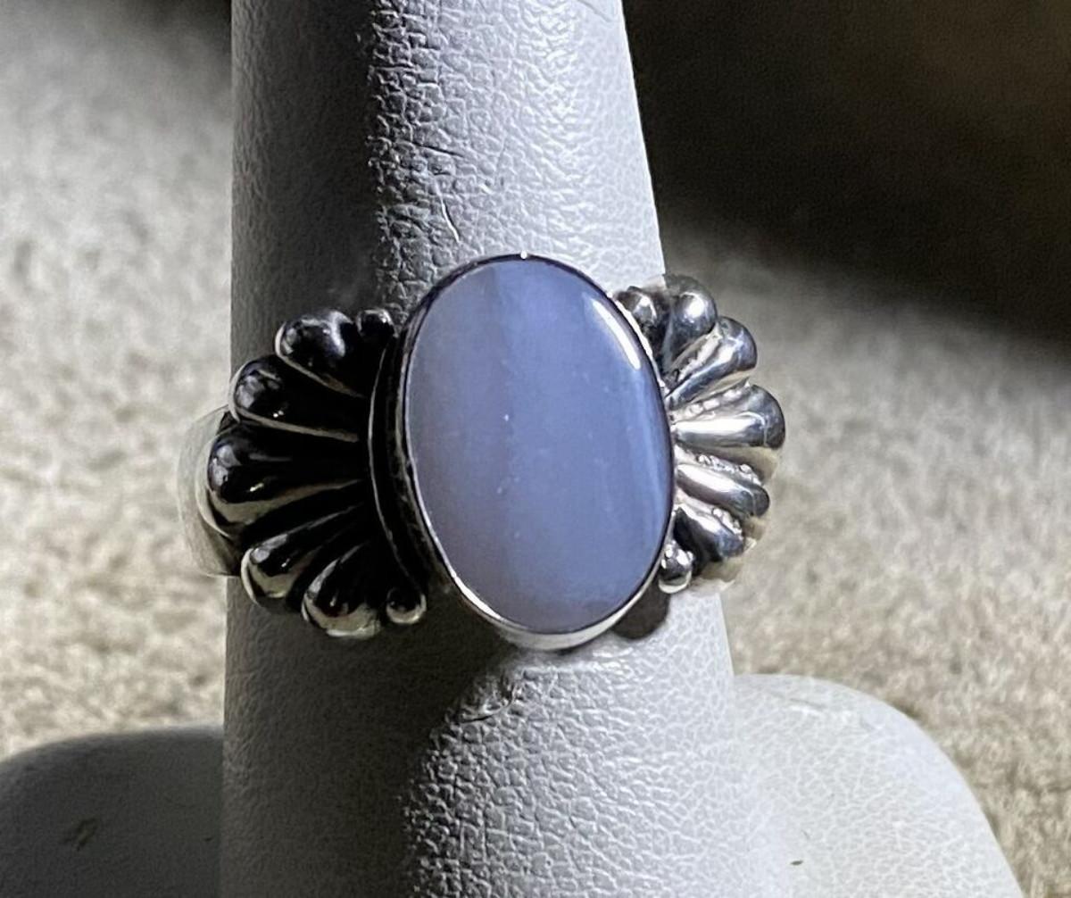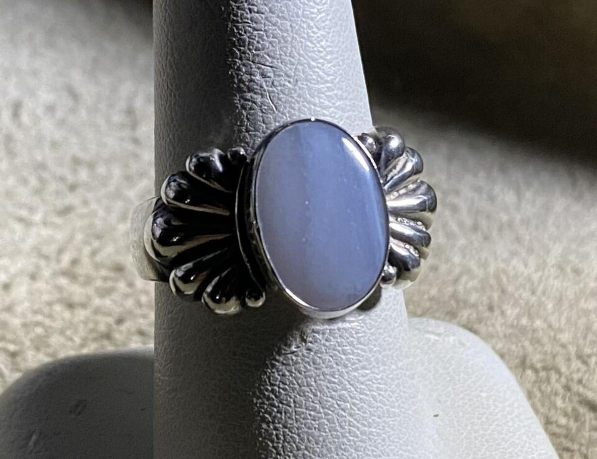 Very good condition on this vintage estate ring from RELIOS designed by Carolyn Pollack...Sterling silver and Blue Lace Agate...Size 9...Weight 9.4 grams...Relios Jewelry was founded in 1975 by Bill Pollack, in Albuquerque, New Mexico. Bill's wife, Carolyn, was his lead jewelry designer working primarily in sterling silver, in Southwestern style.