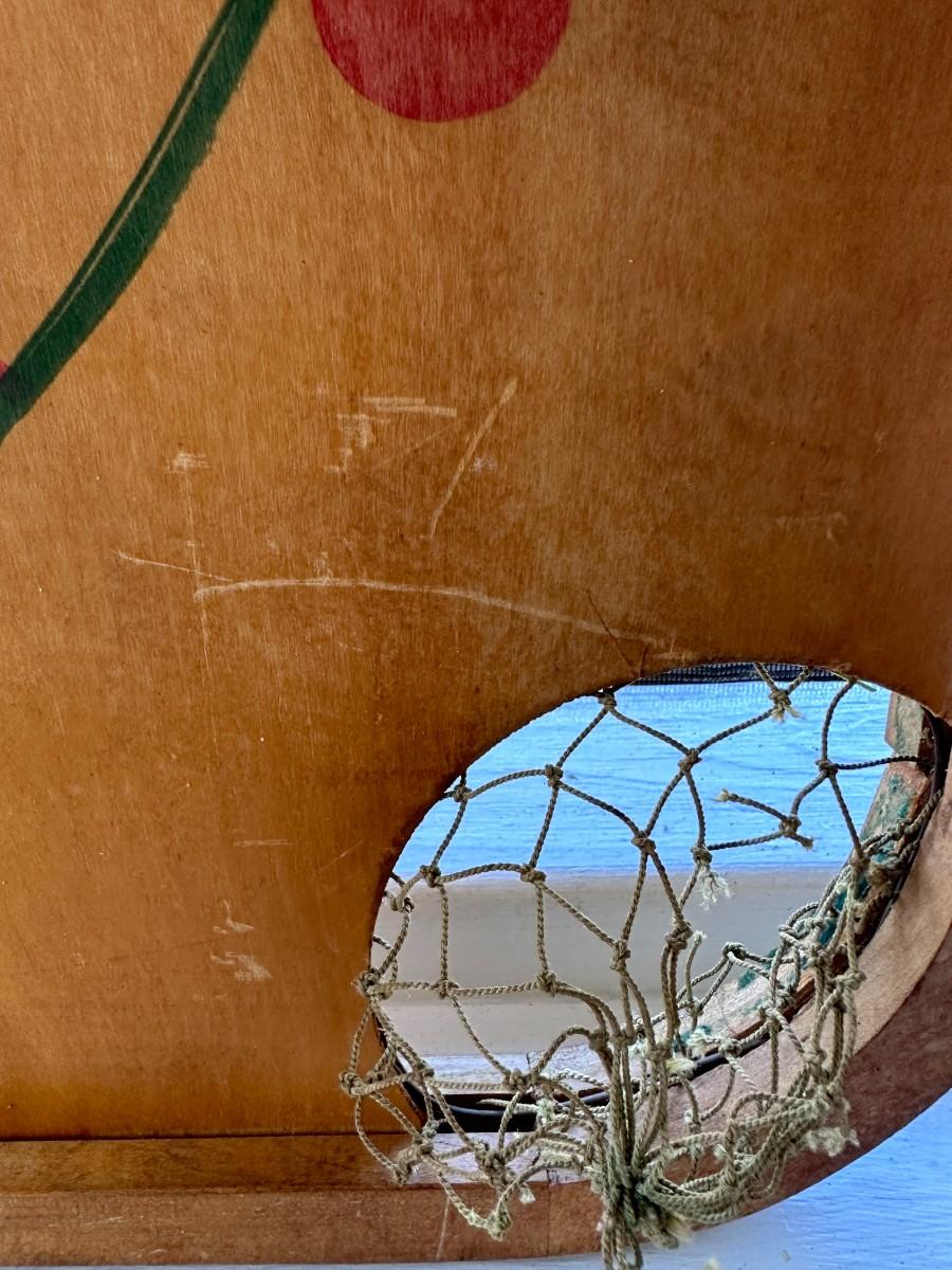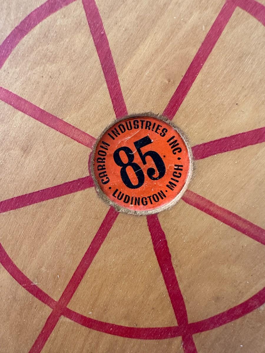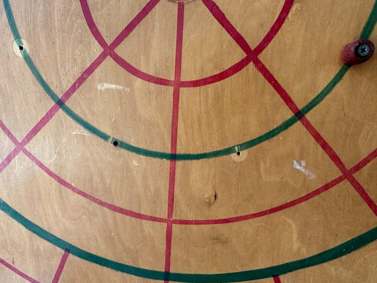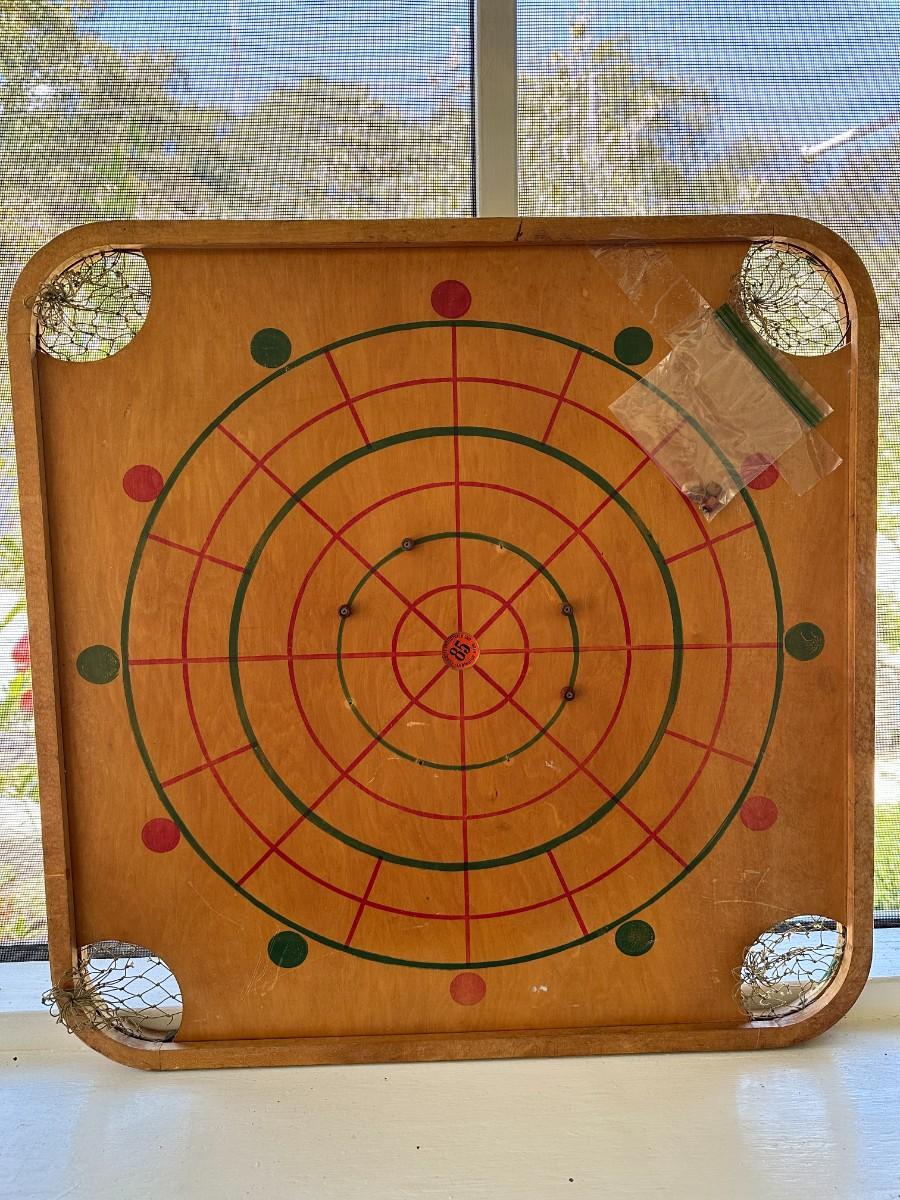 Game board flips to Checkers/Chess on back. 28.5" Sq. Includes 3 vintage game pieces.