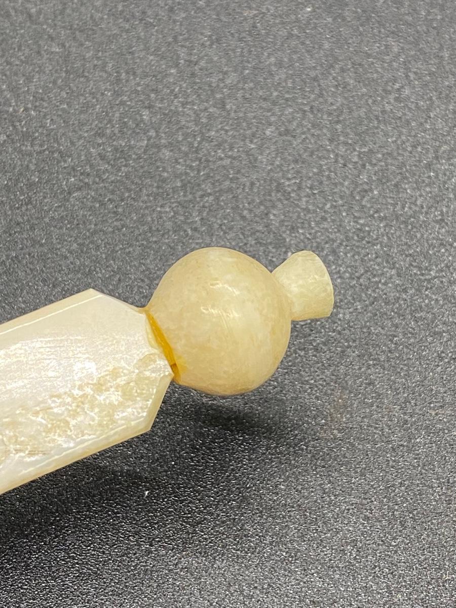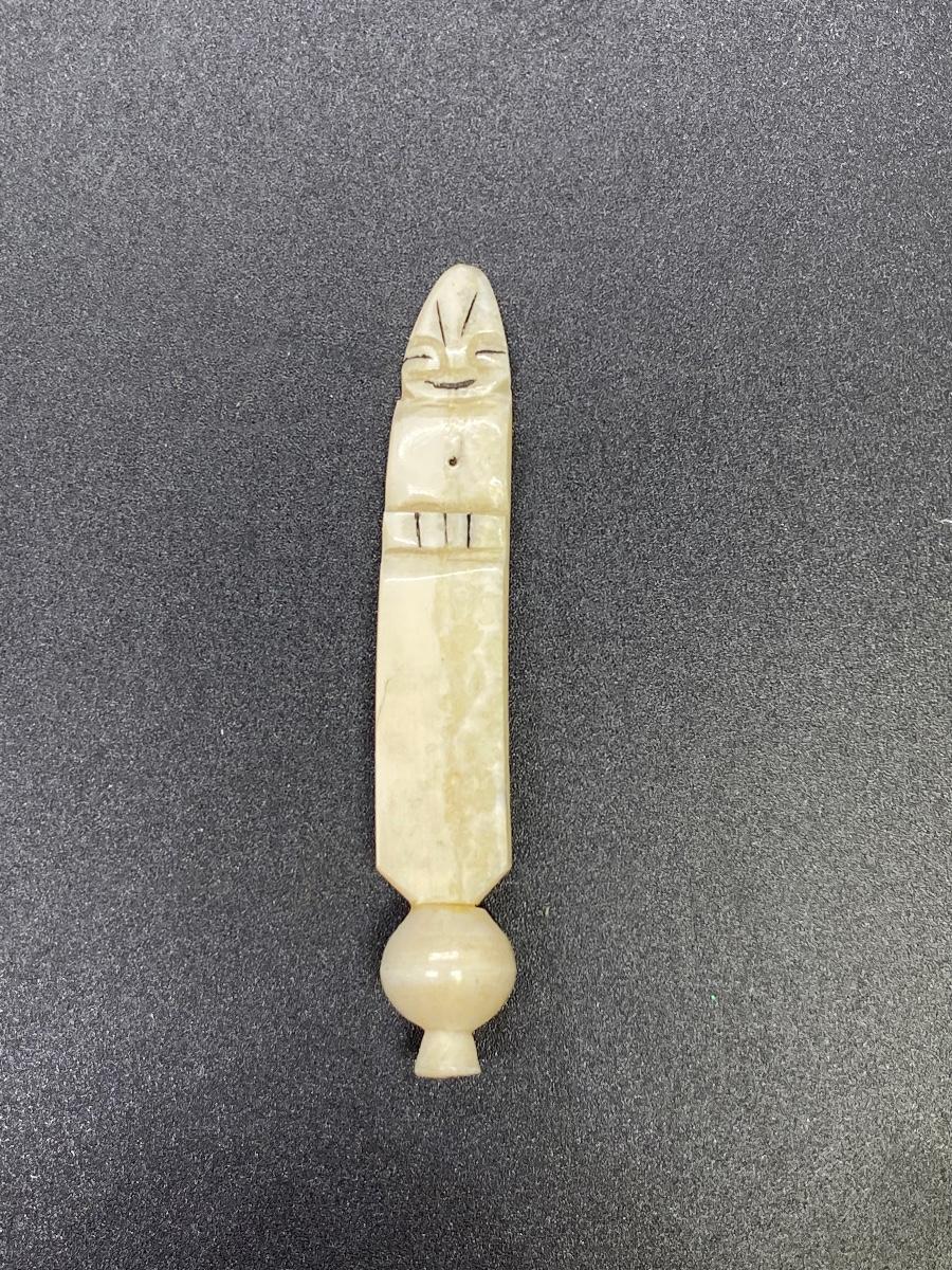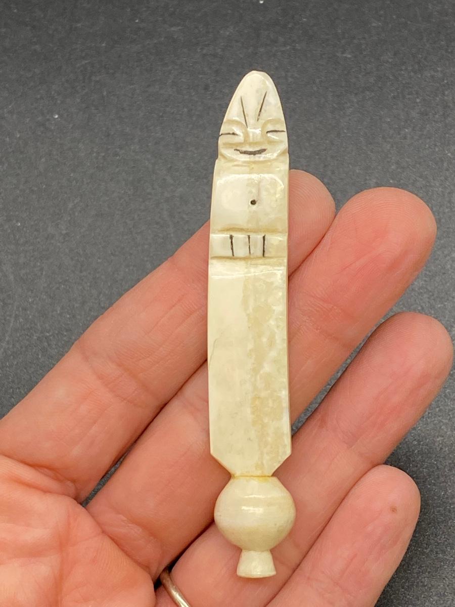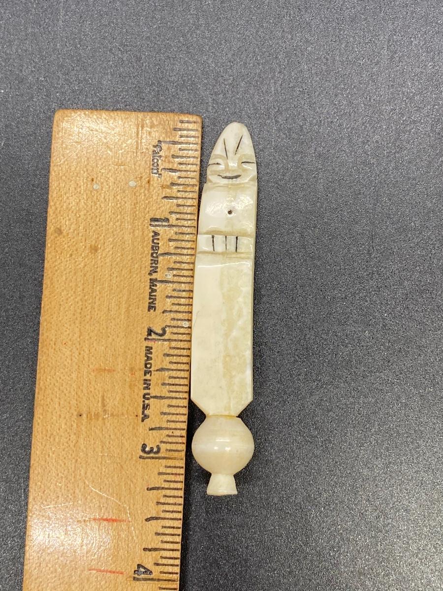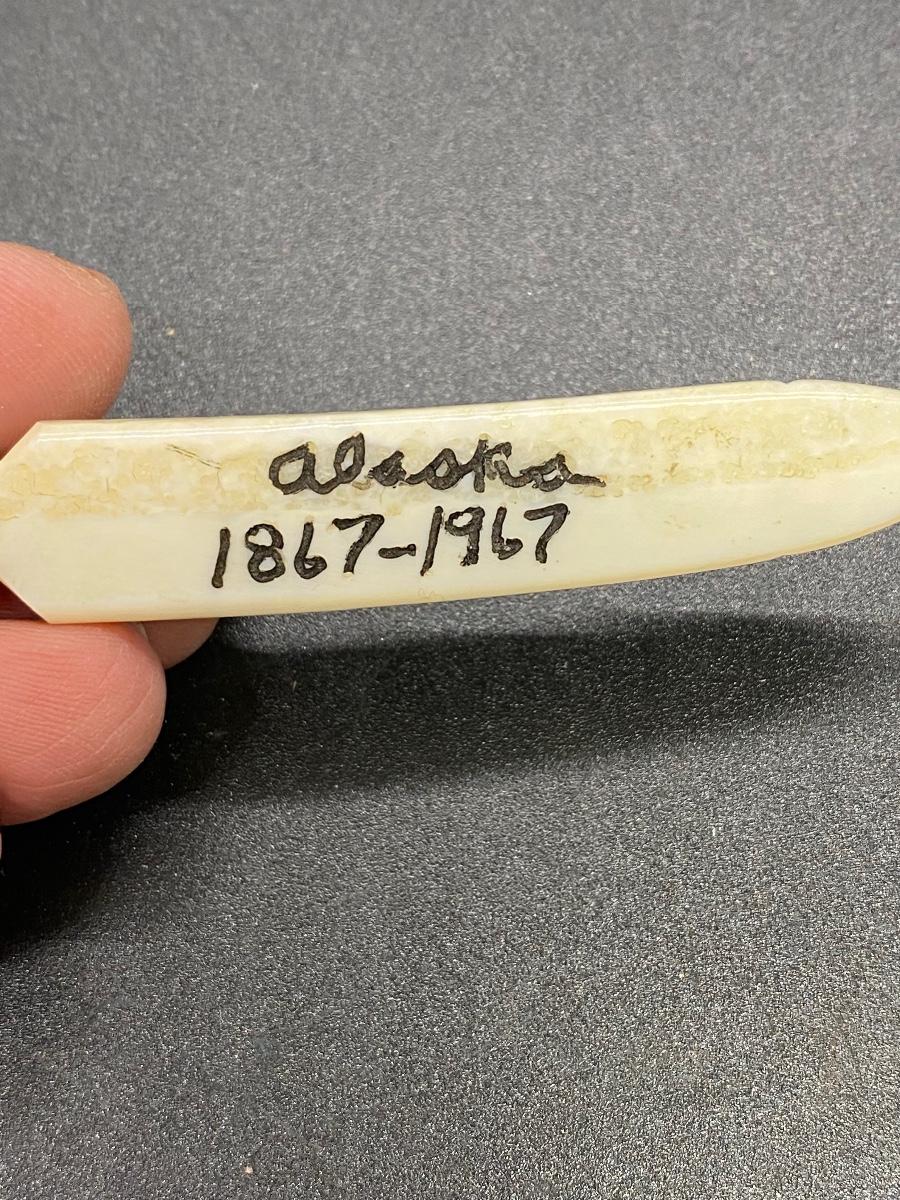Interesting Alaskan carved bone trinket. Dated 1867-1967 on the back, so it was to celebrate 100 years. Doesn't have a hole or loop to wear on chain or loop. Small, just over 3" size. Looks similar to a letter opener but not flat enough. Interesting, great for a good luck charm or idol.