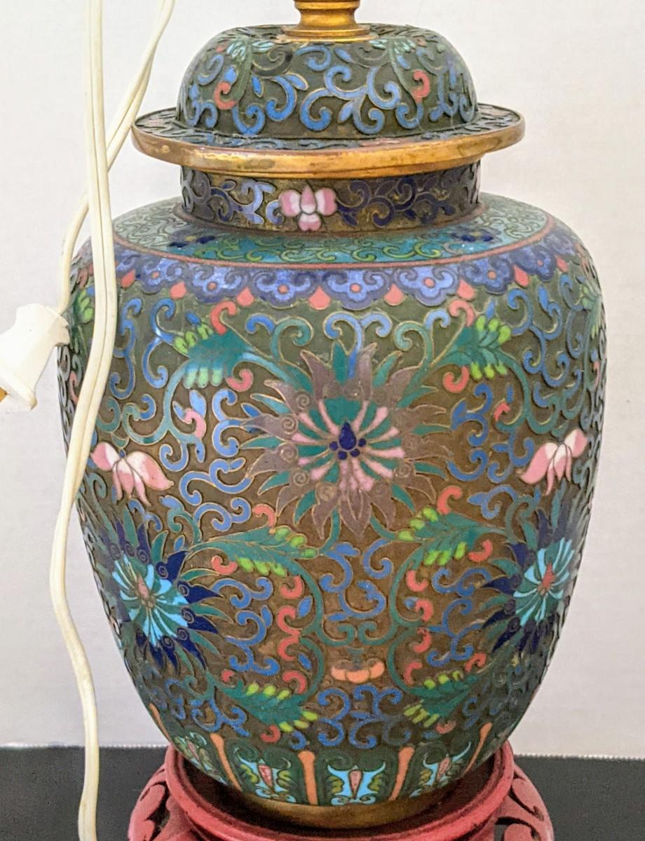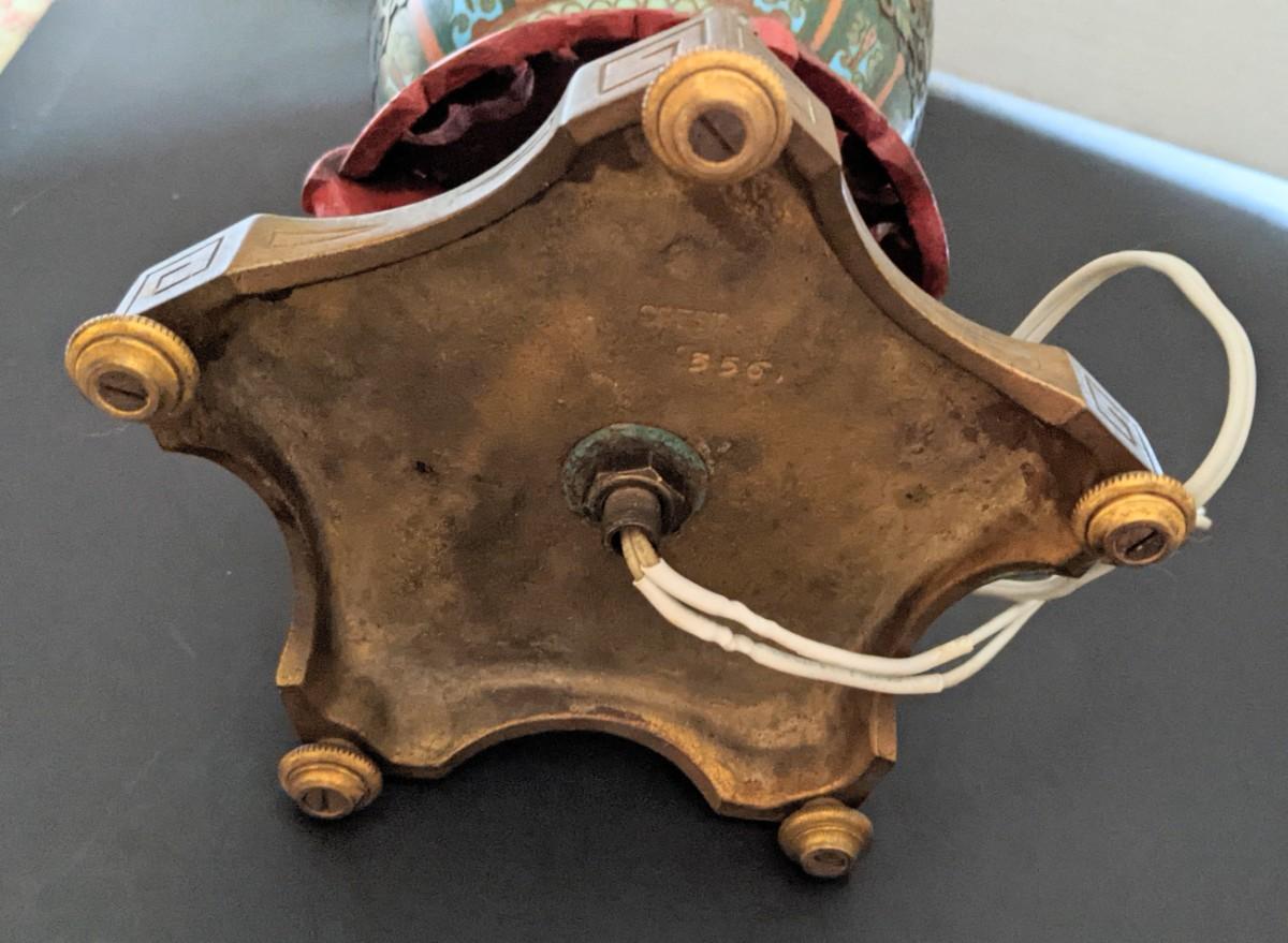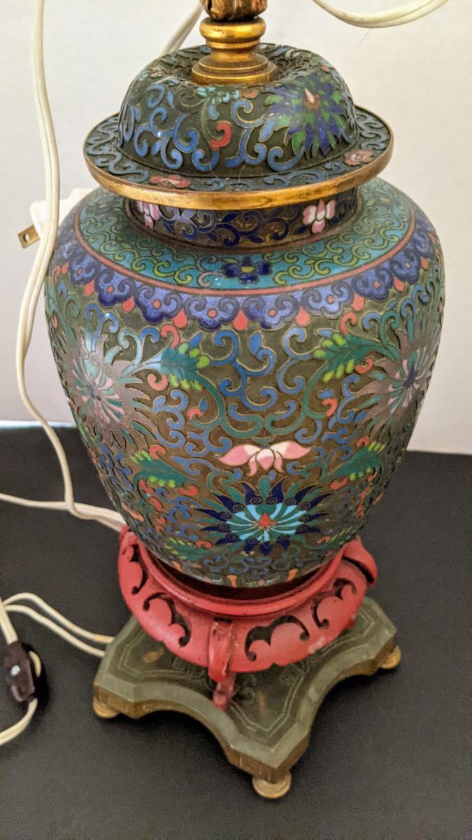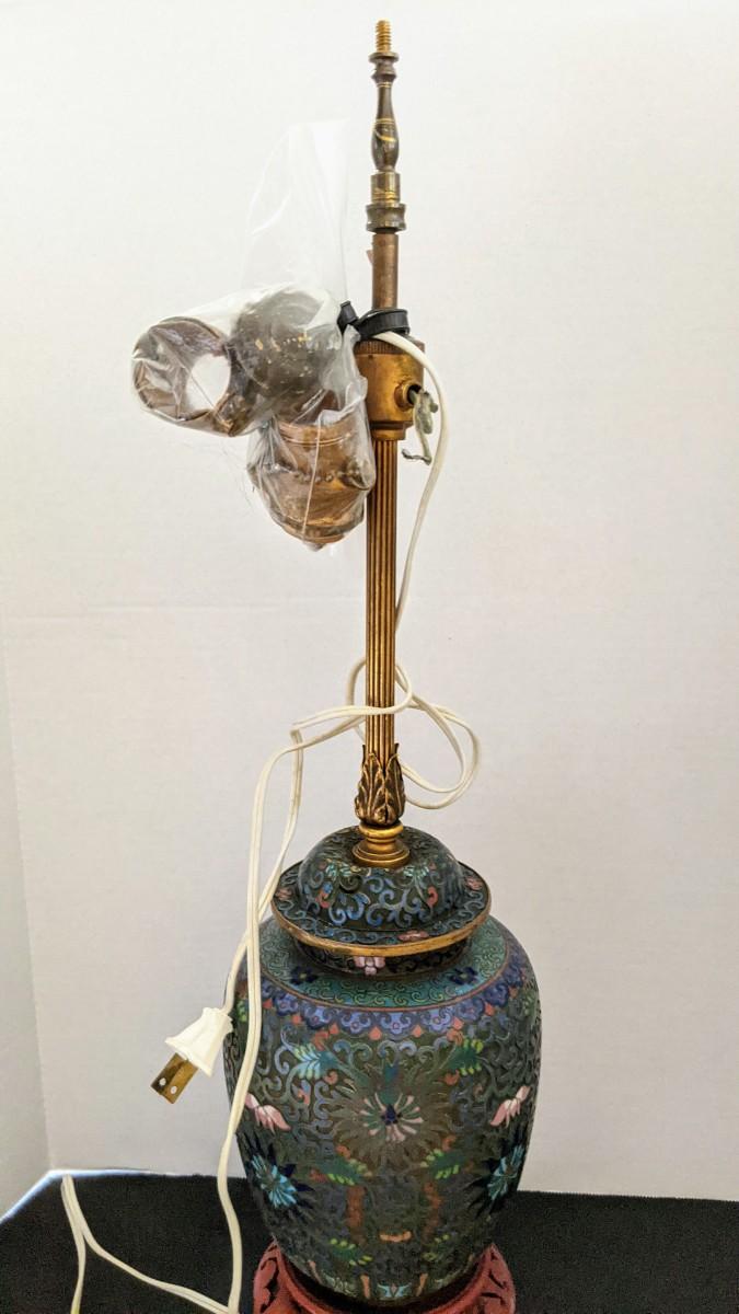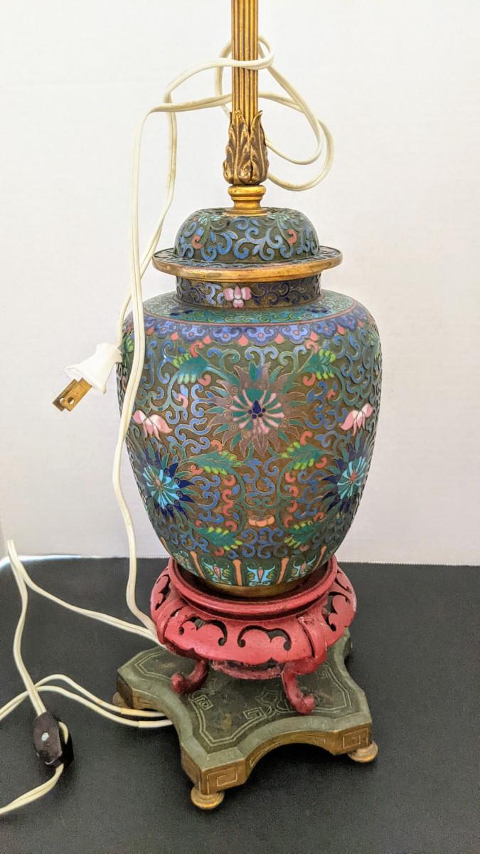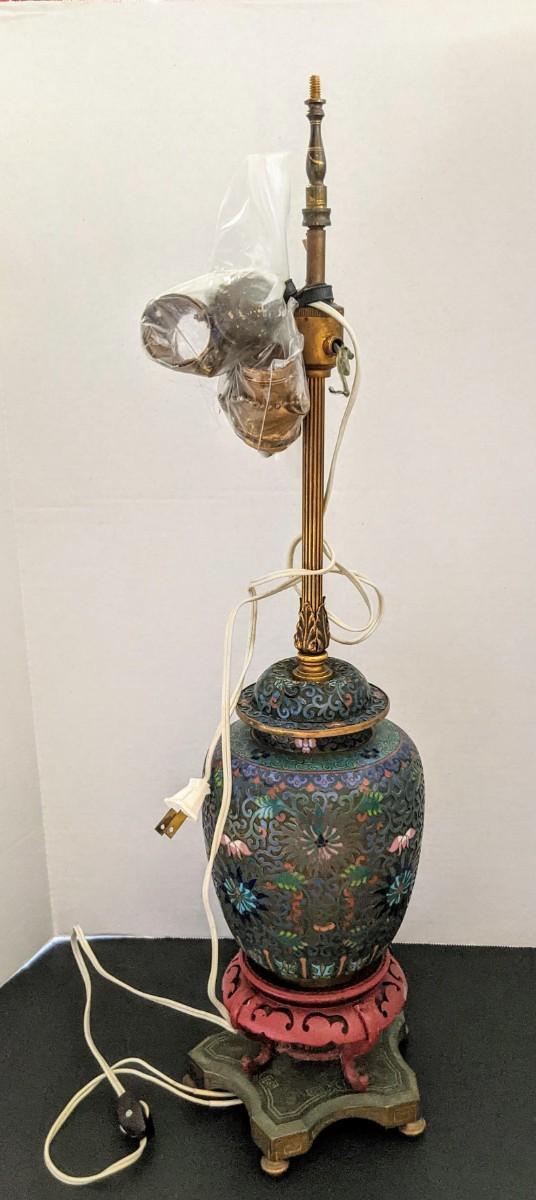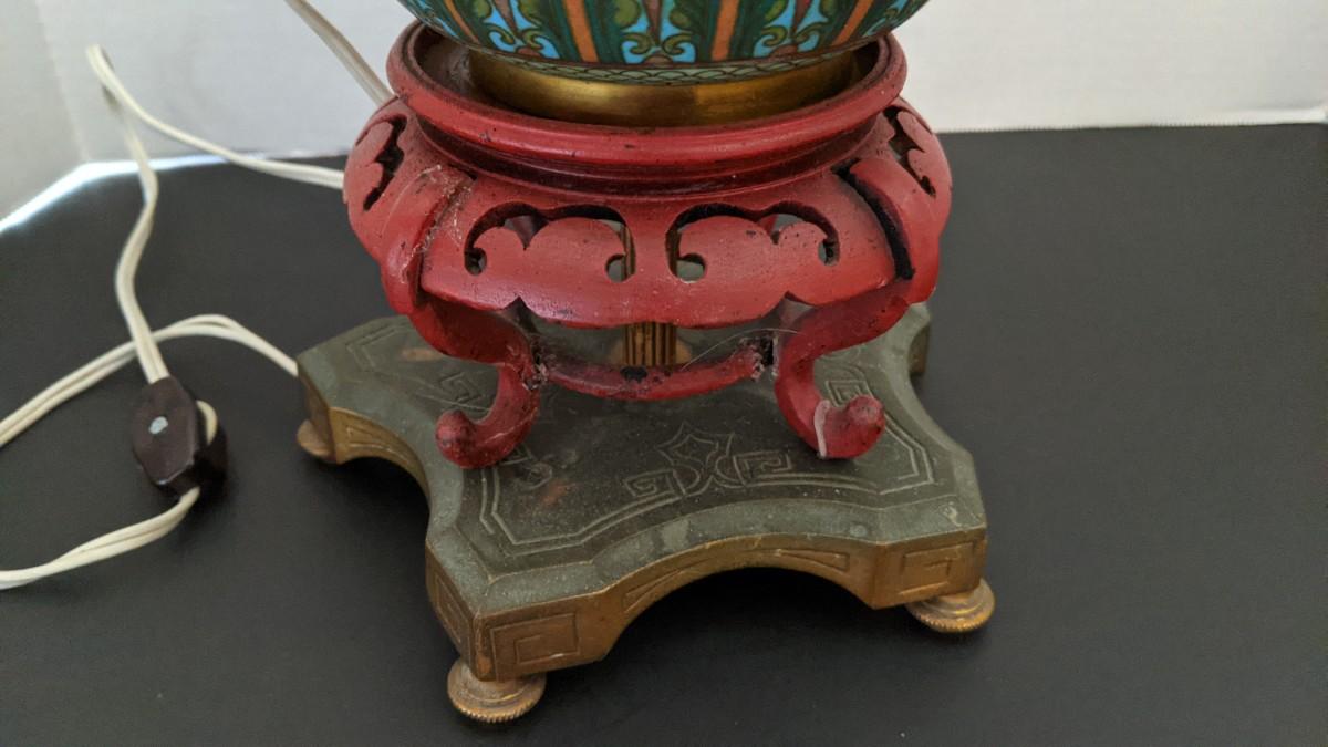 Appears to be vintage brass vase on wooden stand on metal base to complete a lamp. Wooden base has some repairs. Over all a Very elegant lamp base. Sockets need rewiring.