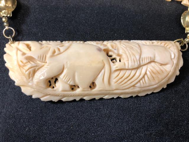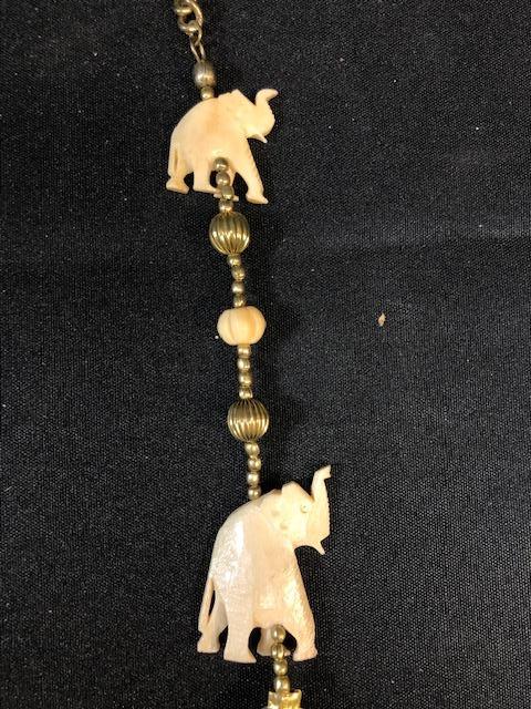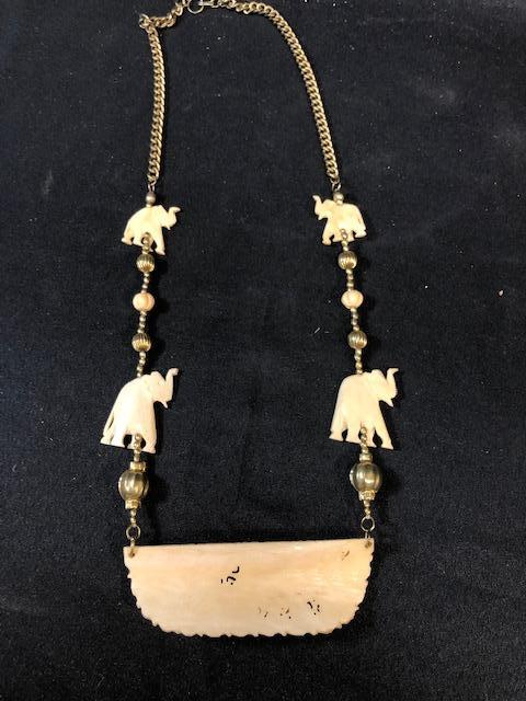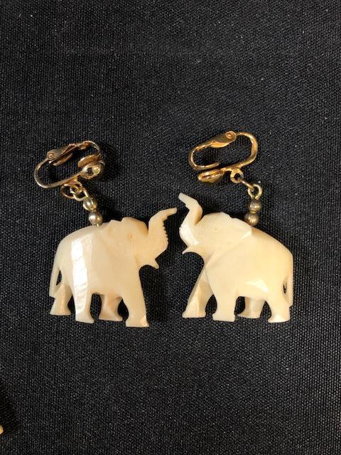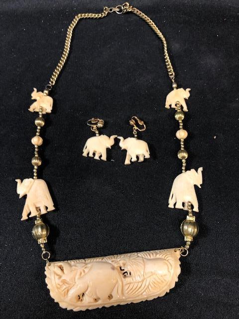 Vintage carved elephant jewelry set. Comes with a necklace and earrings. the earrings are clip style. The necklace has a large carved center piece with smaller elephants up the sides. Goldtone metal.