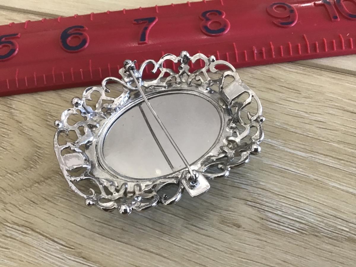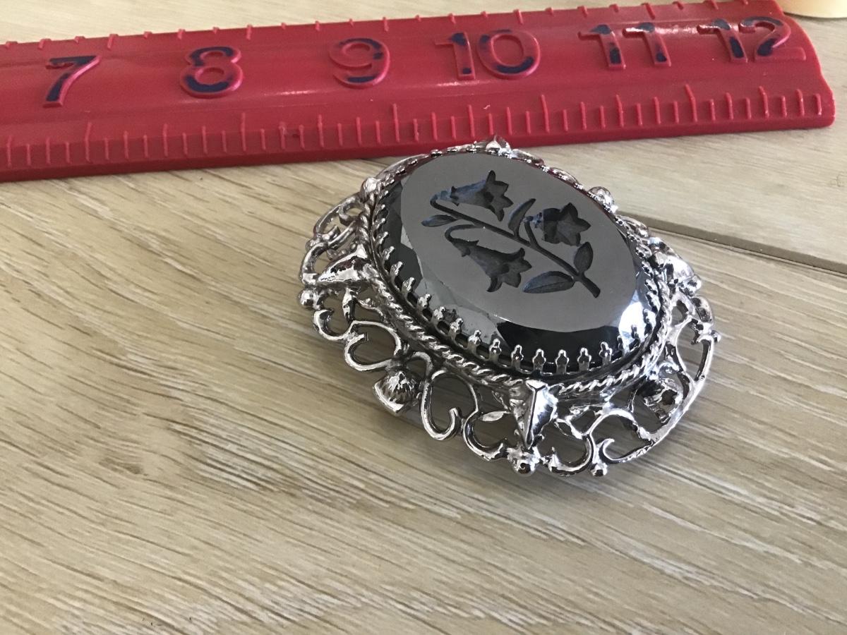Vintage Carved Hematite Floral Flower Silver Tone Filigree Domed Brooch Pin