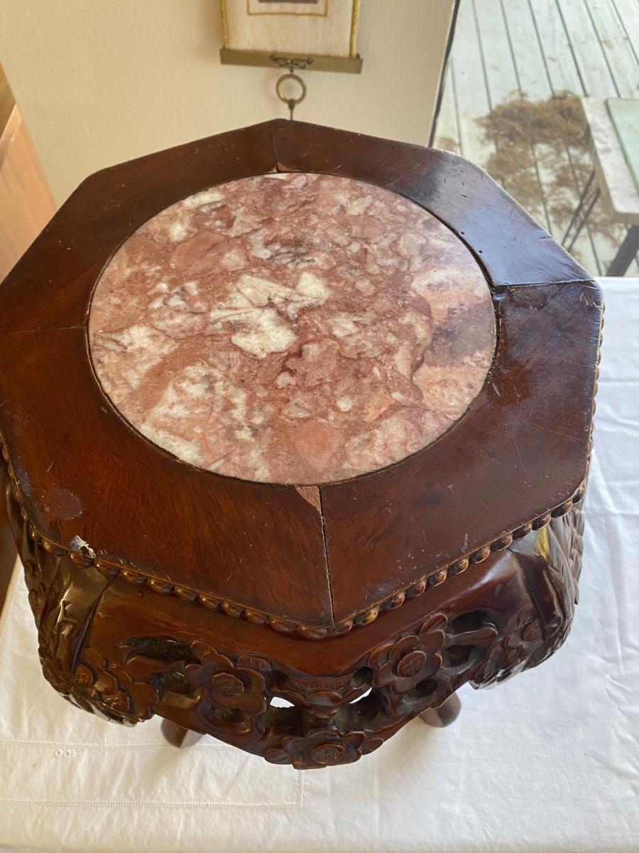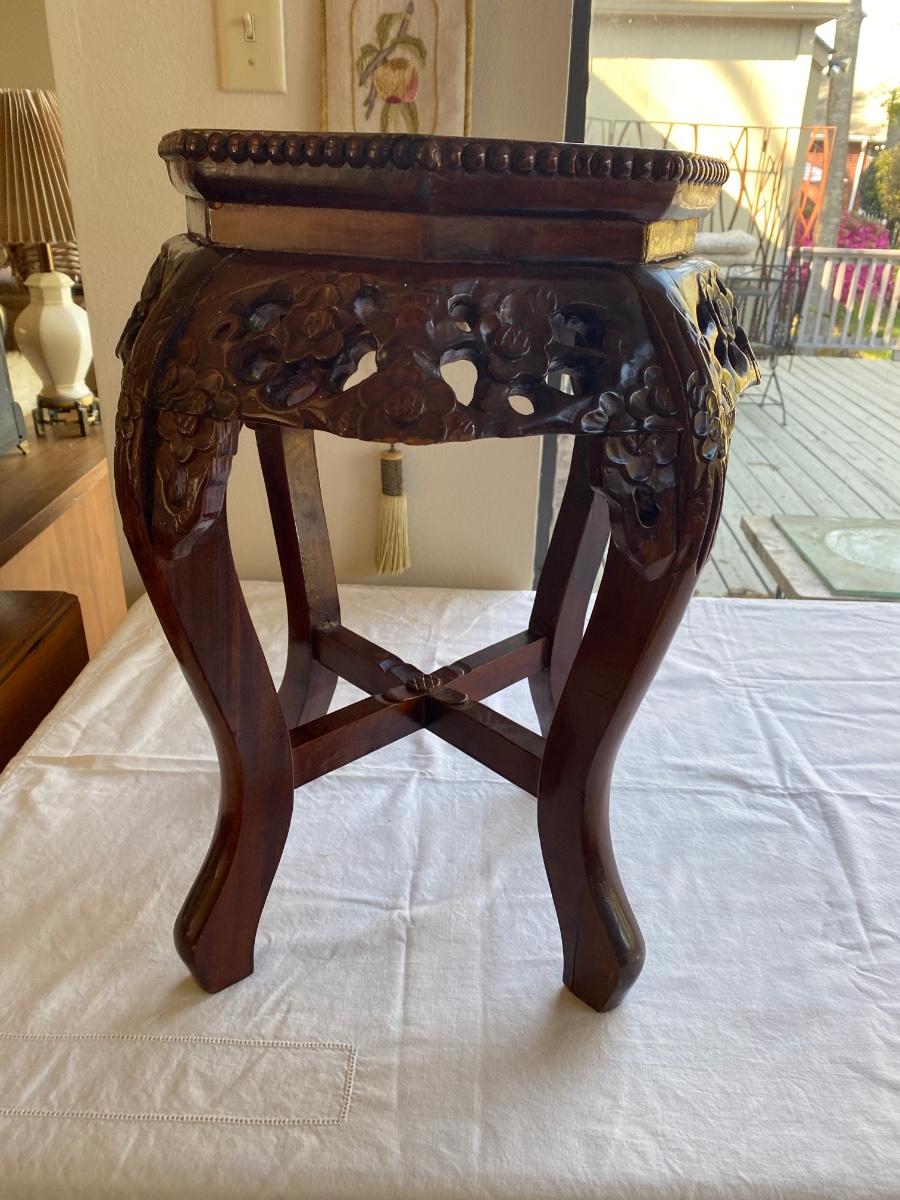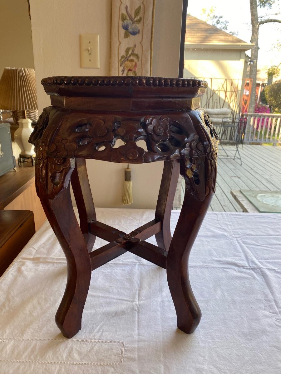 Vintage carved oriental table. Has minimal damage, otherwise in VG condition. 19-1/4h x 12w at the top. About 17w at widest point. #R-100