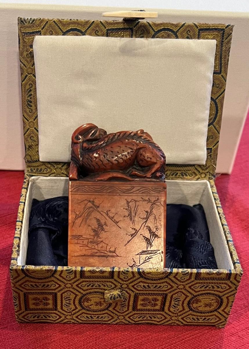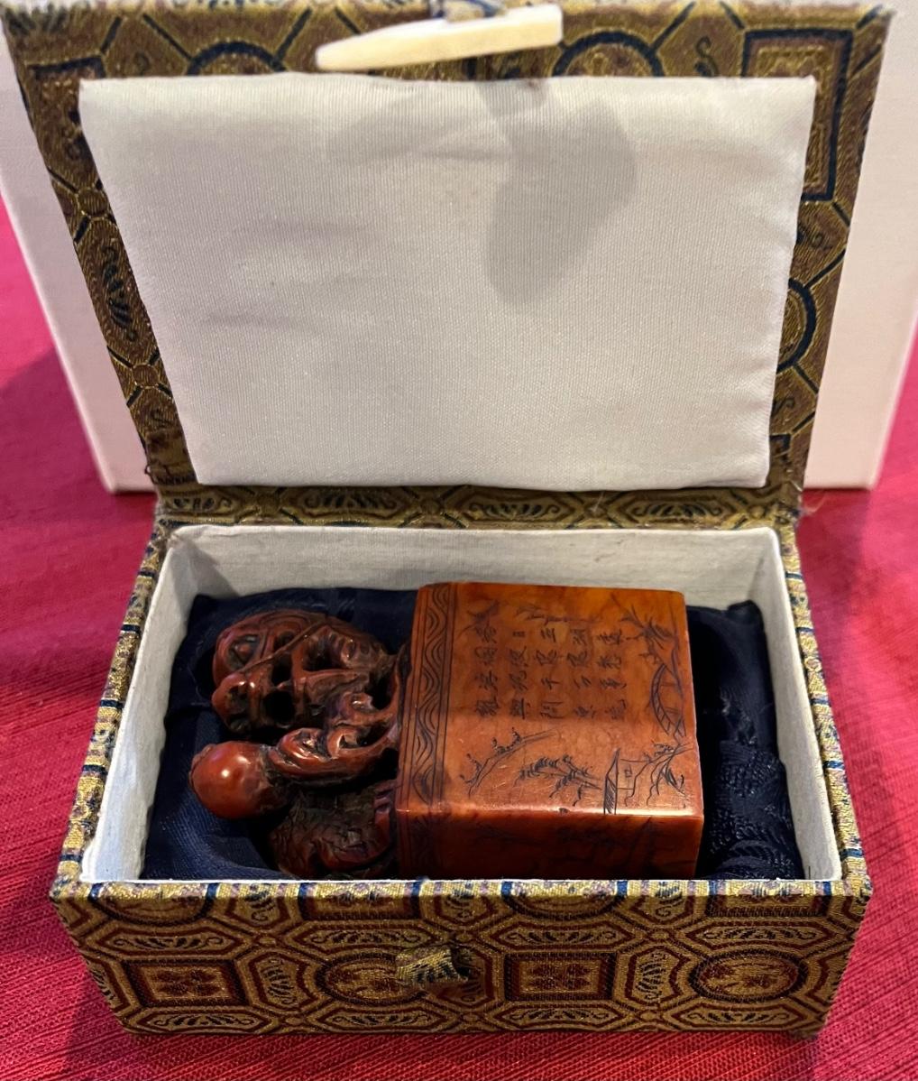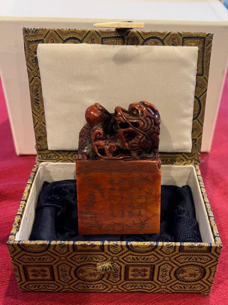 Vintage carved soap stone dragon stamped with case. See photos