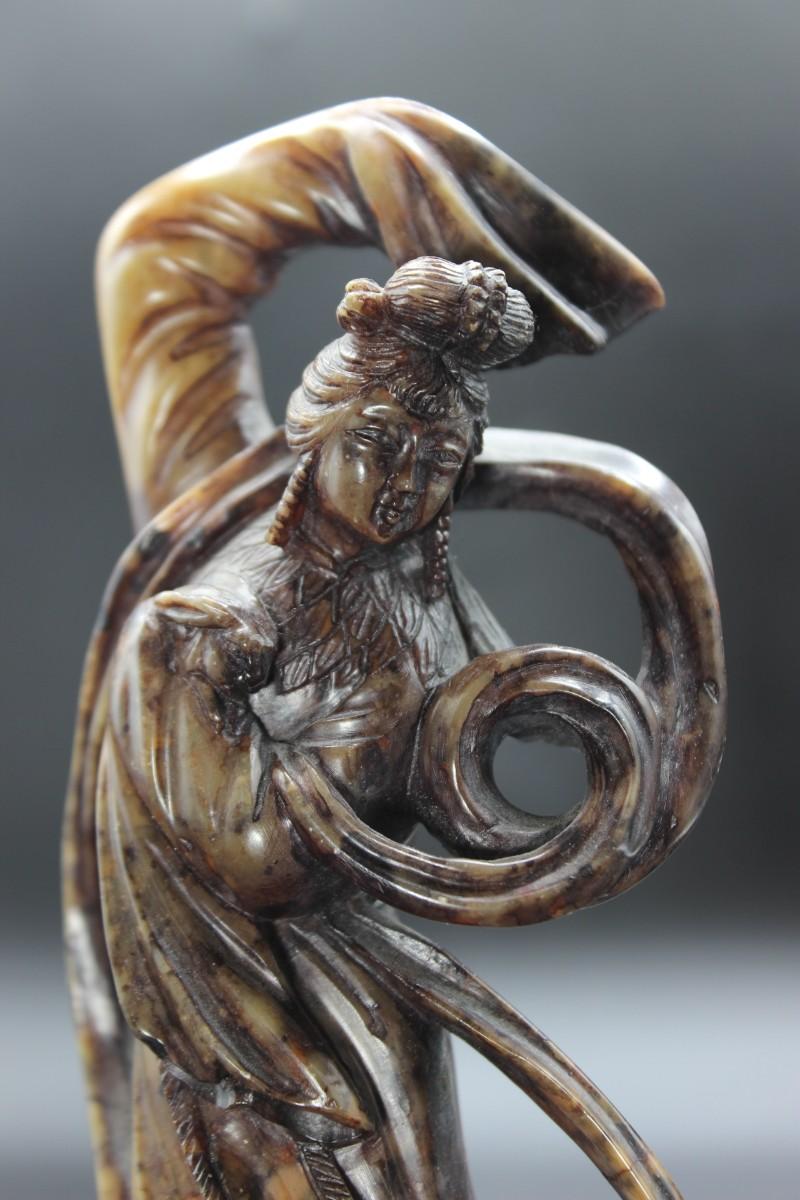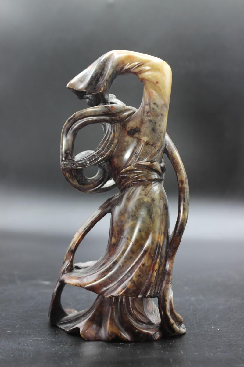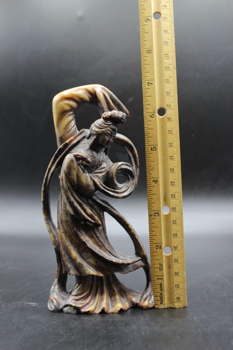 Carved dancing Geisha Asian woman. Looks to be made from soapstone. Nicely done statuette, about 7" tall. No damage noticed.