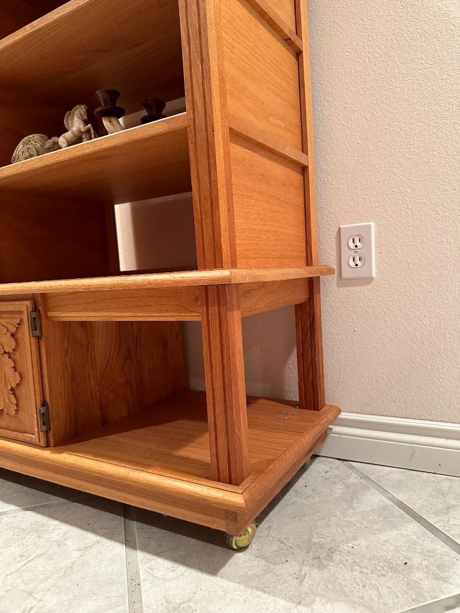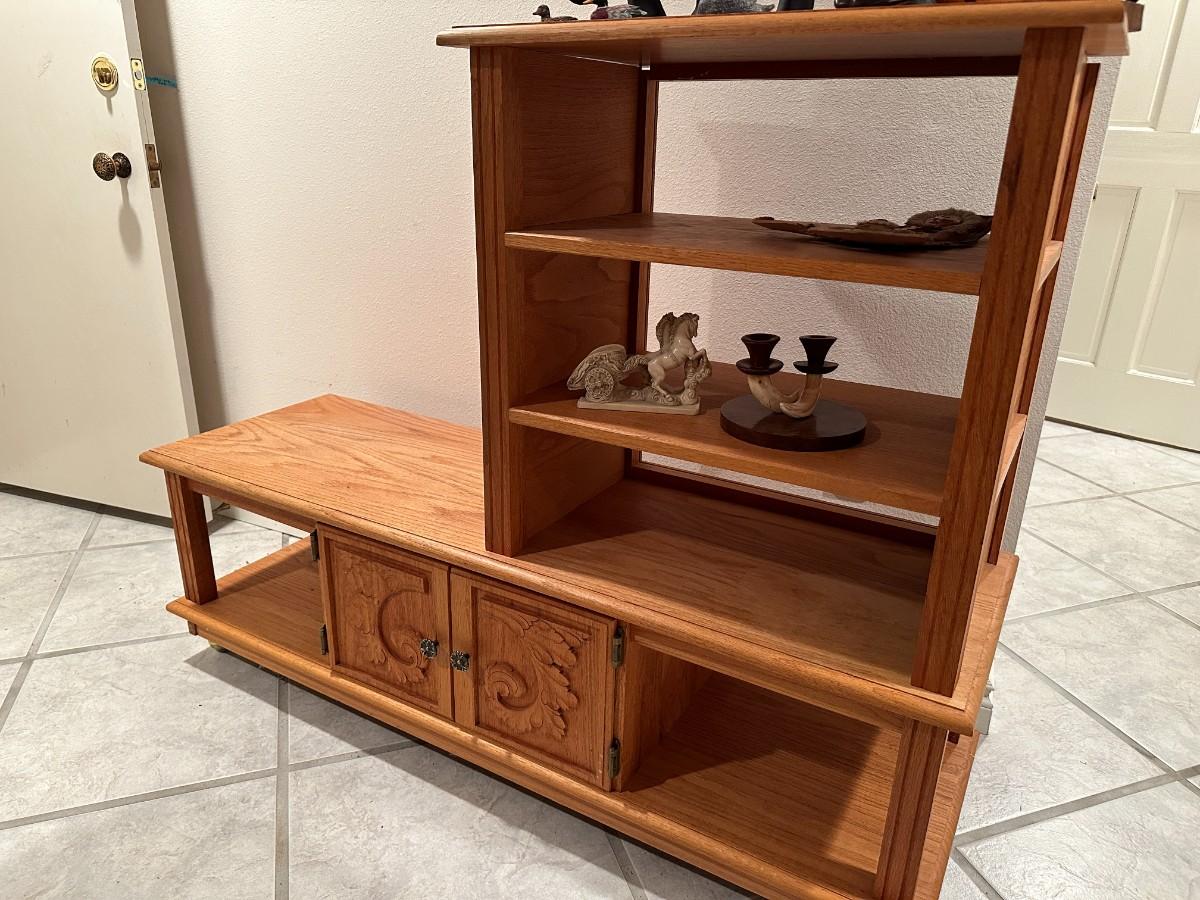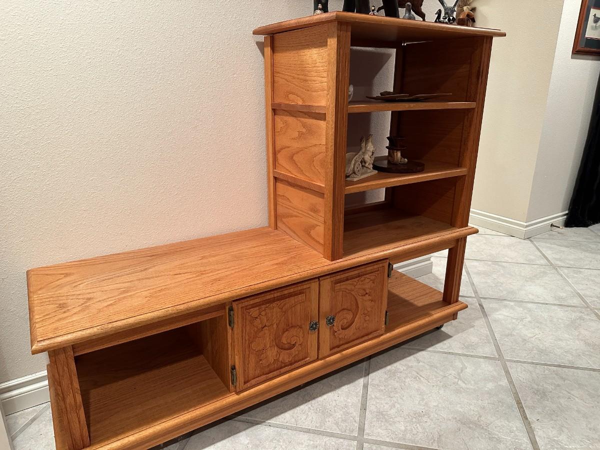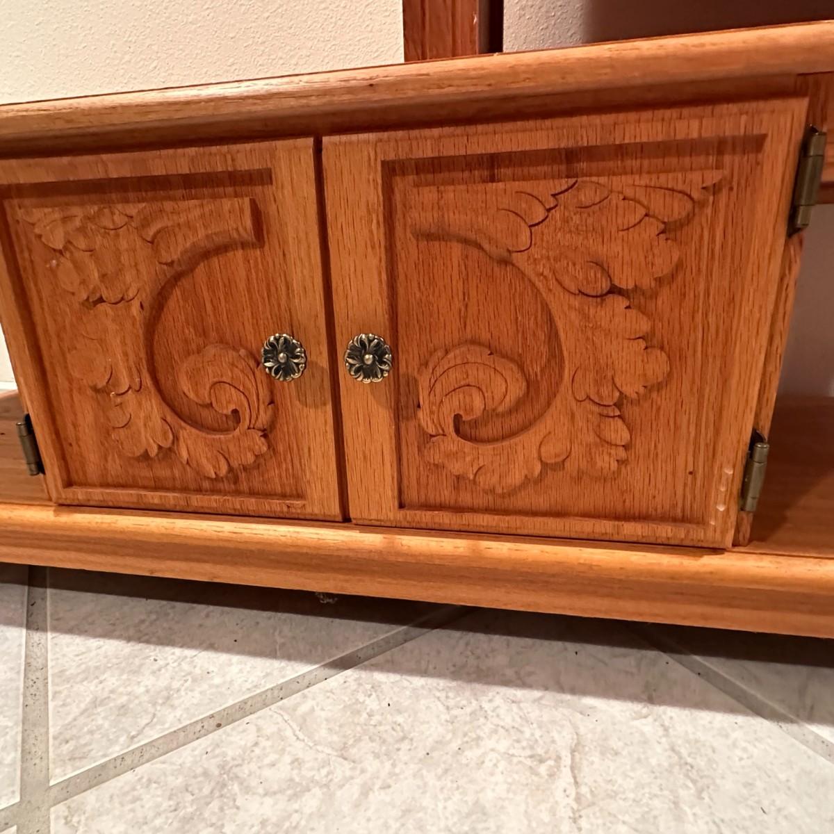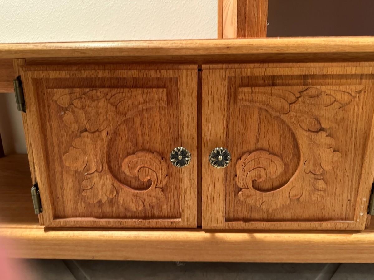 Vintage Carved Wood (nice light or blonde brown stain) Display Shelf and Storage Cabinet. In good condition, as shown in images.