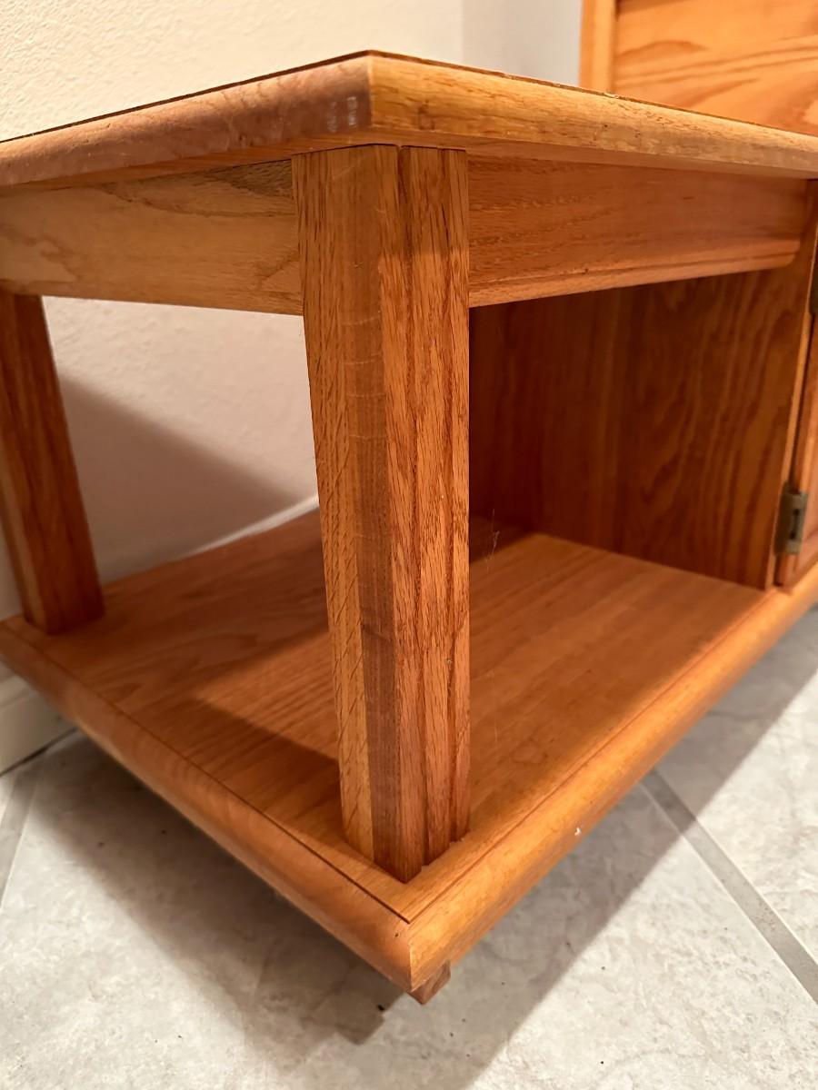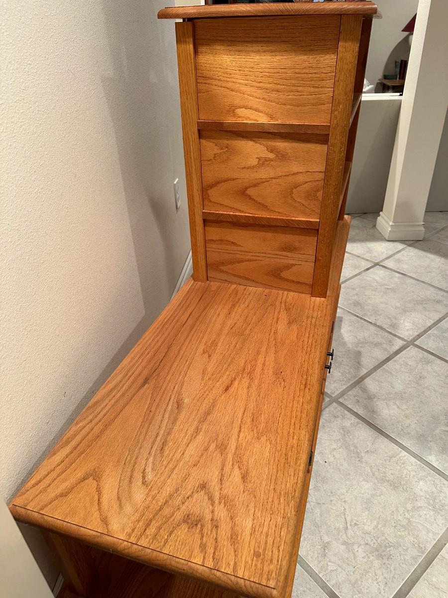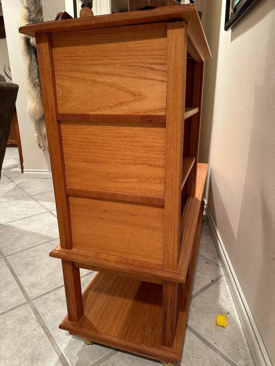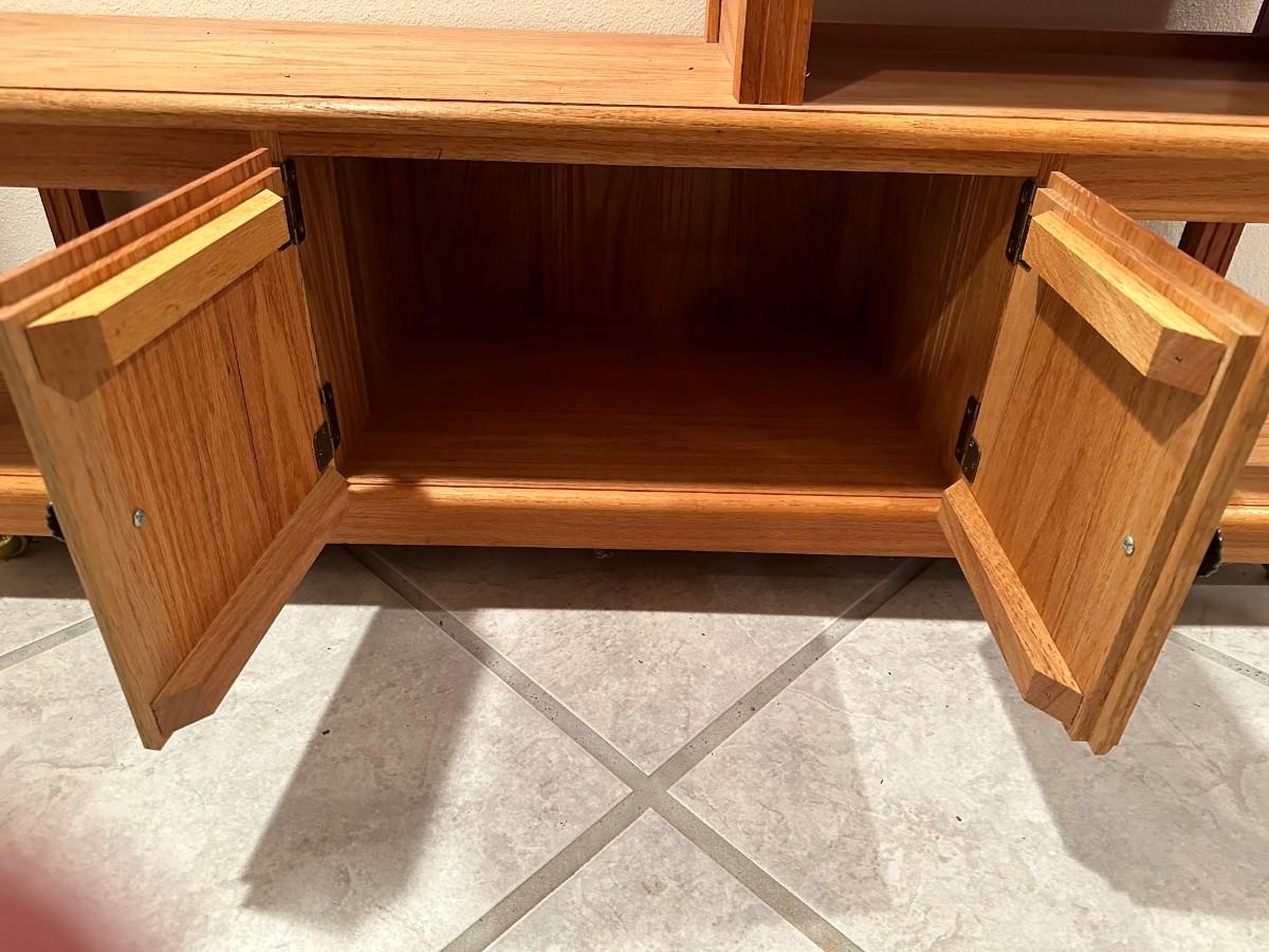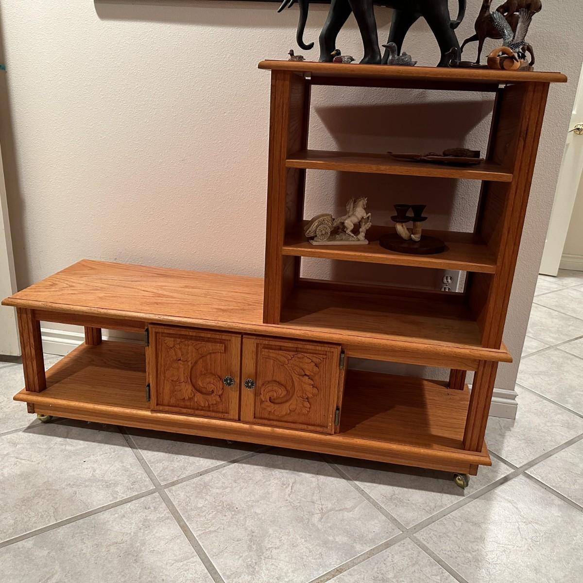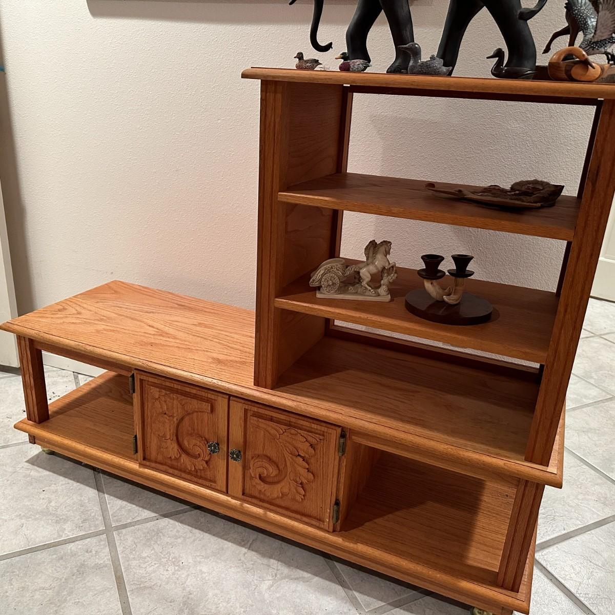 Vintage Carved Wood (nice light or blonde brown stain) Display Shelf and Storage Cabinet. In good condition, as shown in images.