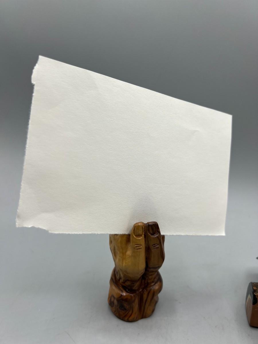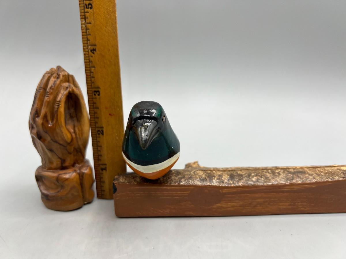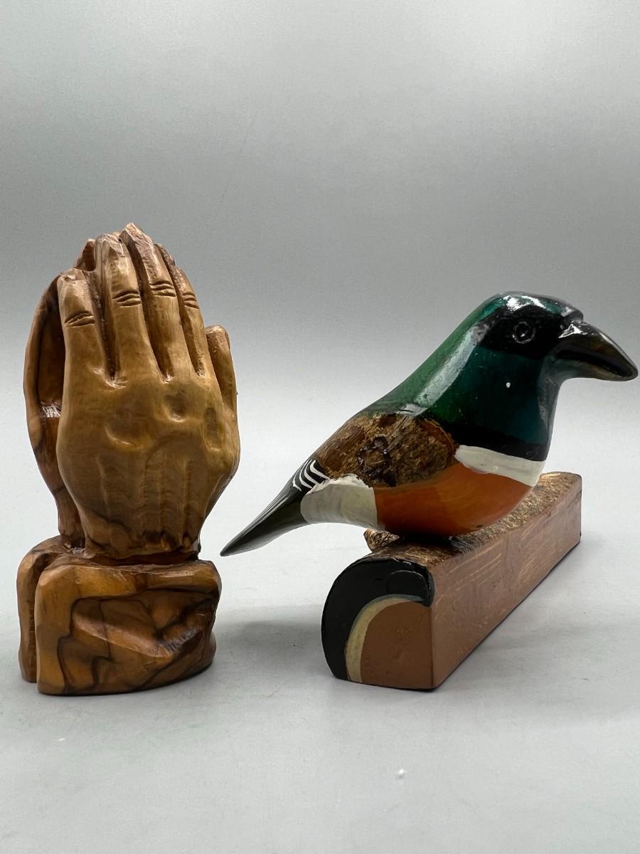 Vintage Carved Wood Photo Card Holder Figurines. Pair of praying hands and a bird on a log. Both can hold notes, photo, or card.