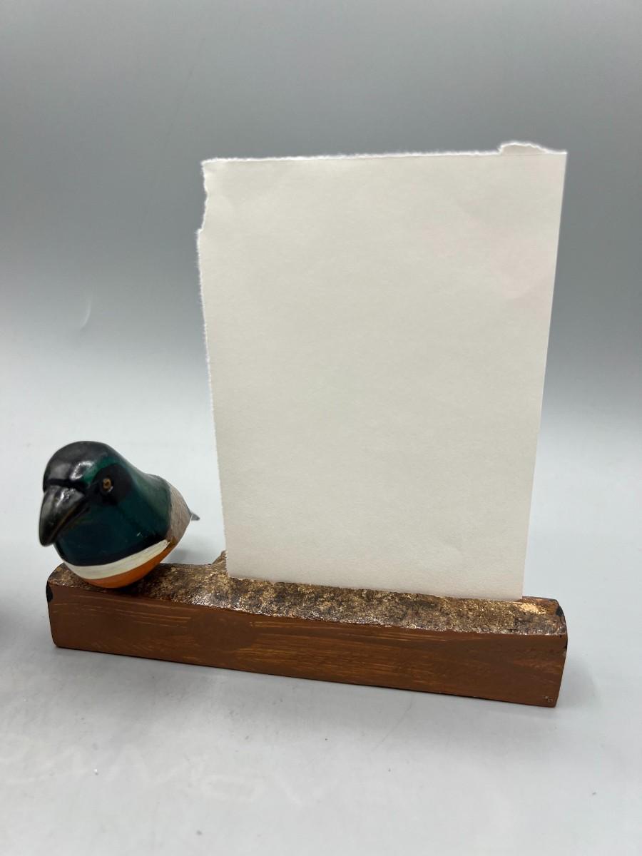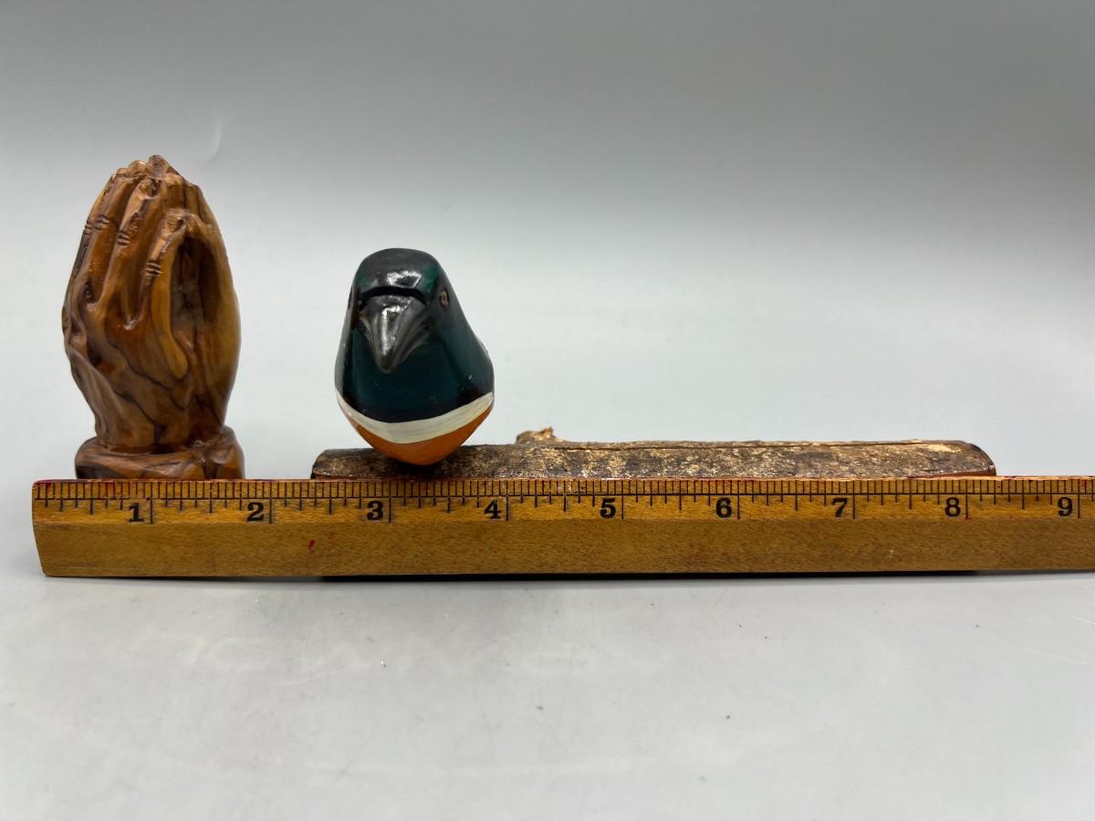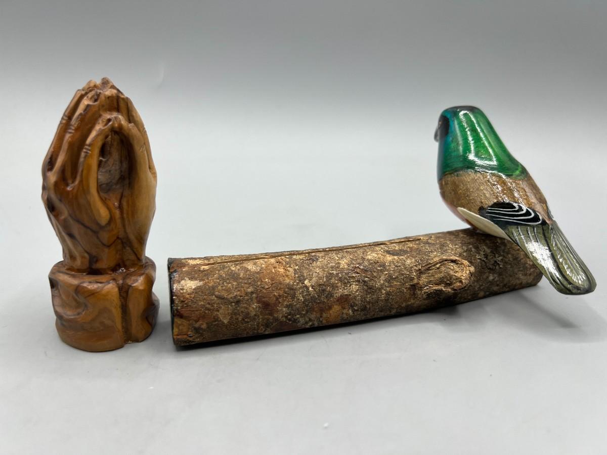 Vintage Carved Wood Photo Card Holder Figurines. Pair of praying hands and a bird on a log. Both can hold notes, photo, or card.