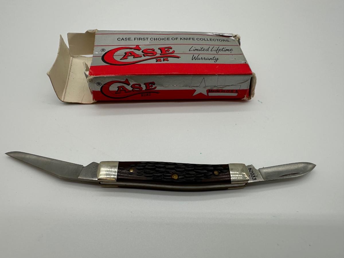 Vintage Case XX pocket knife, pattern 62033, featuring a two-blade configuration with jigged dark handle scales and nickel silver bolsters. Blades marked CASE XX and 62033. Includes the original Case box. Made in the USA by W.R. Case & Sons Cutlery Co. Classic collectible Case pattern.