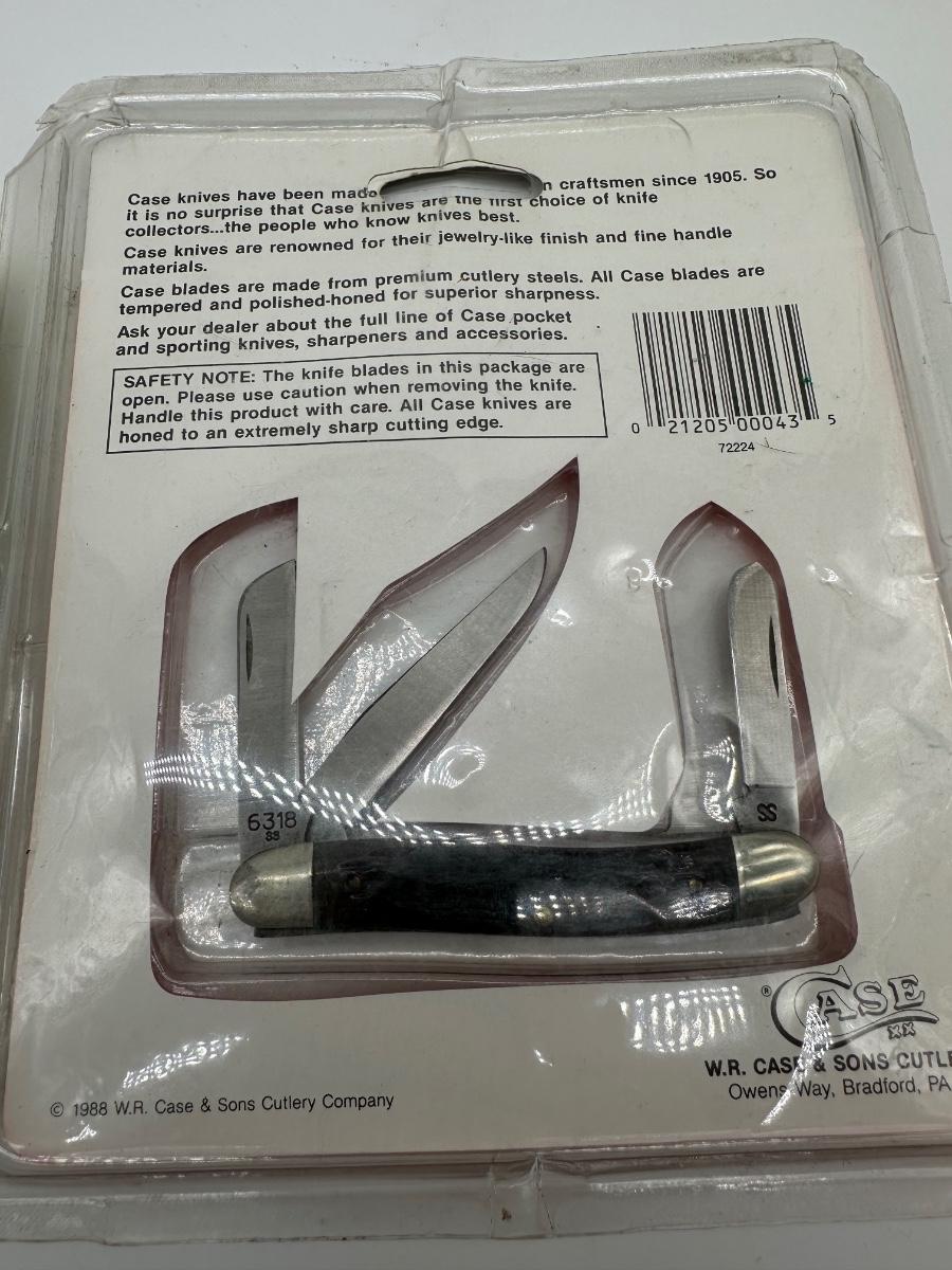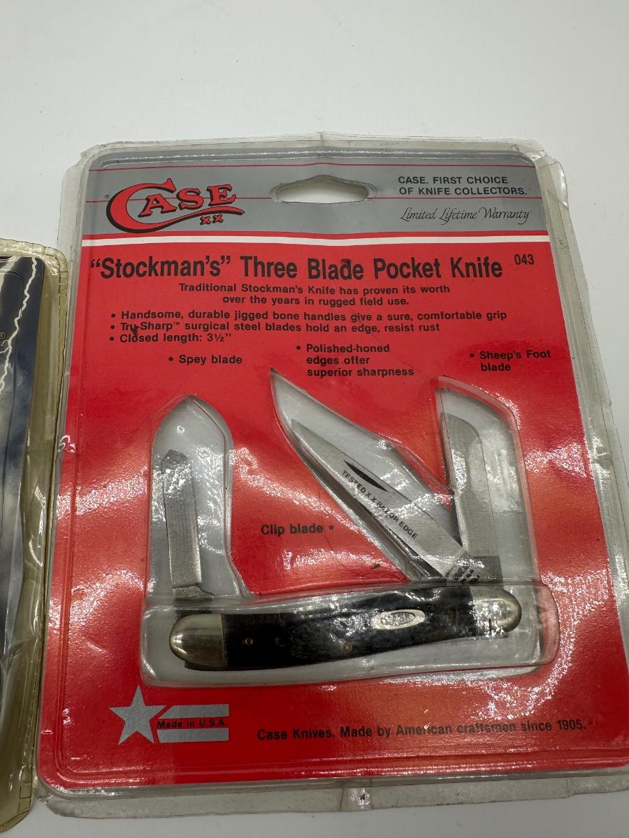 Lot includes two new-in-package pocket knives. First is a Case XX Stockman Three-Blade Pocket Knife, model 6318 SS, featuring clip, spey, and sheep’s foot blades with jigged bone handles. Made in the USA and still sealed in original 1988-era packaging.