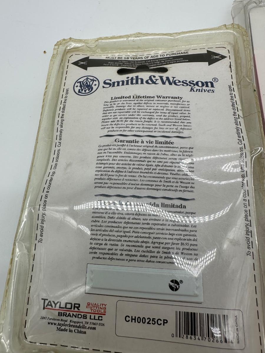 Also included is a Smith & Wesson folding knife, model CH0025CP, stainless steel blade with black handle, factory sealed in original blister pack. Both knives are unused and ideal for collectors or everyday carry.