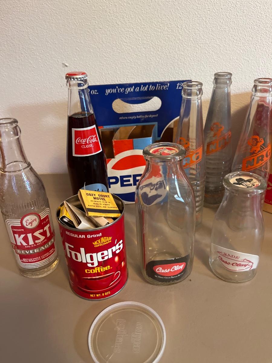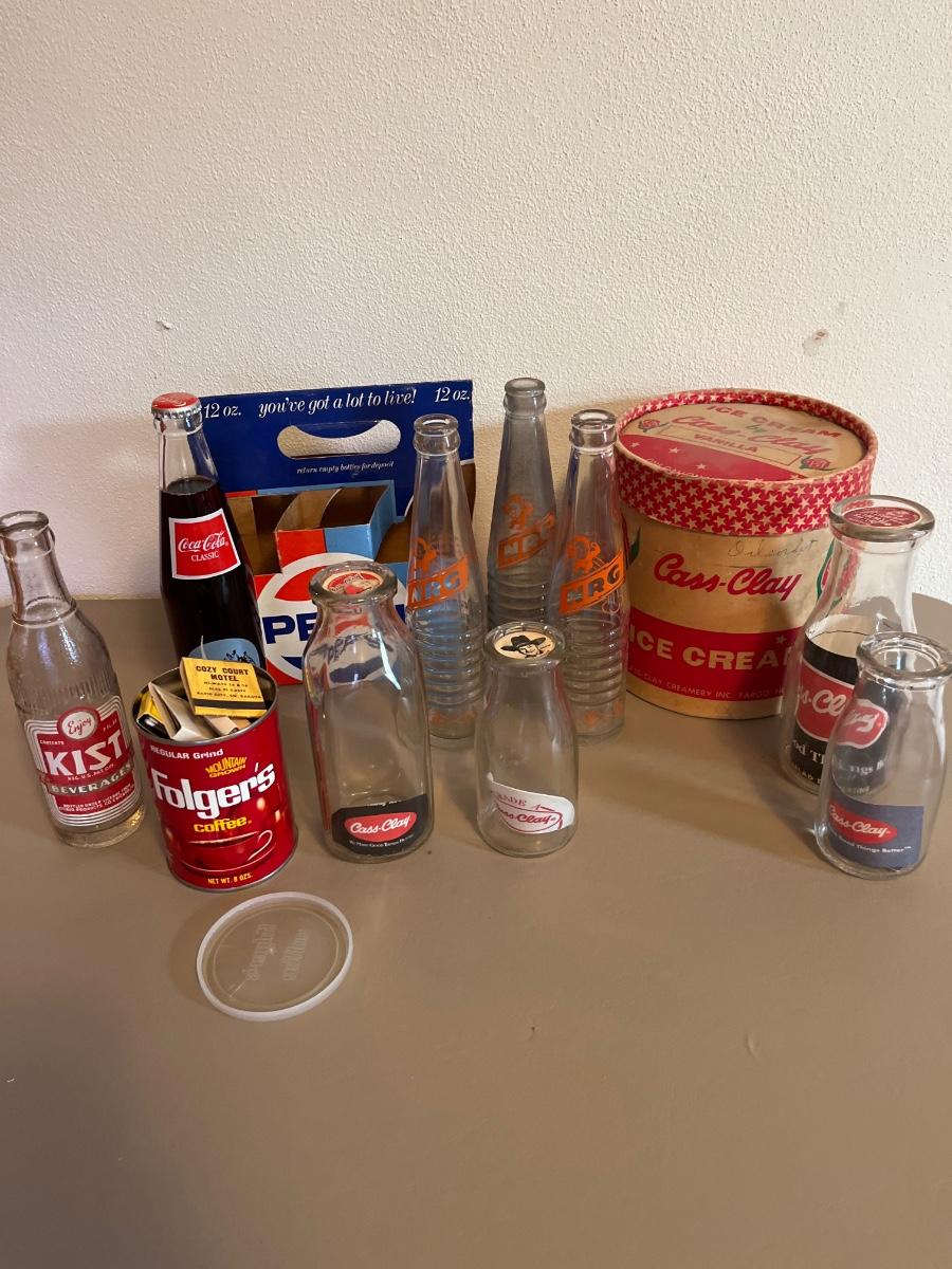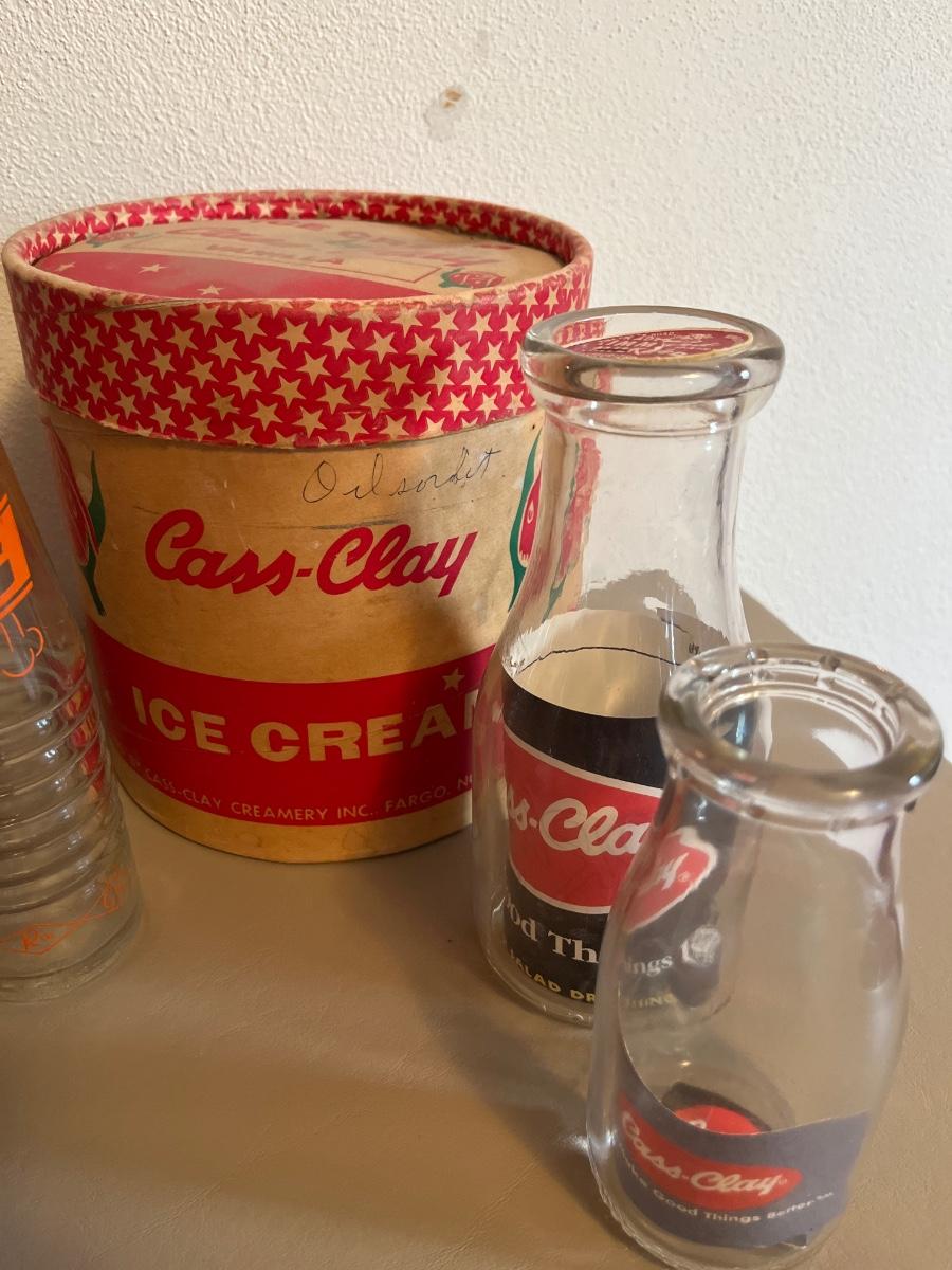 Vintage Cass Clay Paper Ice Cream tub, milk bottles & soda bottles