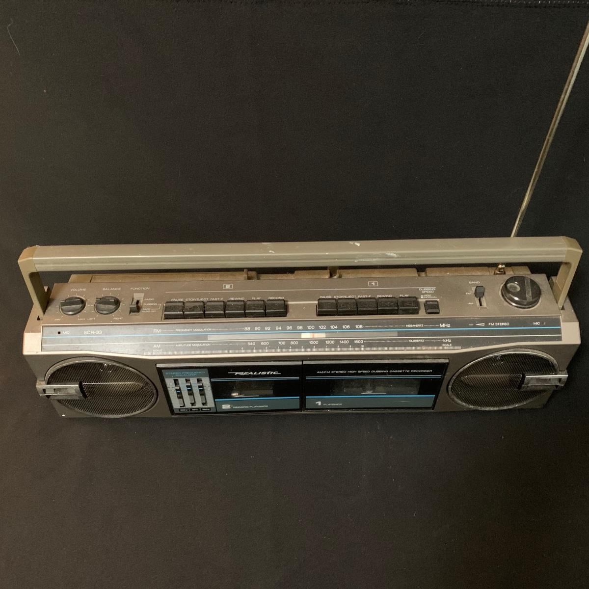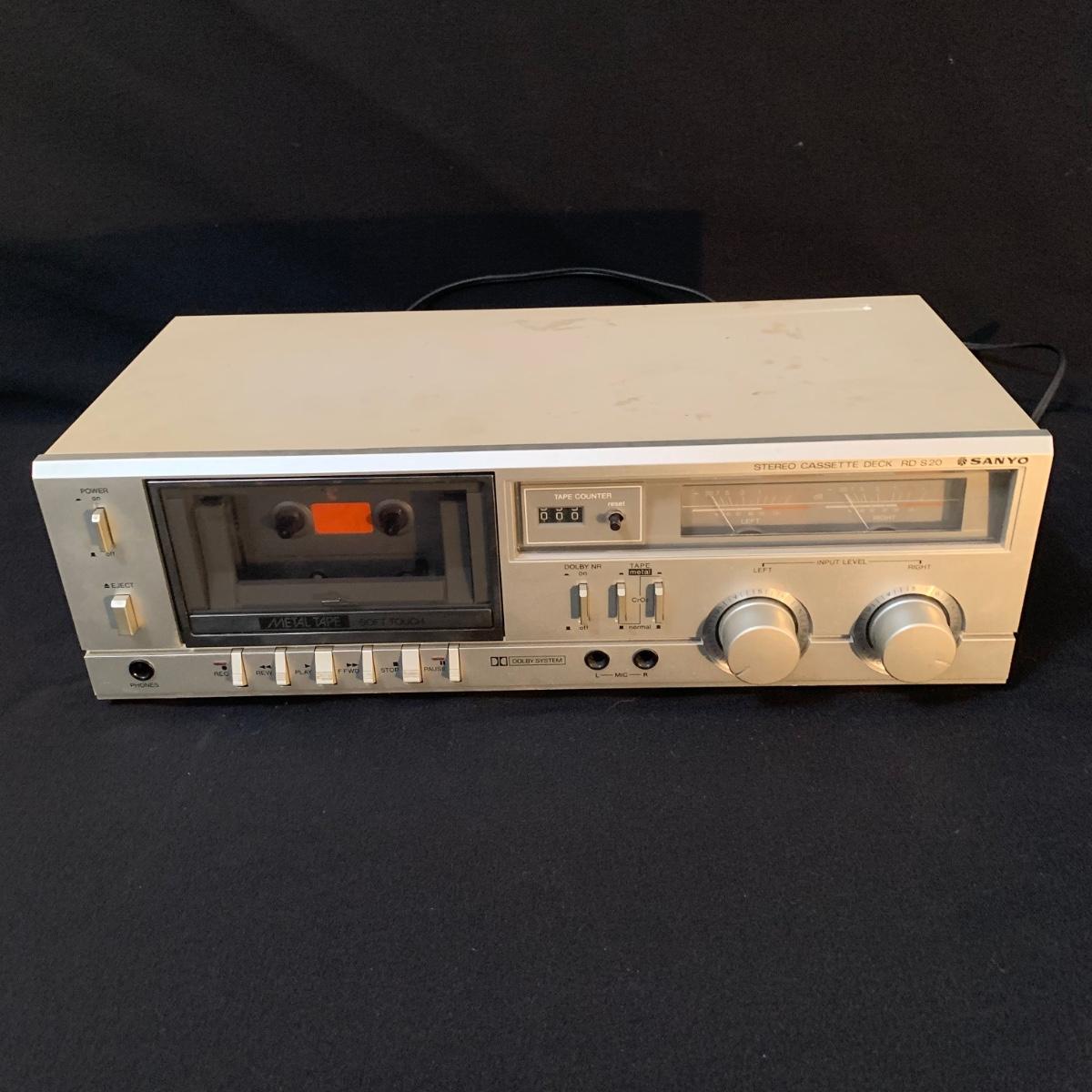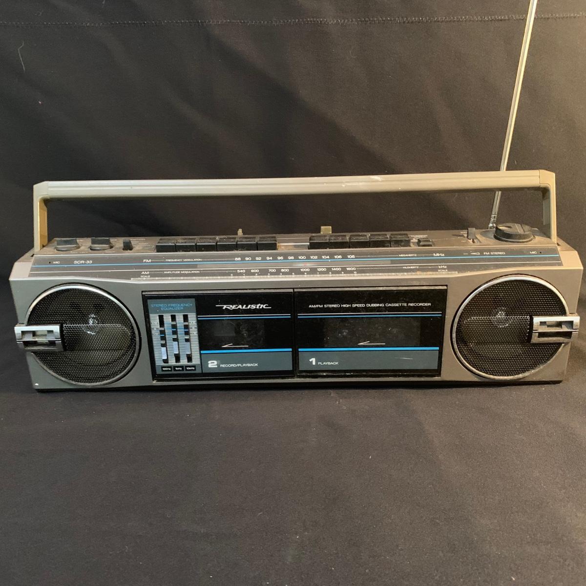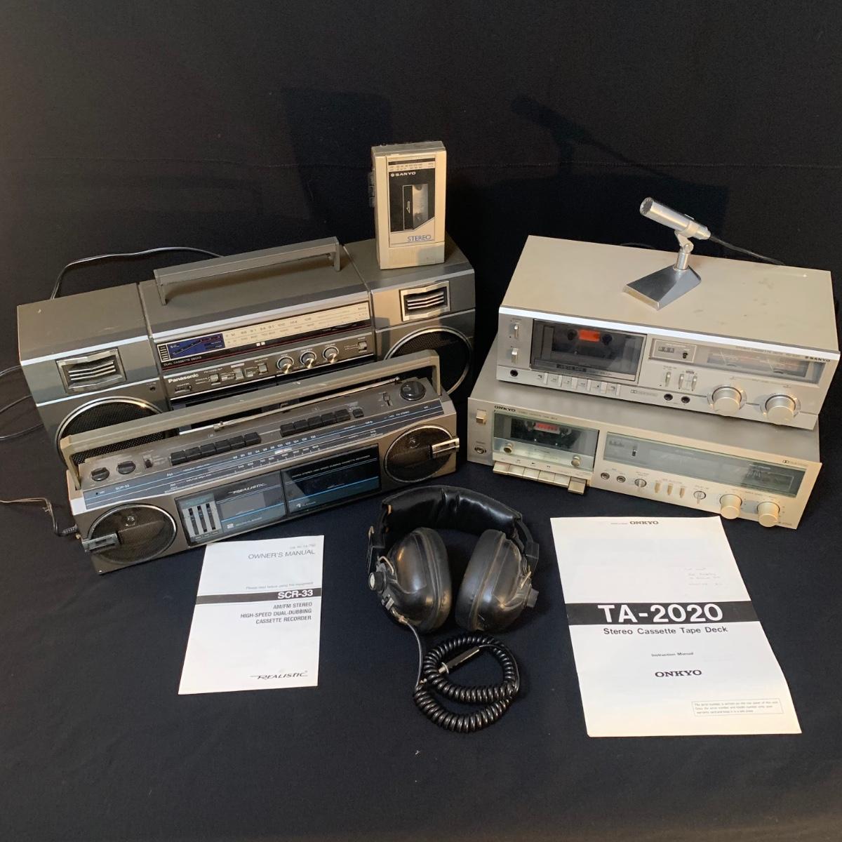 This vintage cassette collection includes a Realistic SCR-33 High Speed Dual-Dubbing Cassette Recorder Stereo, LEBO TA-320 8-OHM headphones, Lafayette microphone, Sanyo Stereo Cassette Deck RD S20, Onkyo TA-2020 Stereo Cassette Deck, and Panasonic RX-5285 Stereo. This collection is perfect for recording and playing cassettes. All items power on. The Panasonic stereo powers on, however doesn’t appear to function. Could likely be useful for parts. Largest cassette deck is the Onkyo. It measures, 16.5”L x 9.5”L x 5”H. The Sanyo and Onkyo decks power on. We are unable to test output functionality. Microphone and headphones have not been tested.