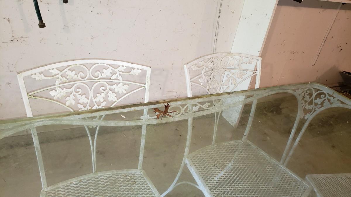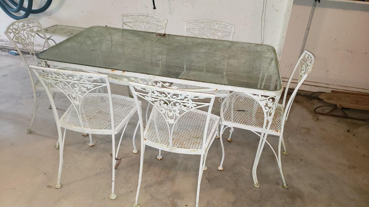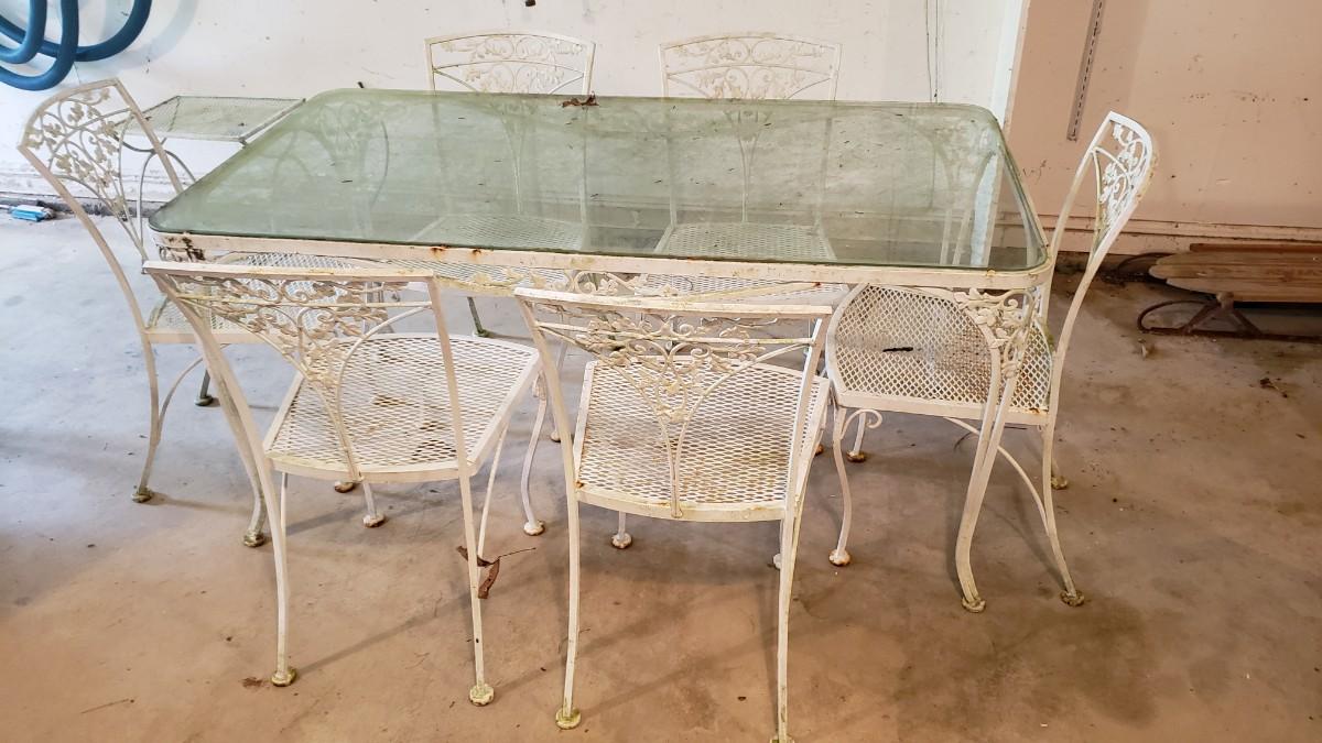 1950's Woodard Acorn and Vine wrought iron and glass patio Garden Table and 6 chairs
