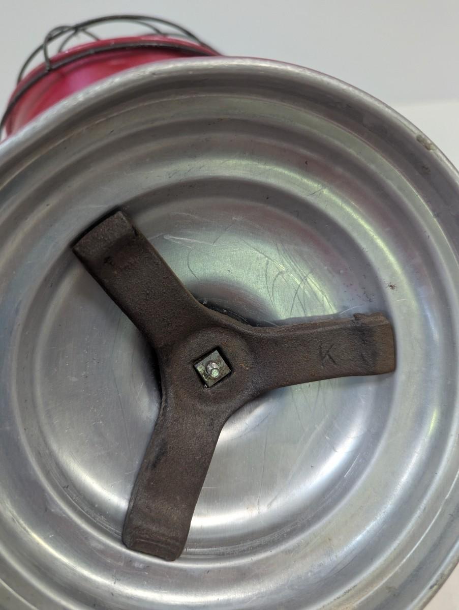 The red housing shows wear, a dent, and some paint is missing in spots.