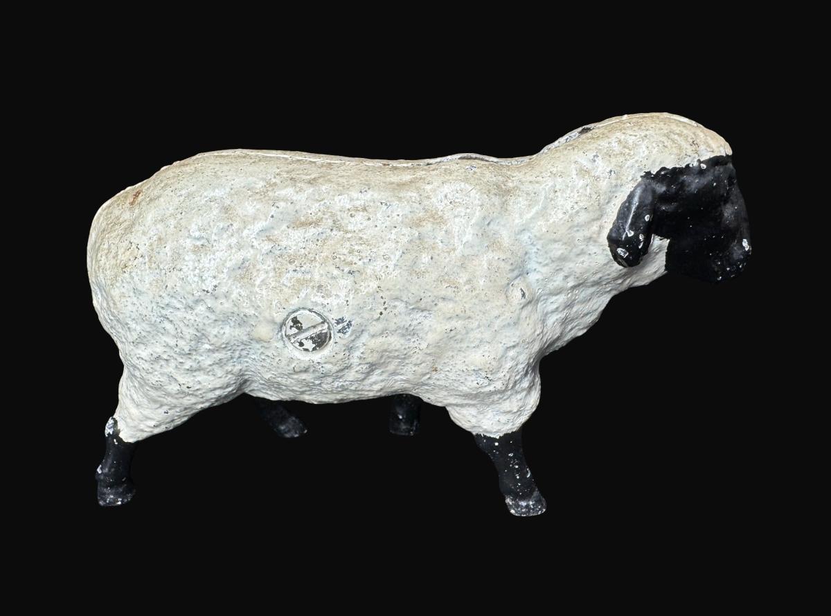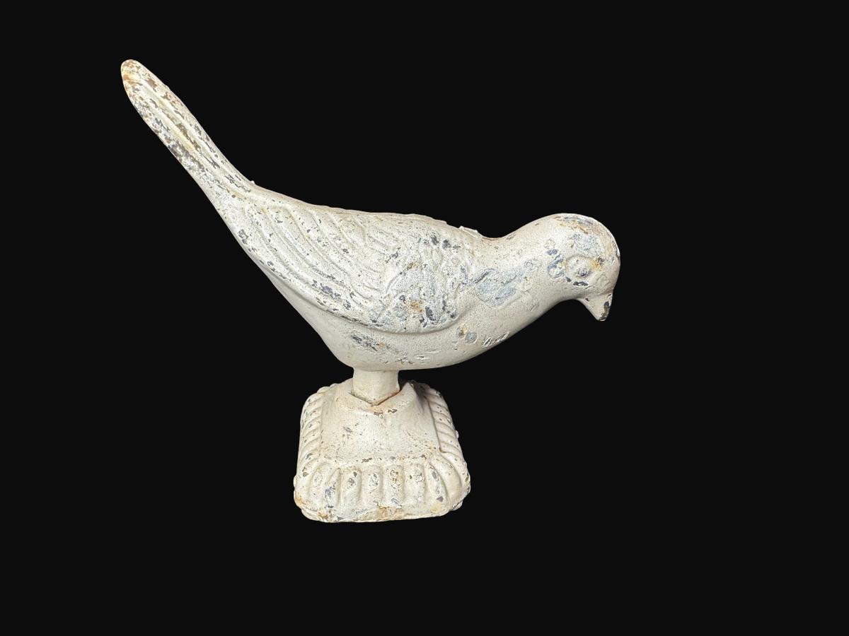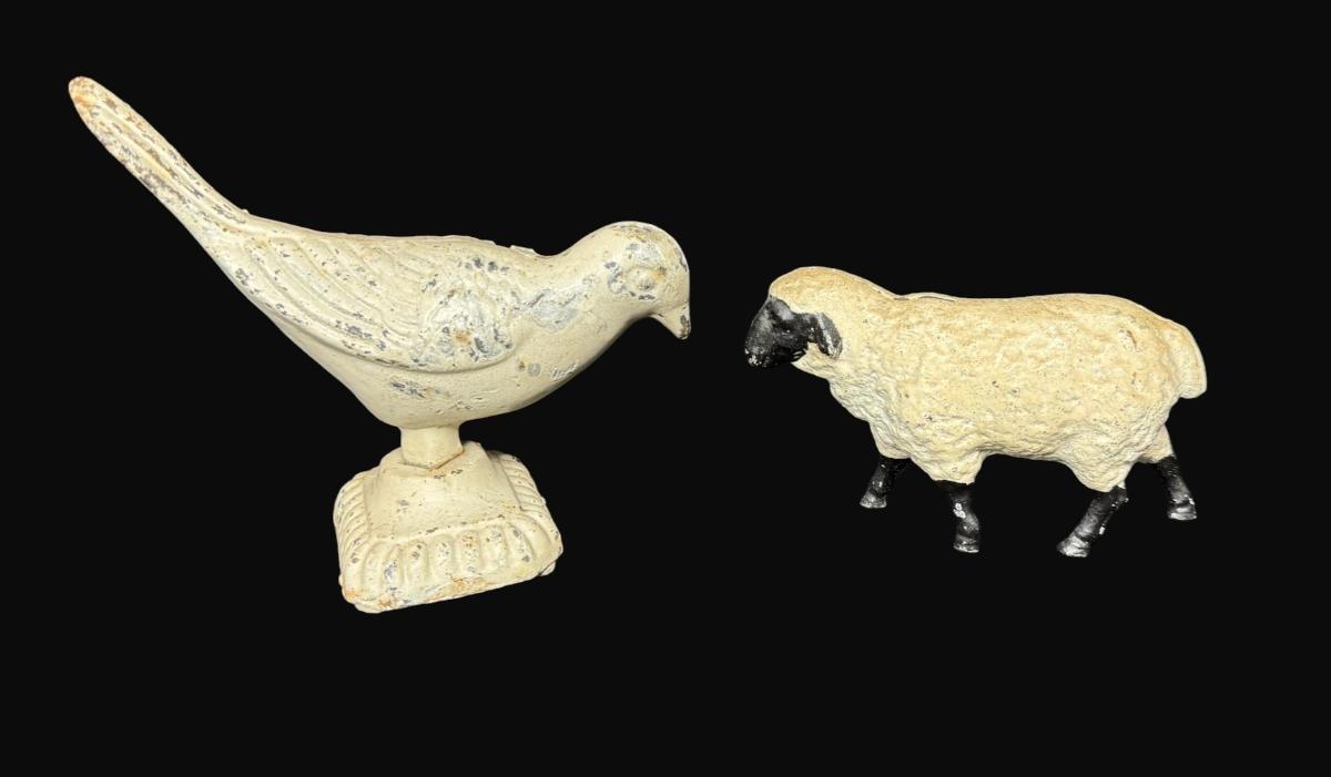This assortment includes a cast iron sheep bank and cast iron bird doorstop/paperweight. Tallest is 6". Age related wear and paint loss. [CS]