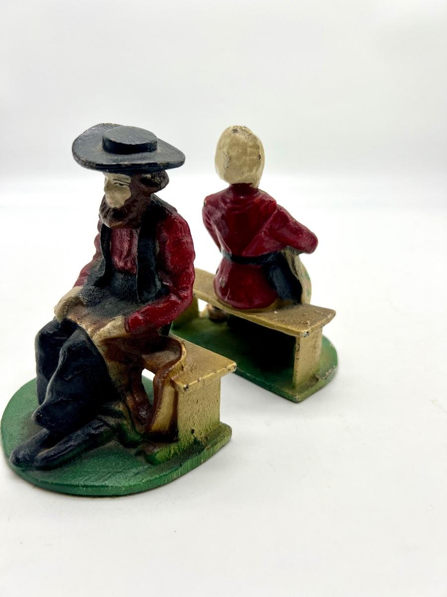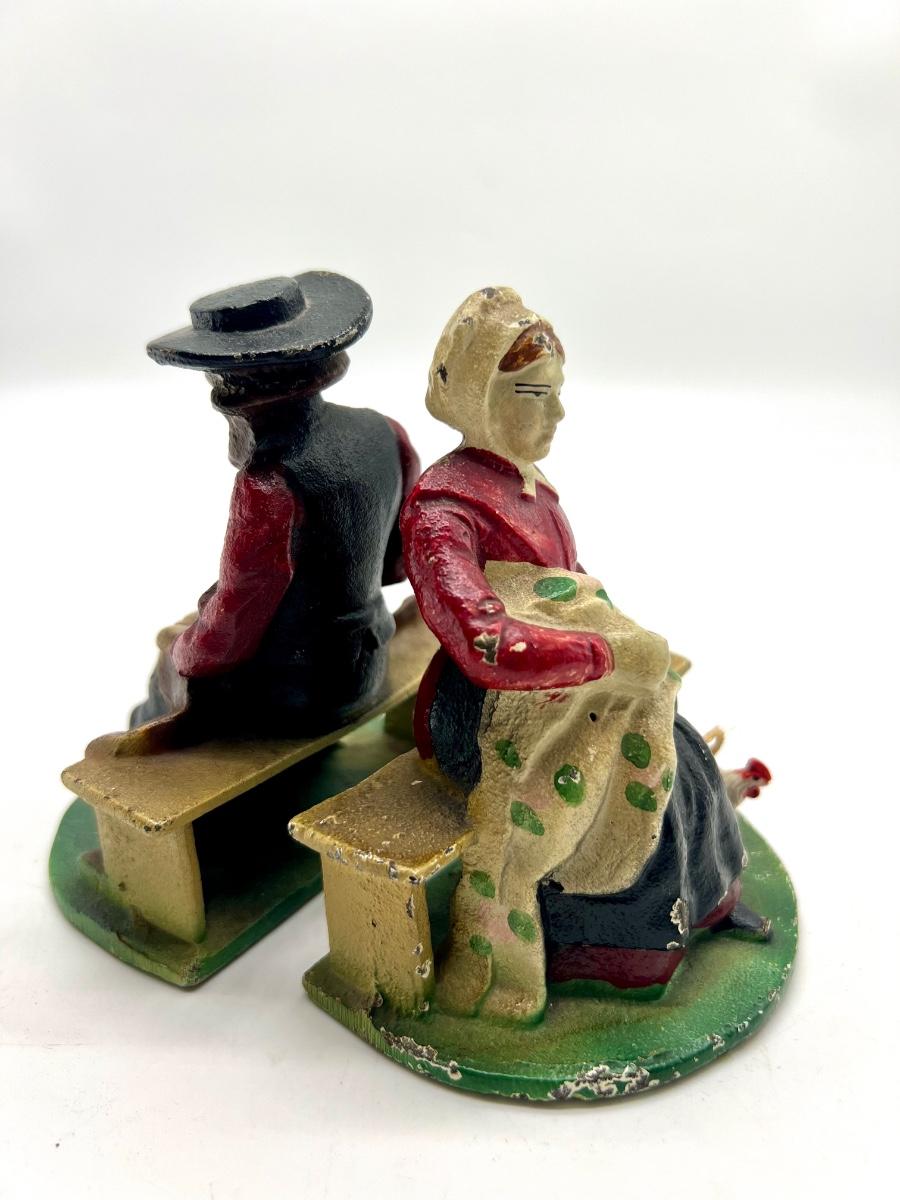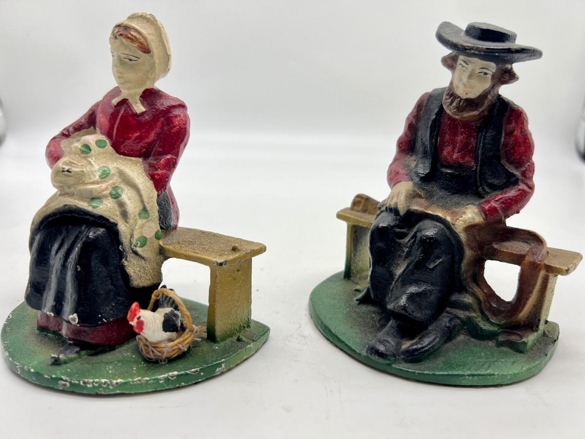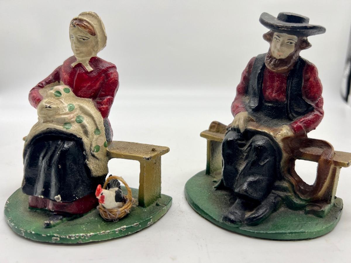 Vintage Pair of Cast Iron Book Ends / Door Stops Amish Man & Woman. Measures approximately 5 inches tall.