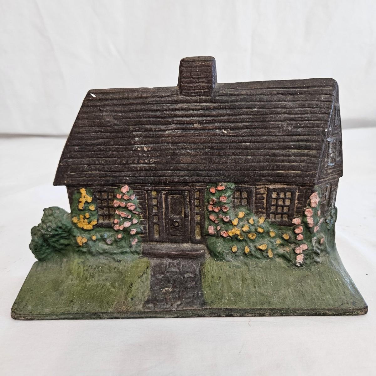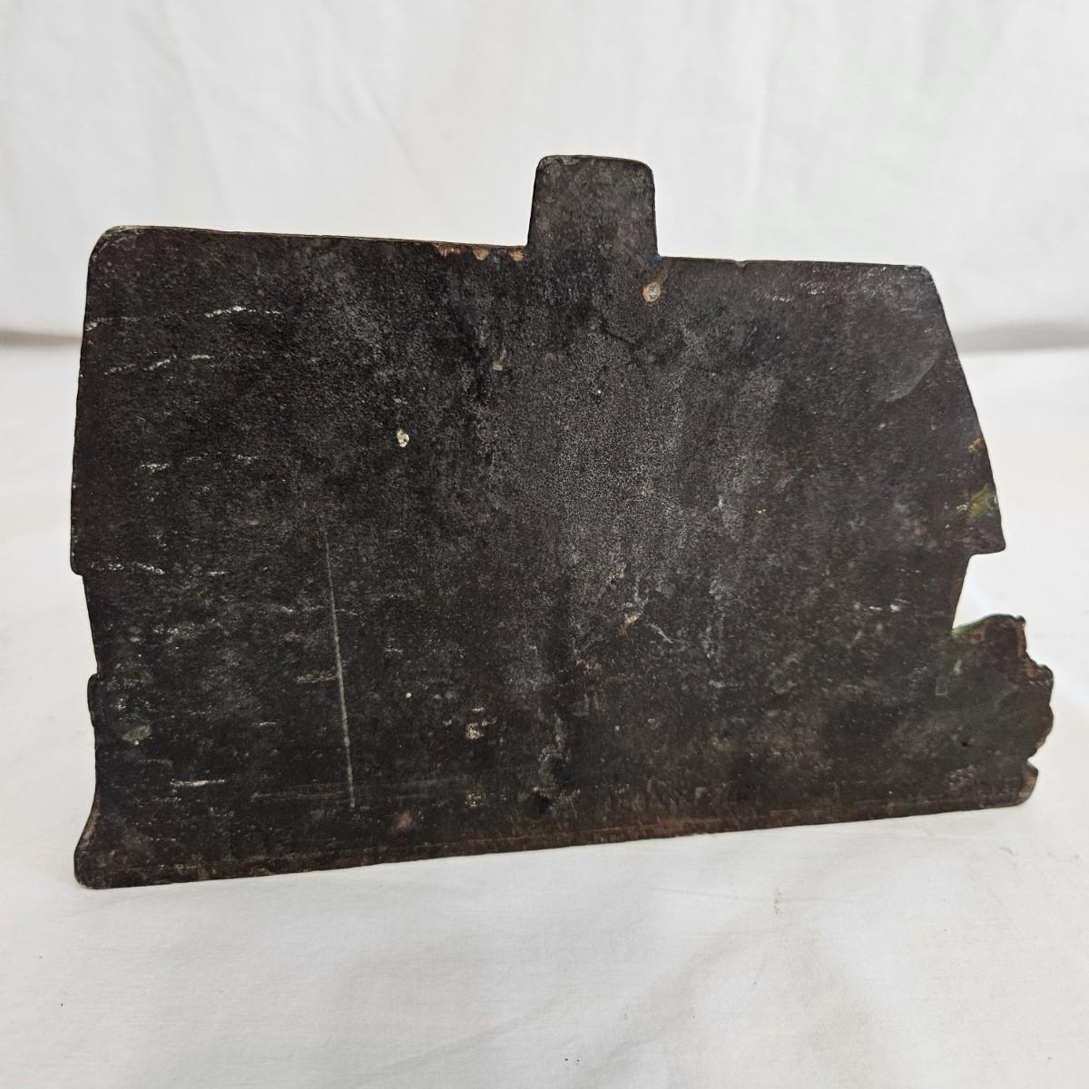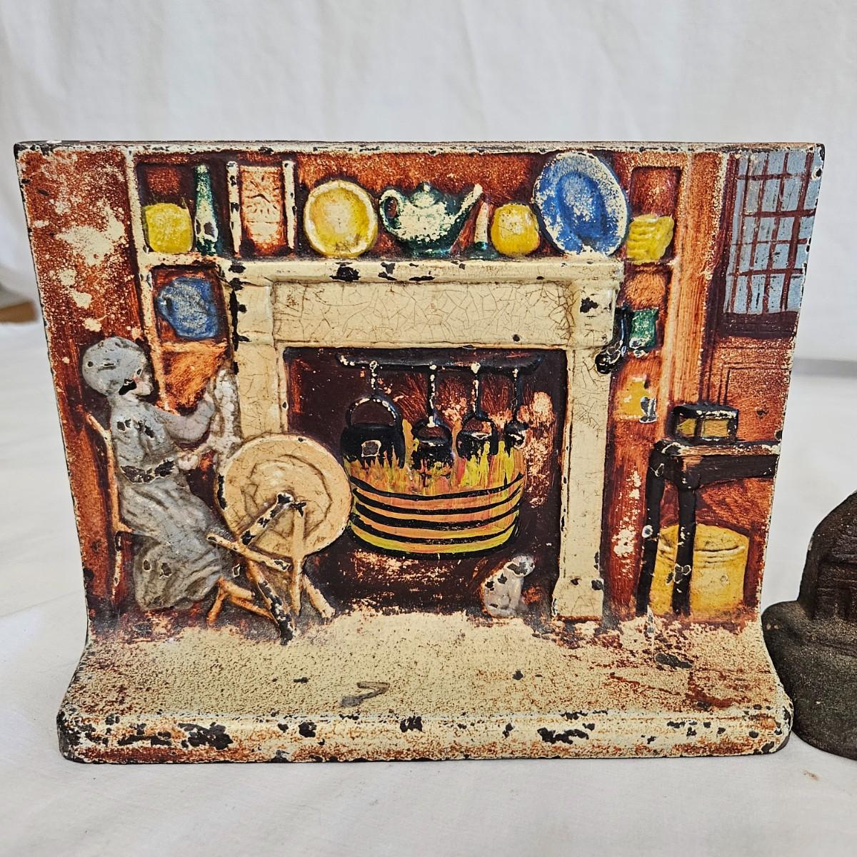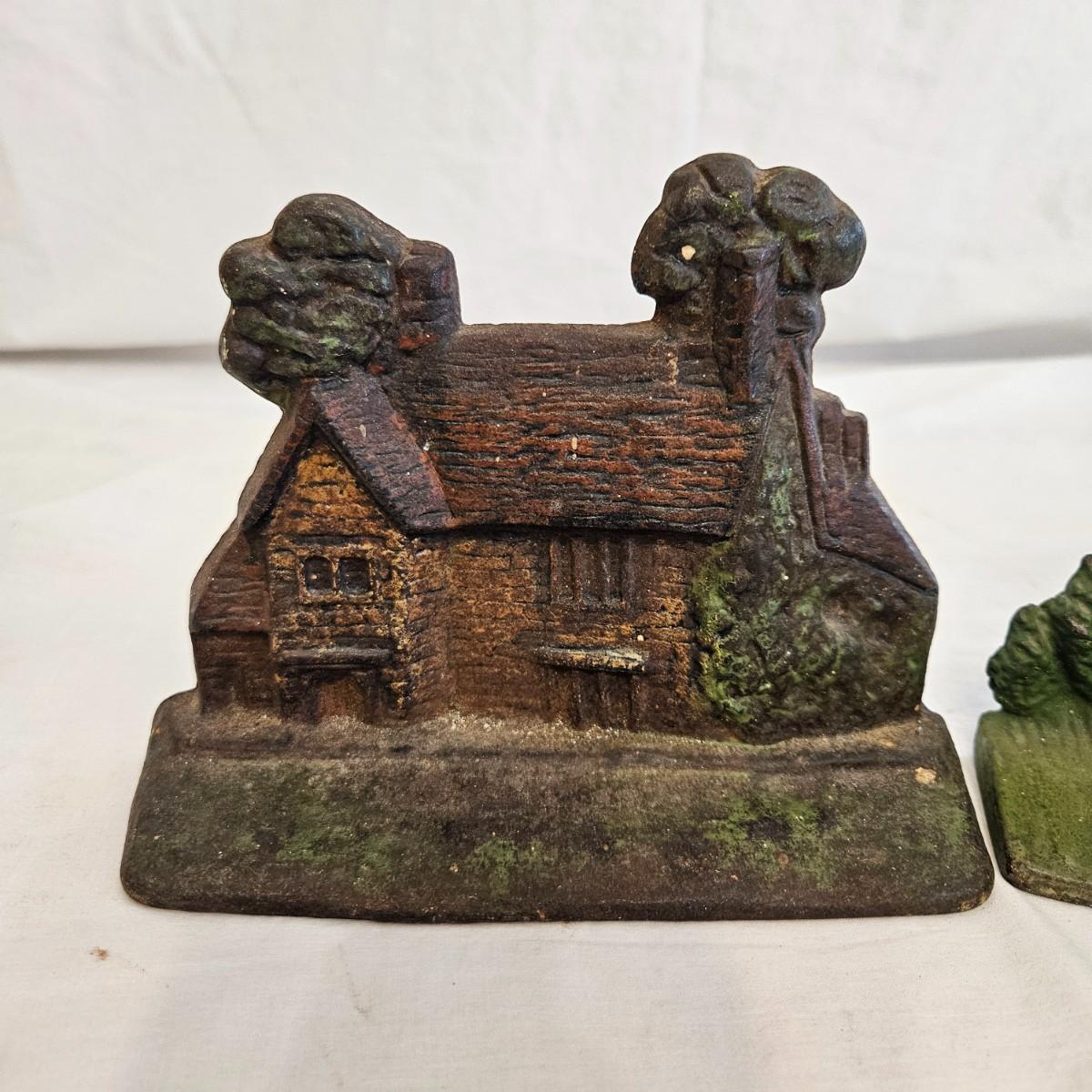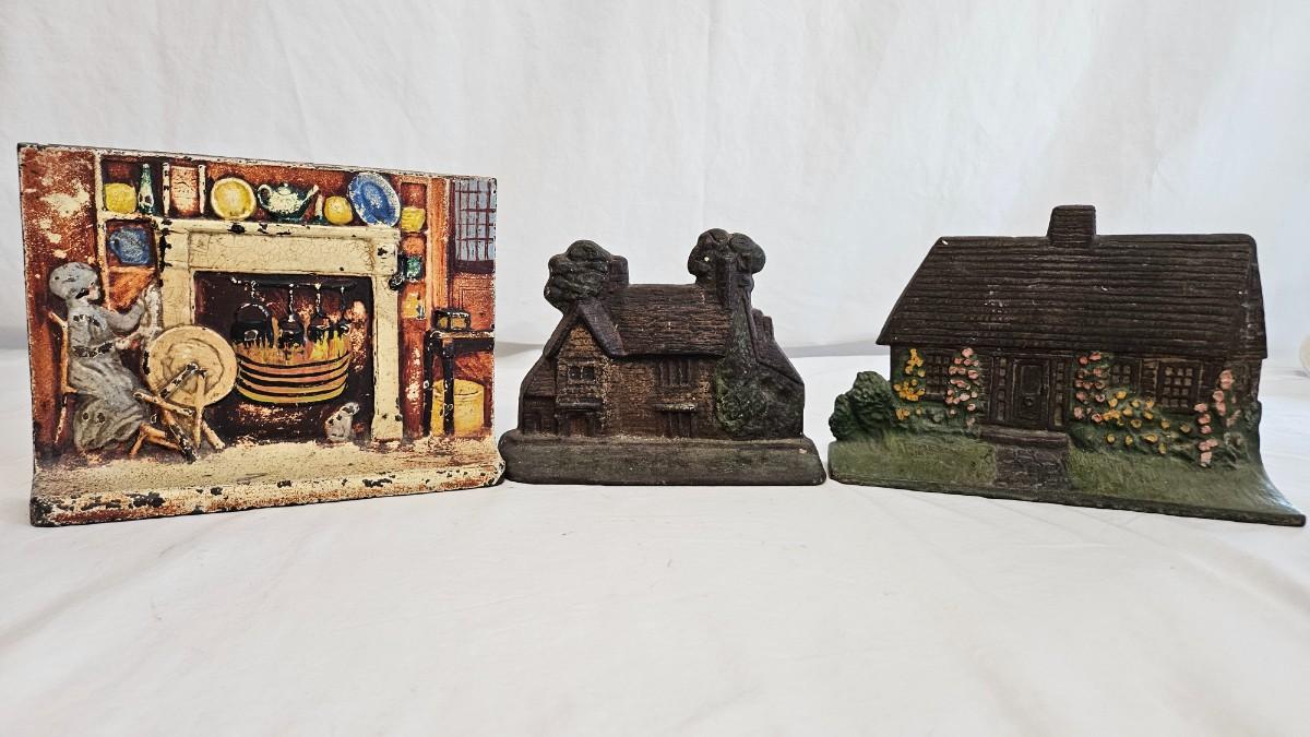 A set of three vintage cast iron door stops. The fireplace piece has Eastern Specialty Cast on its back, and the larger house is marker with Albany Foundry and measures approximately 9" x 2" x 6"H. Shipping available