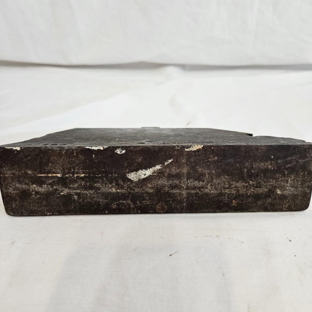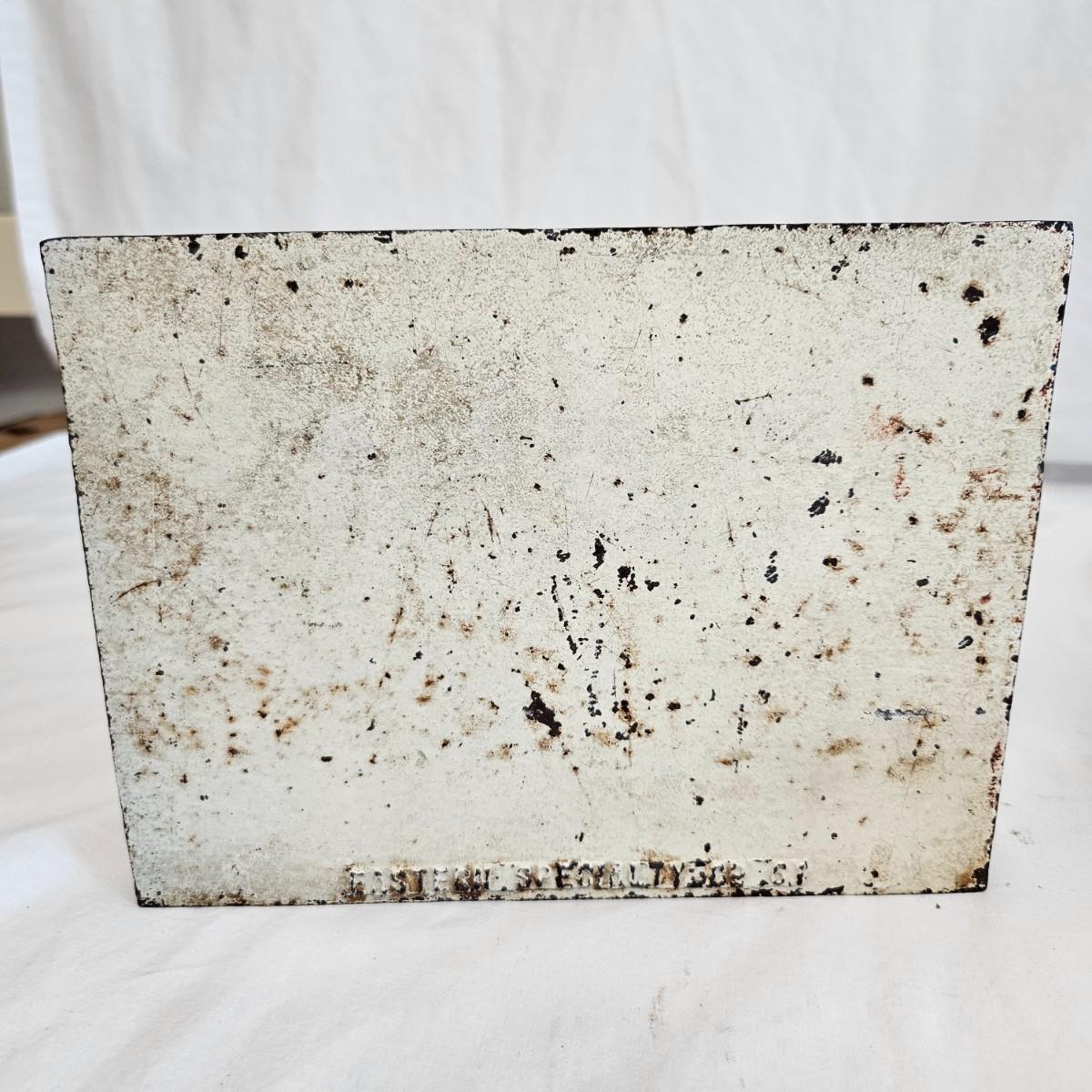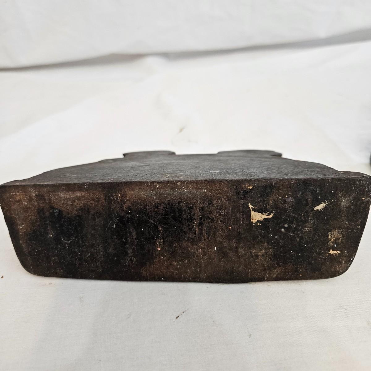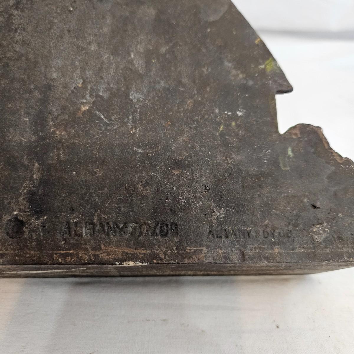 A set of three vintage cast iron door stops. The fireplace piece has Eastern Specialty Cast on its back, and the larger house is marker with Albany Foundry and measures approximately 9" x 2" x 6"H. Shipping available