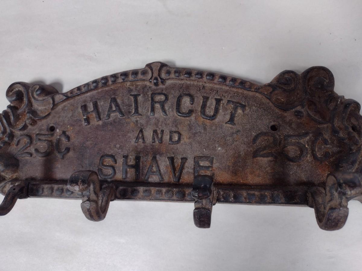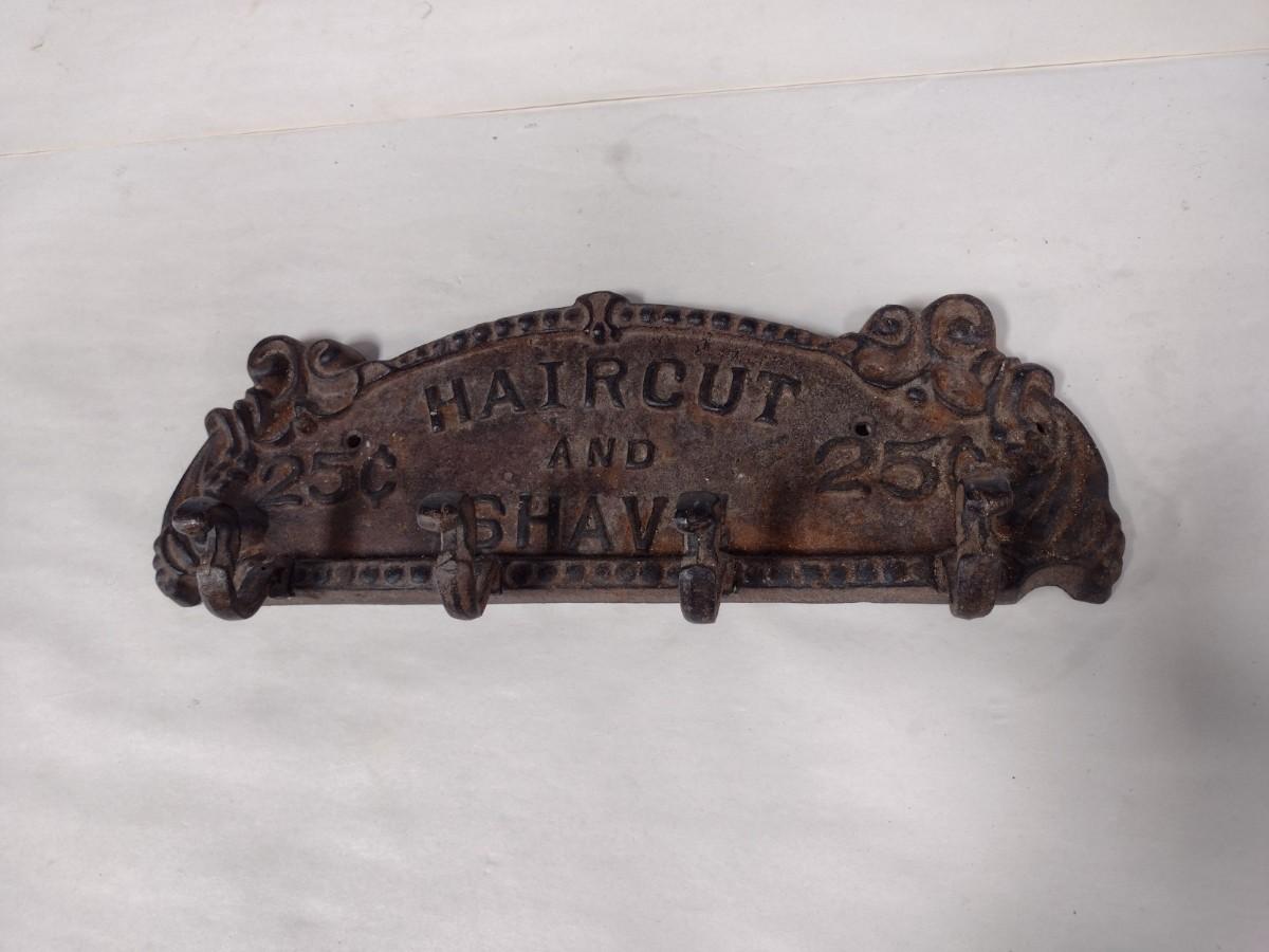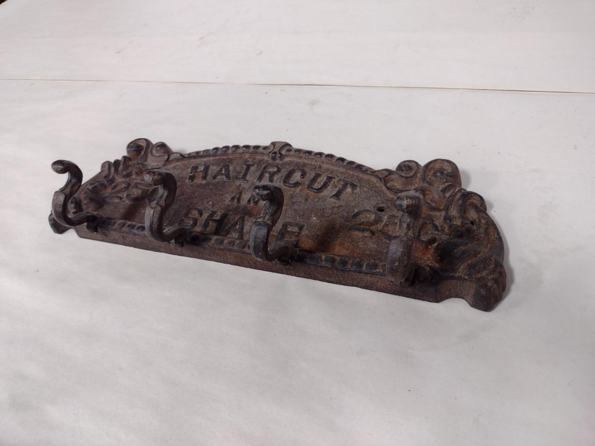 Vintage Cast Iron 'Hair Cut and Shave 25 Cents' Wall Plaque and Coat Hanger