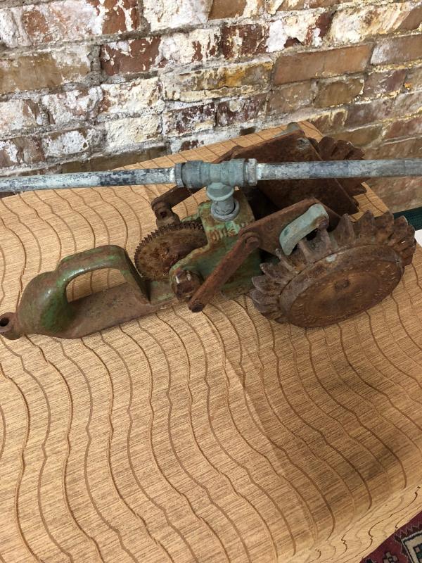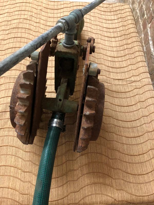 Cast iron lawn sprinkler, as-is I think it is missing a wheel on the front. Can be taken apart for shipping.