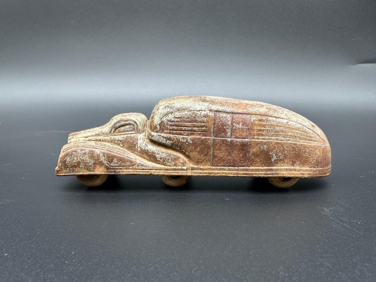 Vintage cast iron toy car with classic Art Deco streamlined styling. Solid, heavy construction with working rolling wheels. Molded body details include hood lines, fenders, and roof contours typical of 1930s–1940s design influence.