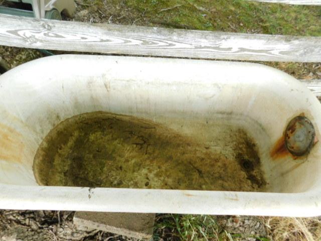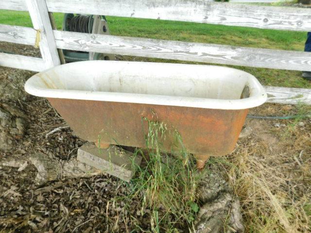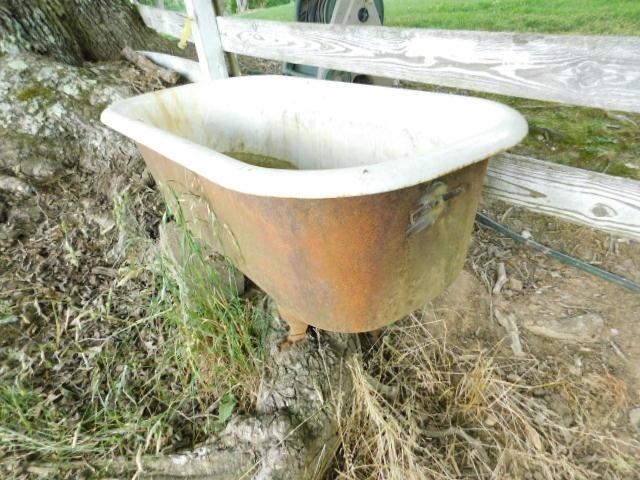 Vintage Cast Iron Tub 58" has one leg missing. Has been stored outside. Will need to bring proper moving equipment to take to vehicle
