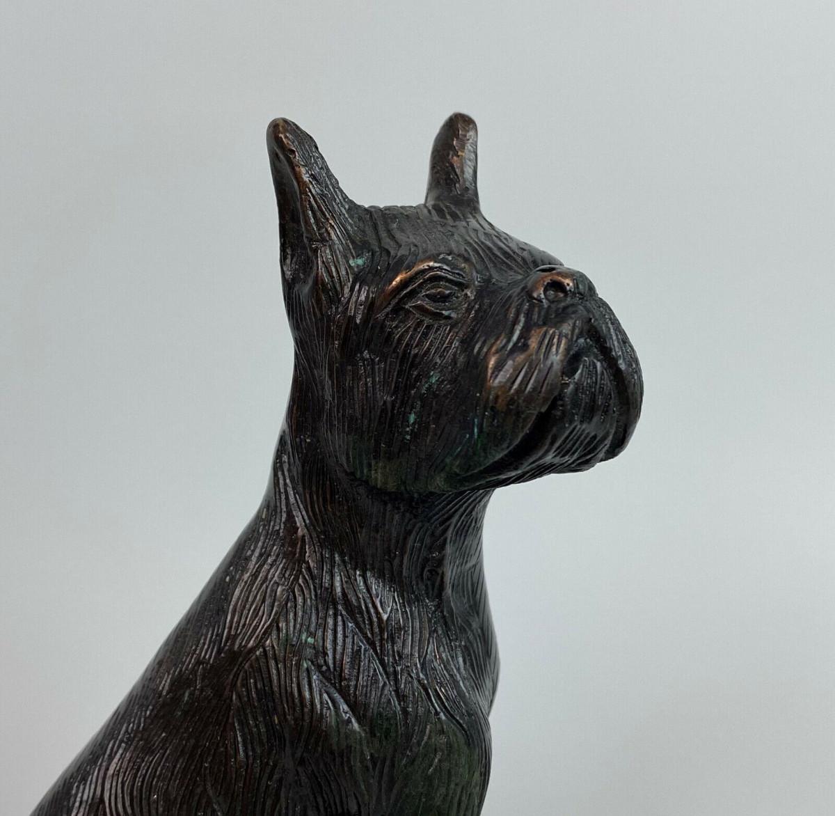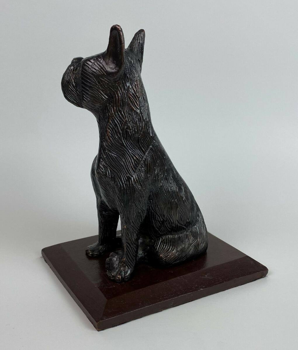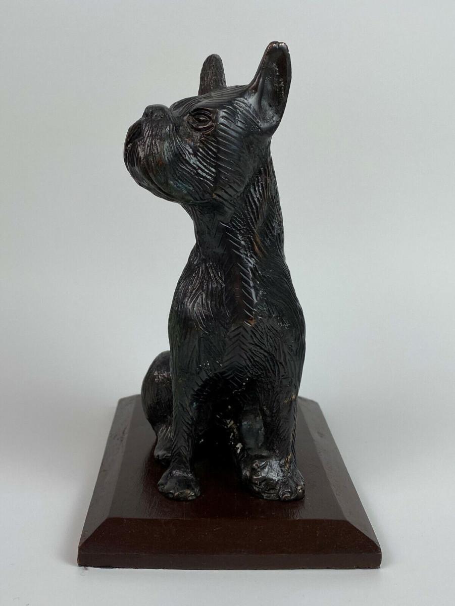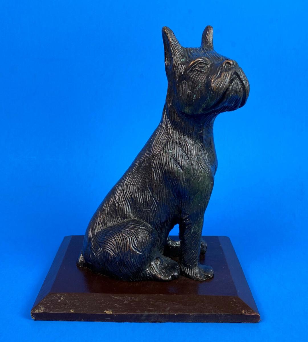 7" tall cast spelter dog statue attached to a 5.5" x 4" painted wooden plinth...Light age wear...Light bronze finish...Detailed..SAppears to be in the Terrier line?...As shown..Unknown foundry..Pre-1950 I believe...Felt bottom.