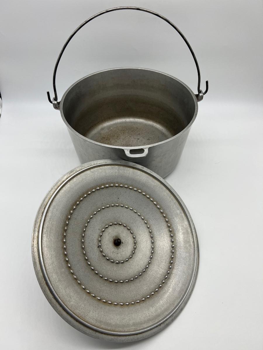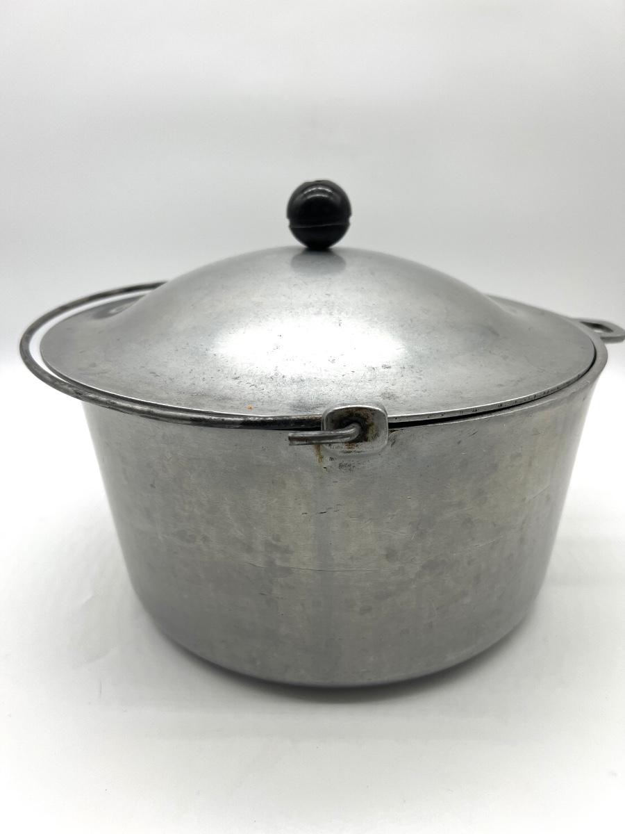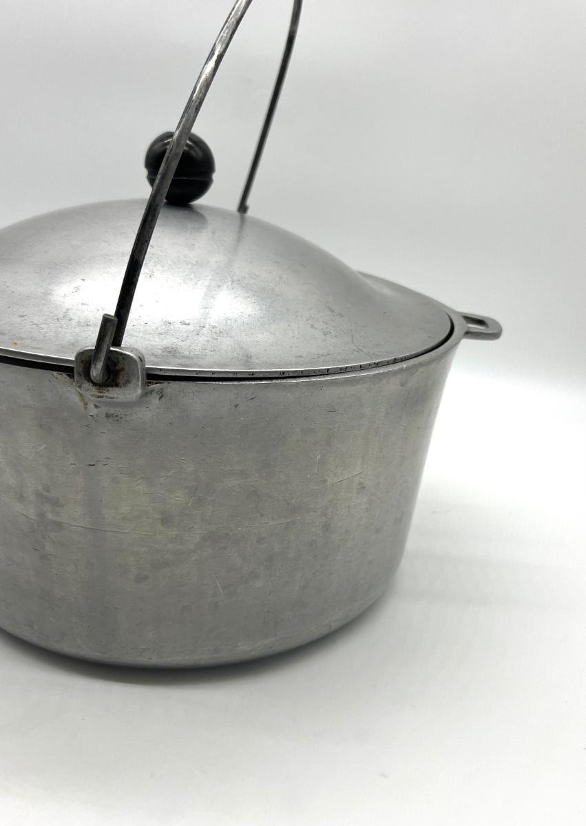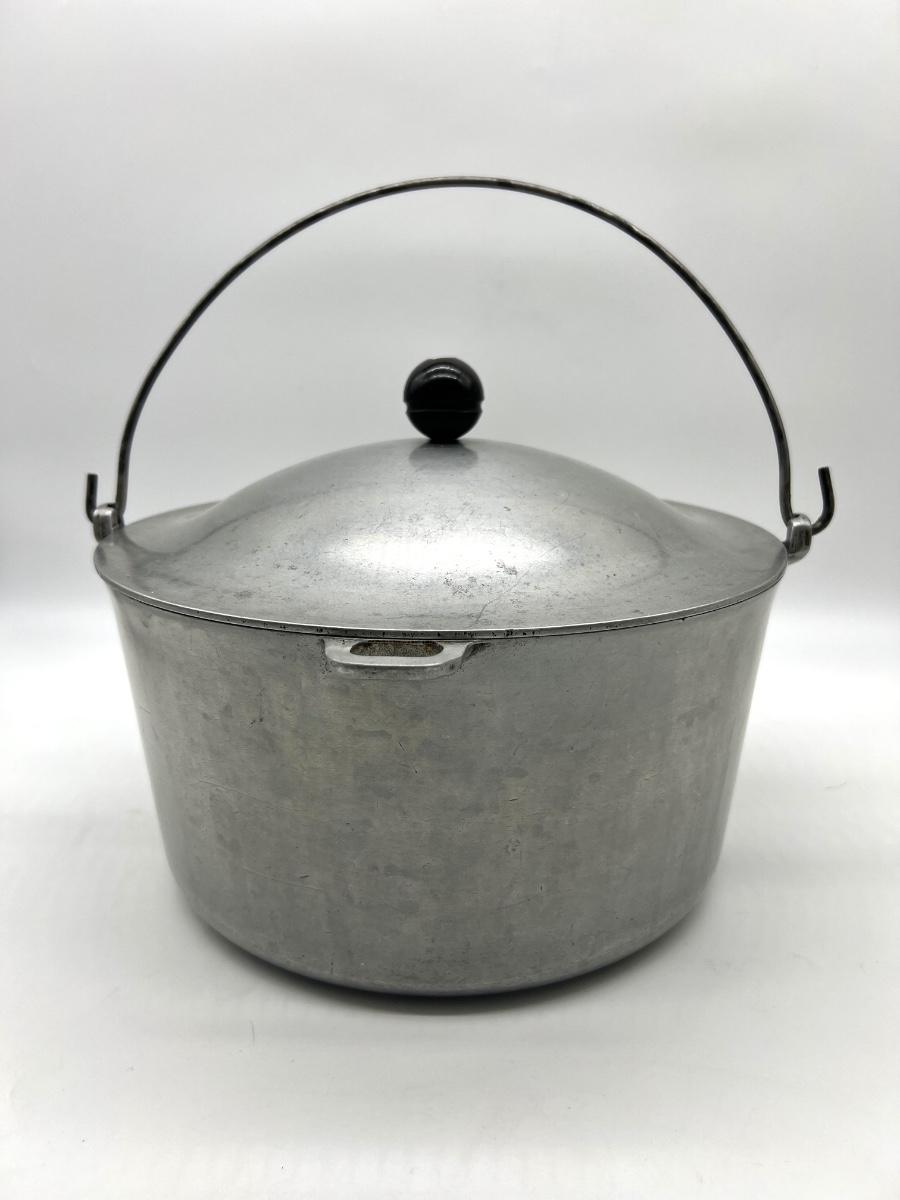Vintage Aluminum Dutch Oven Stock Pot With Bail Handle. Measures at its tallest 10 inches. Pot only measures 12 inches round and 6 inches deep.