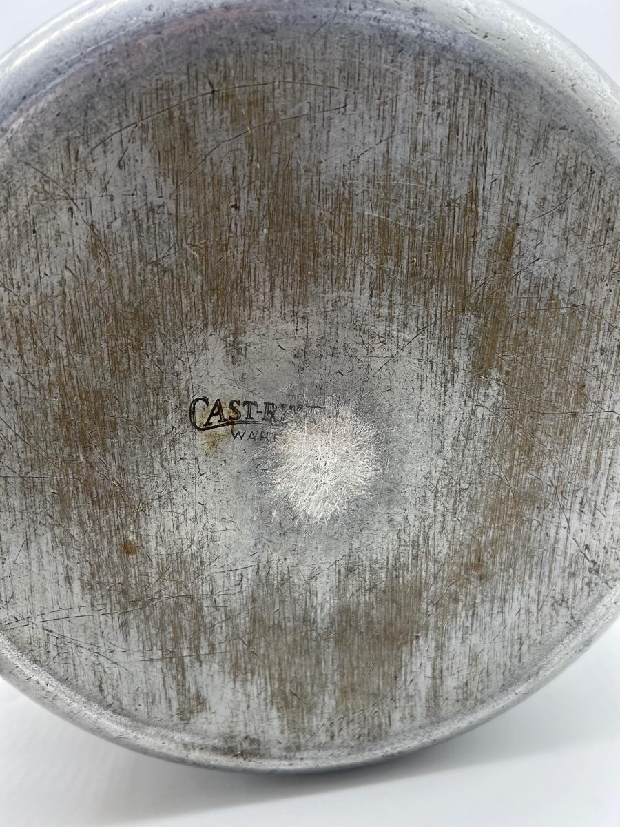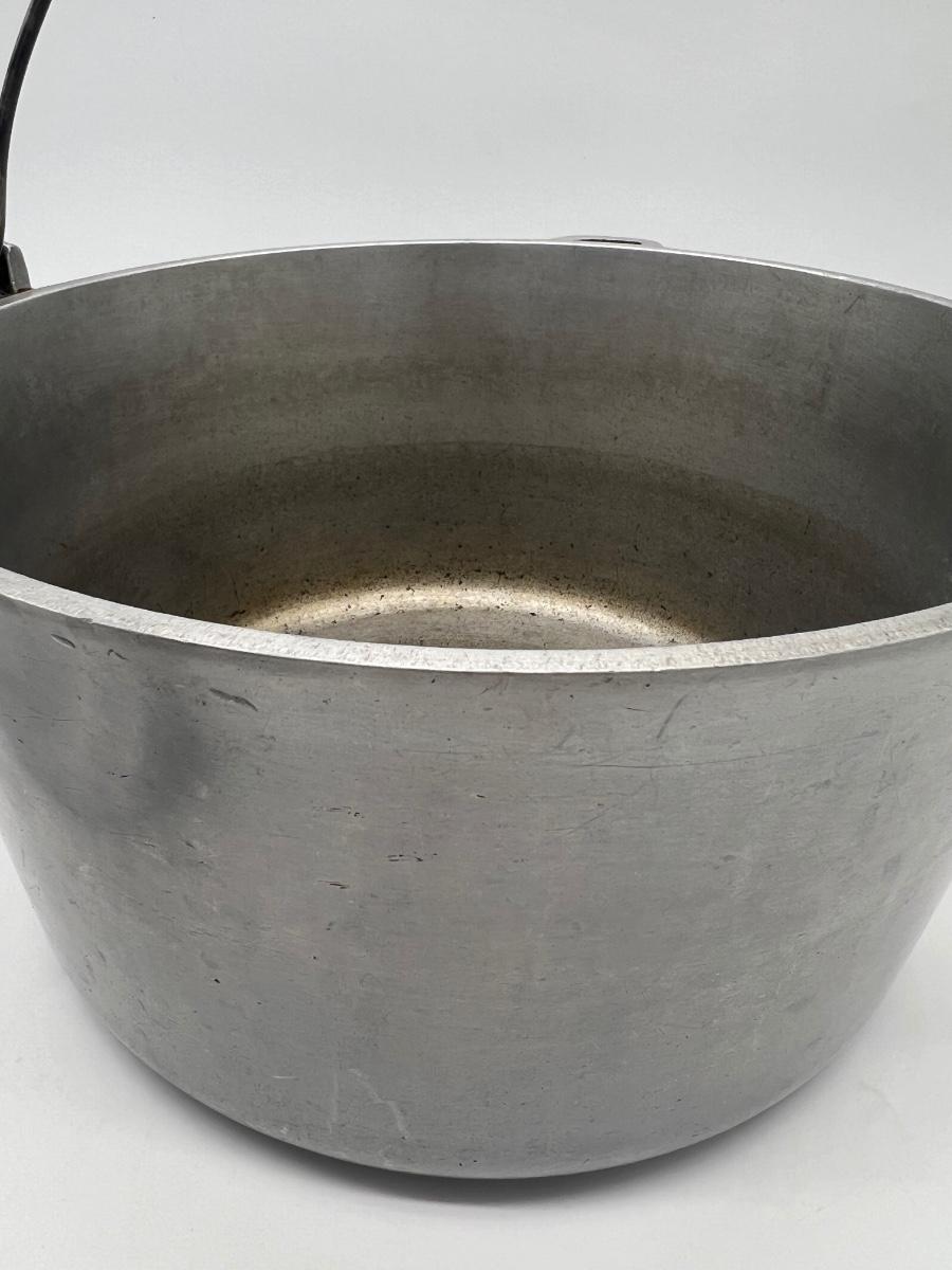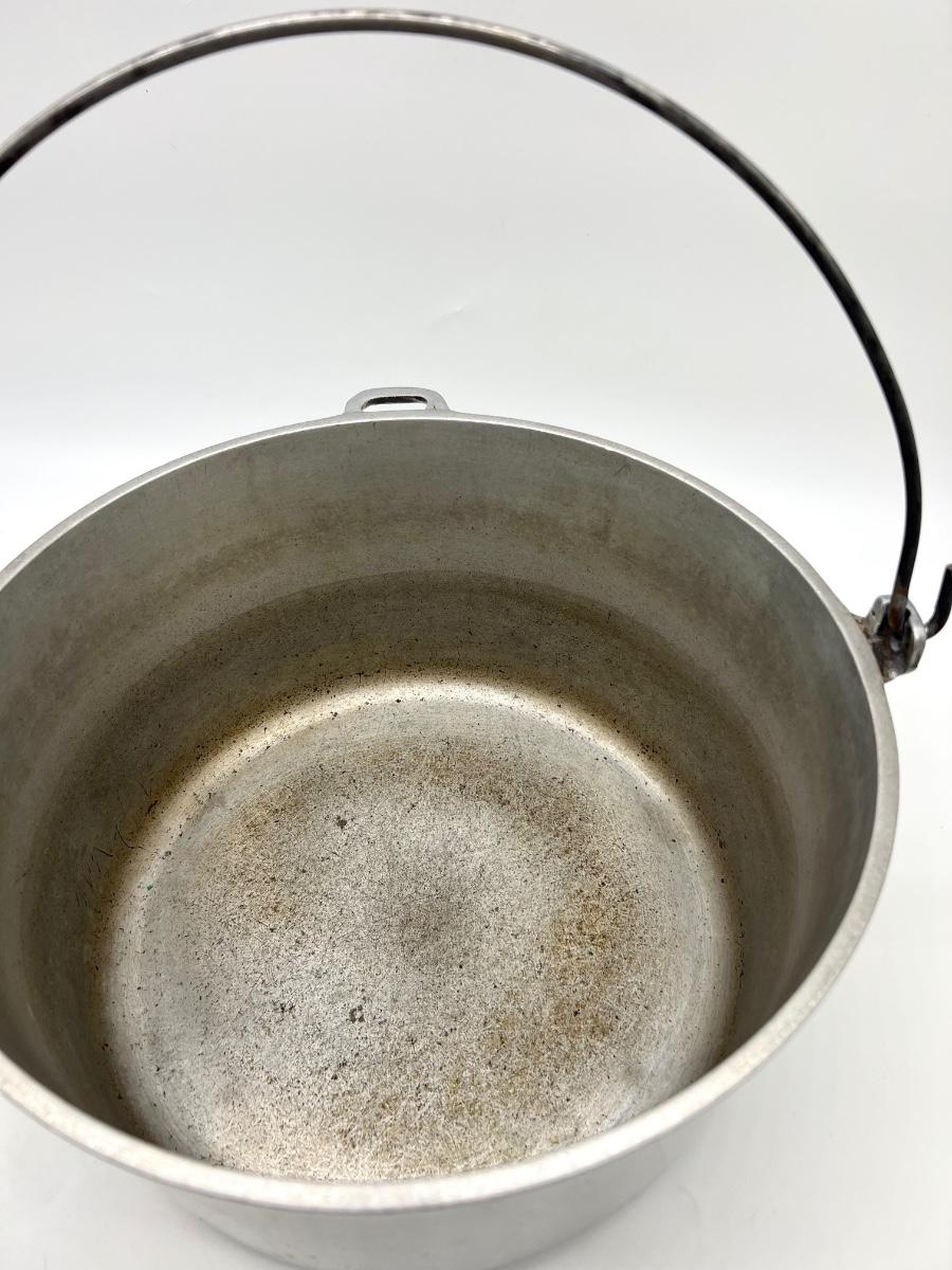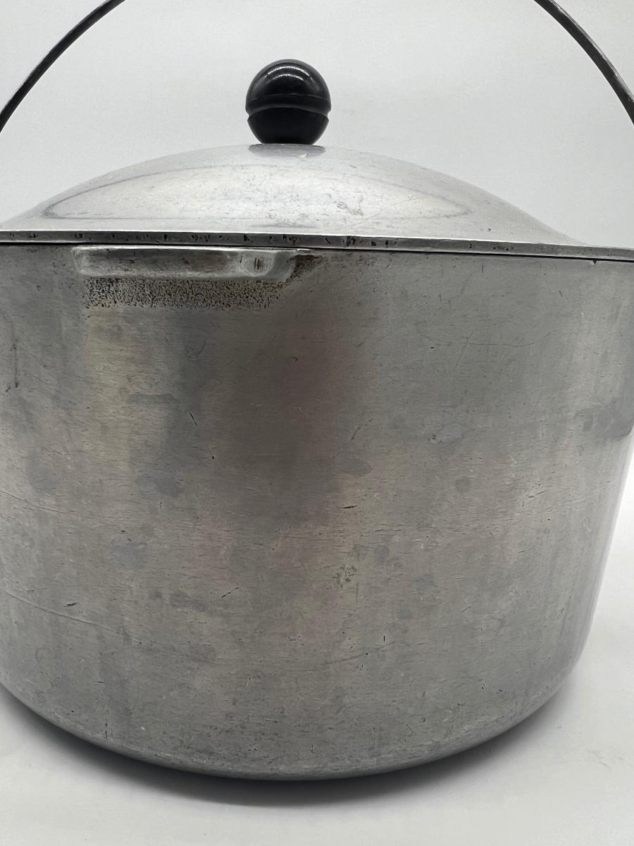 Vintage Aluminum Dutch Oven Stock Pot With Bail Handle. Measures at its tallest 10 inches. Pot only measures 12 inches round and 6 inches deep.