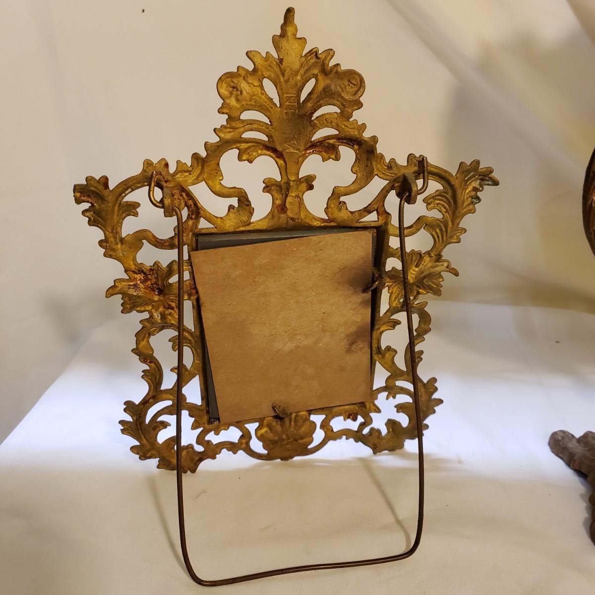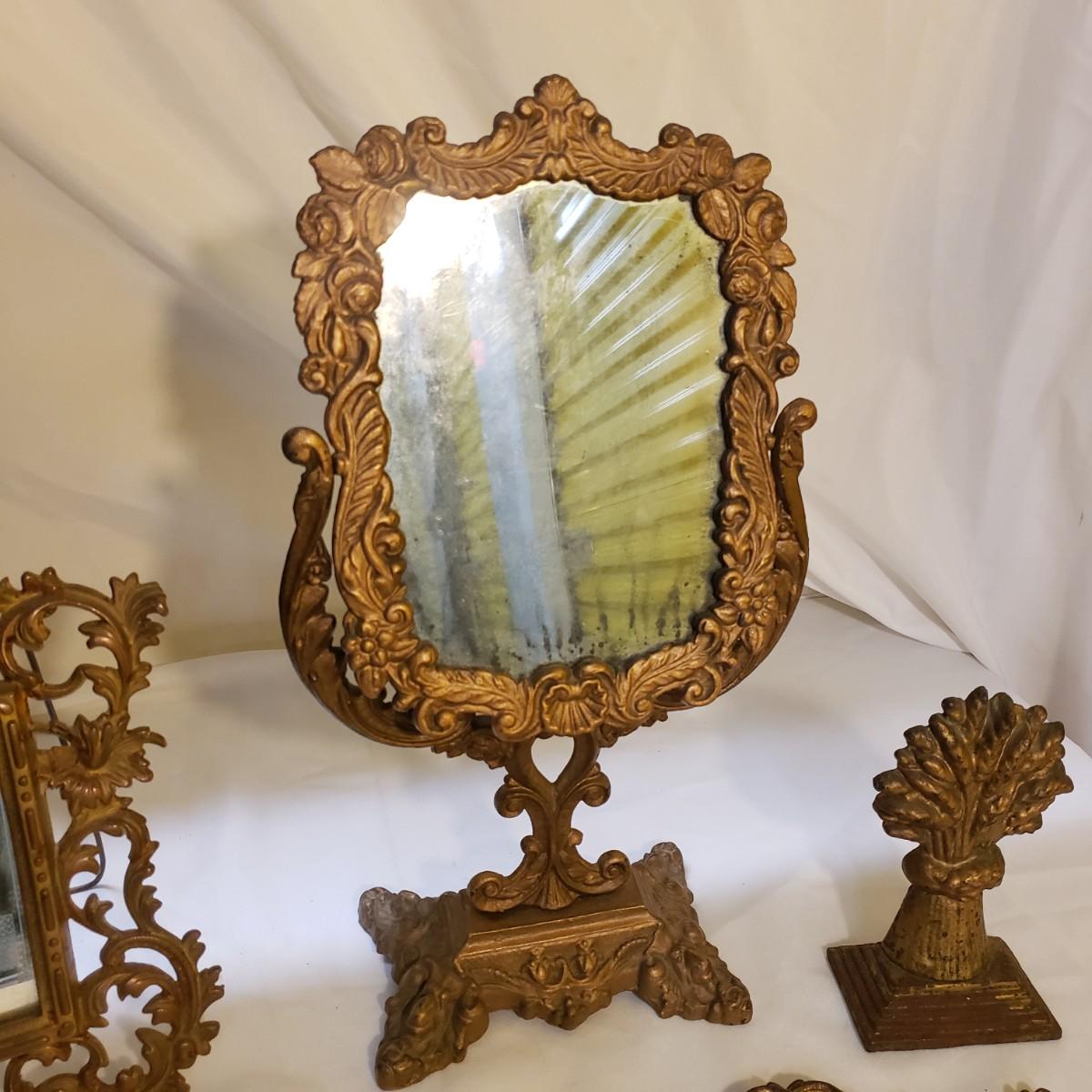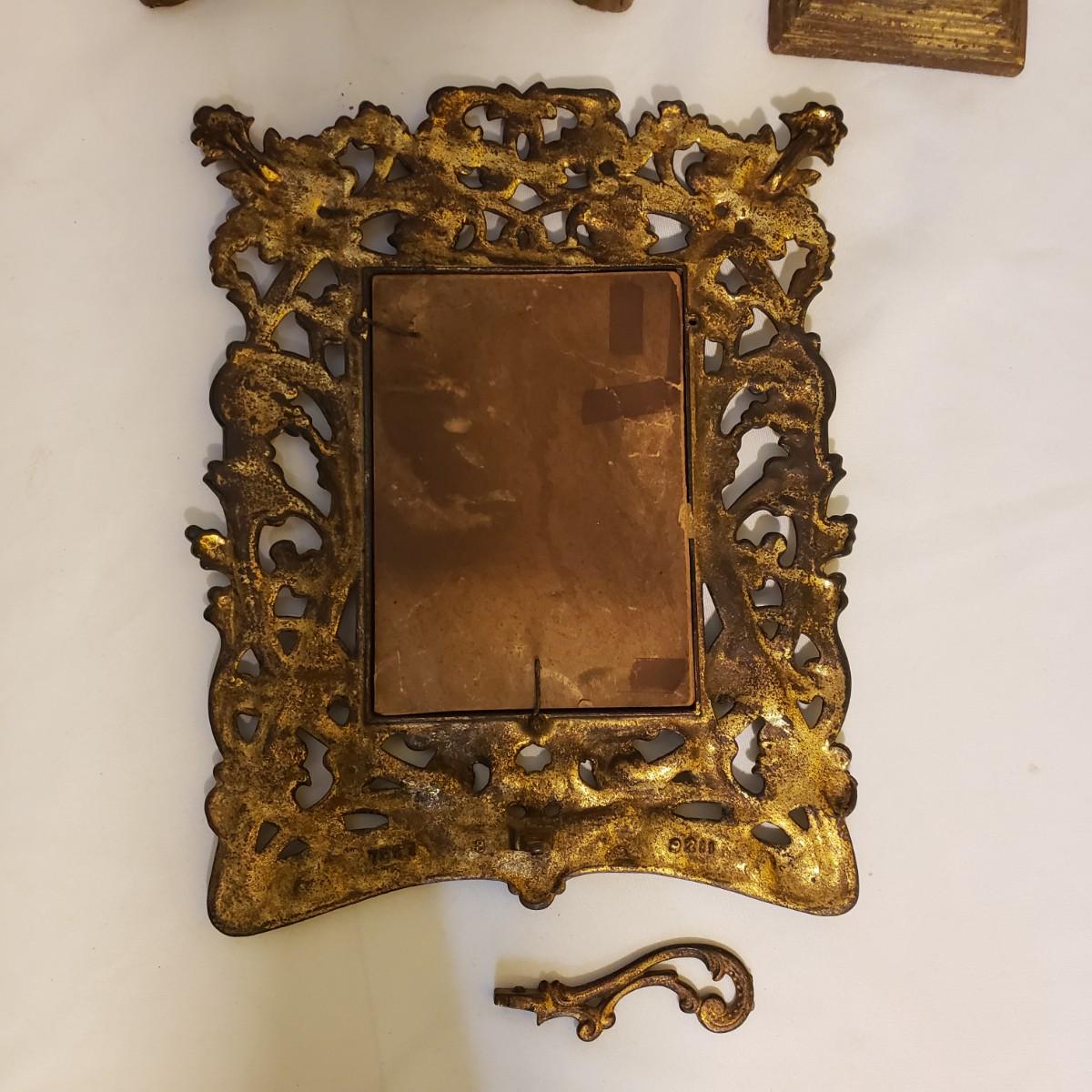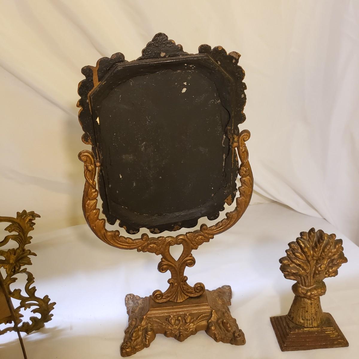 All these pieces are made from a casted metal. The frame with the pull out stand in the back of it measures 9"x13". The other frame measures 9.5"x17" has a broken stand on the back of it as seen in the pictures. The adjustable mirror on a stand measures 9.5"x17". The mirror itself has some black marks on it as seen in the pictures. The wheat door stop measures 4"x7". All pieces are also heavy, which will affect shipping costs.